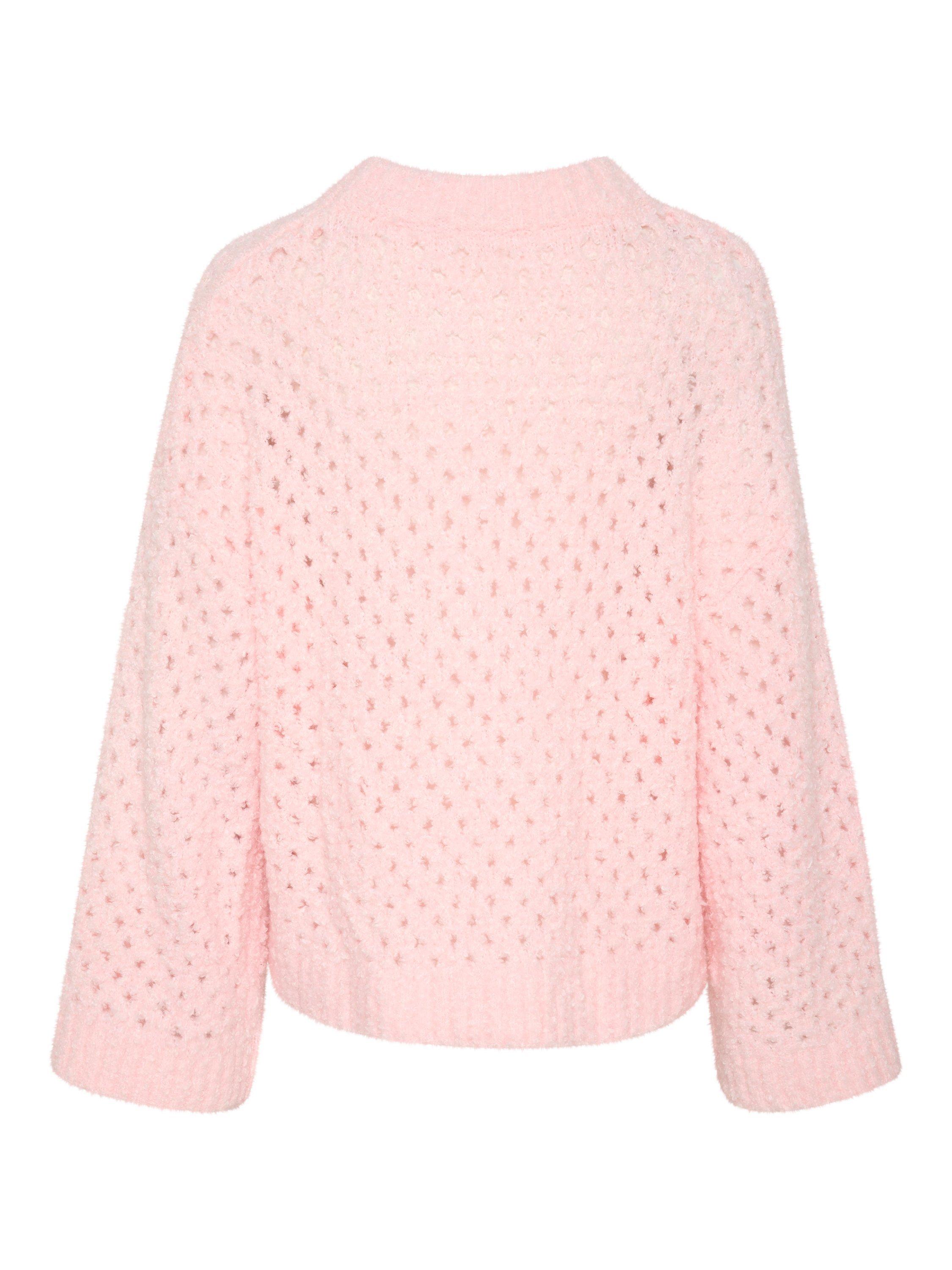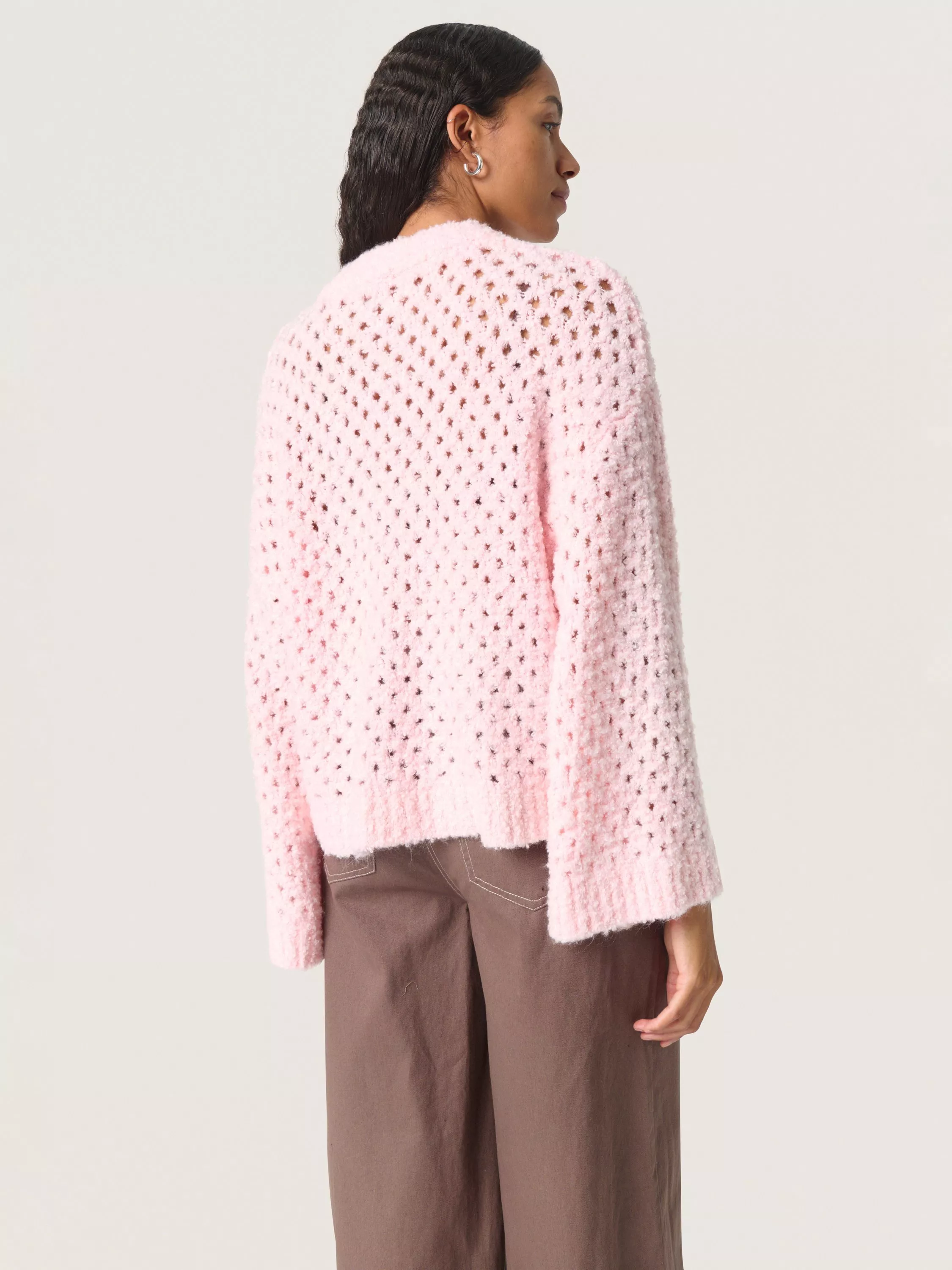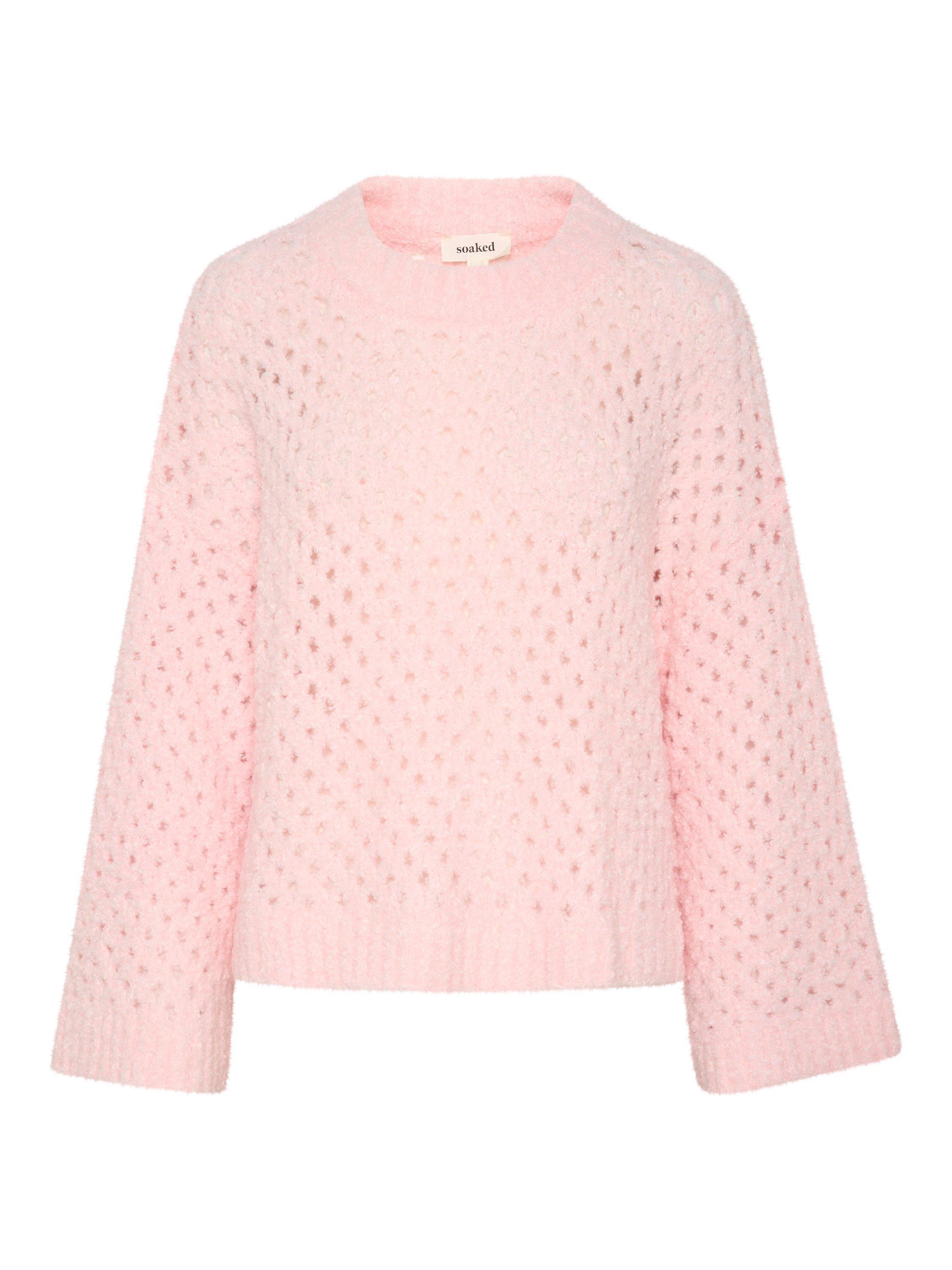 The SLBabbette pullover is a relaxed and cosy style made in a hole knit fabric with rib edges. It has a slash neck and a casual fit with drop shoulders, and it is cut at the hips. The sleeves come down below the wrists, and they have a wide fit.