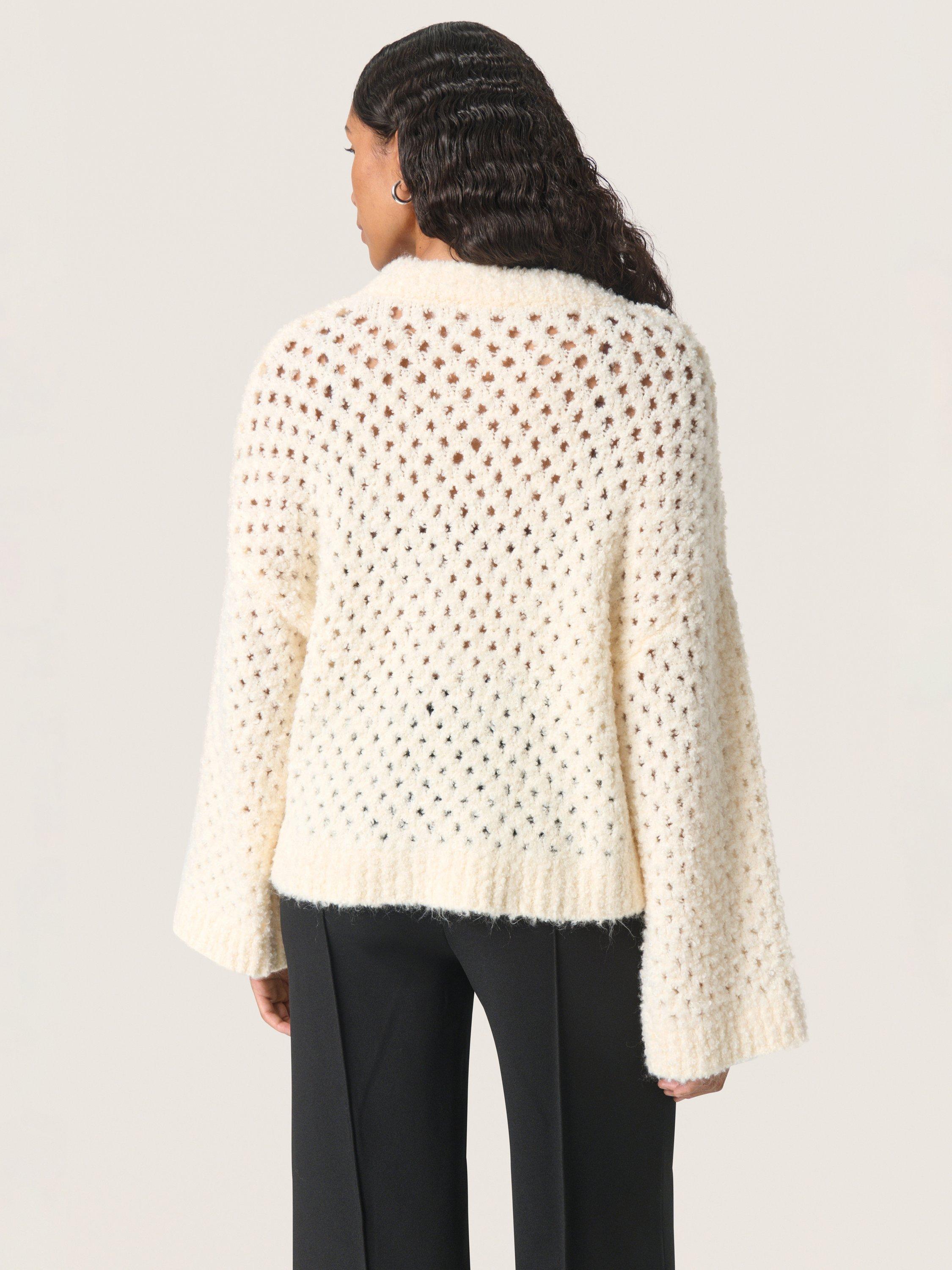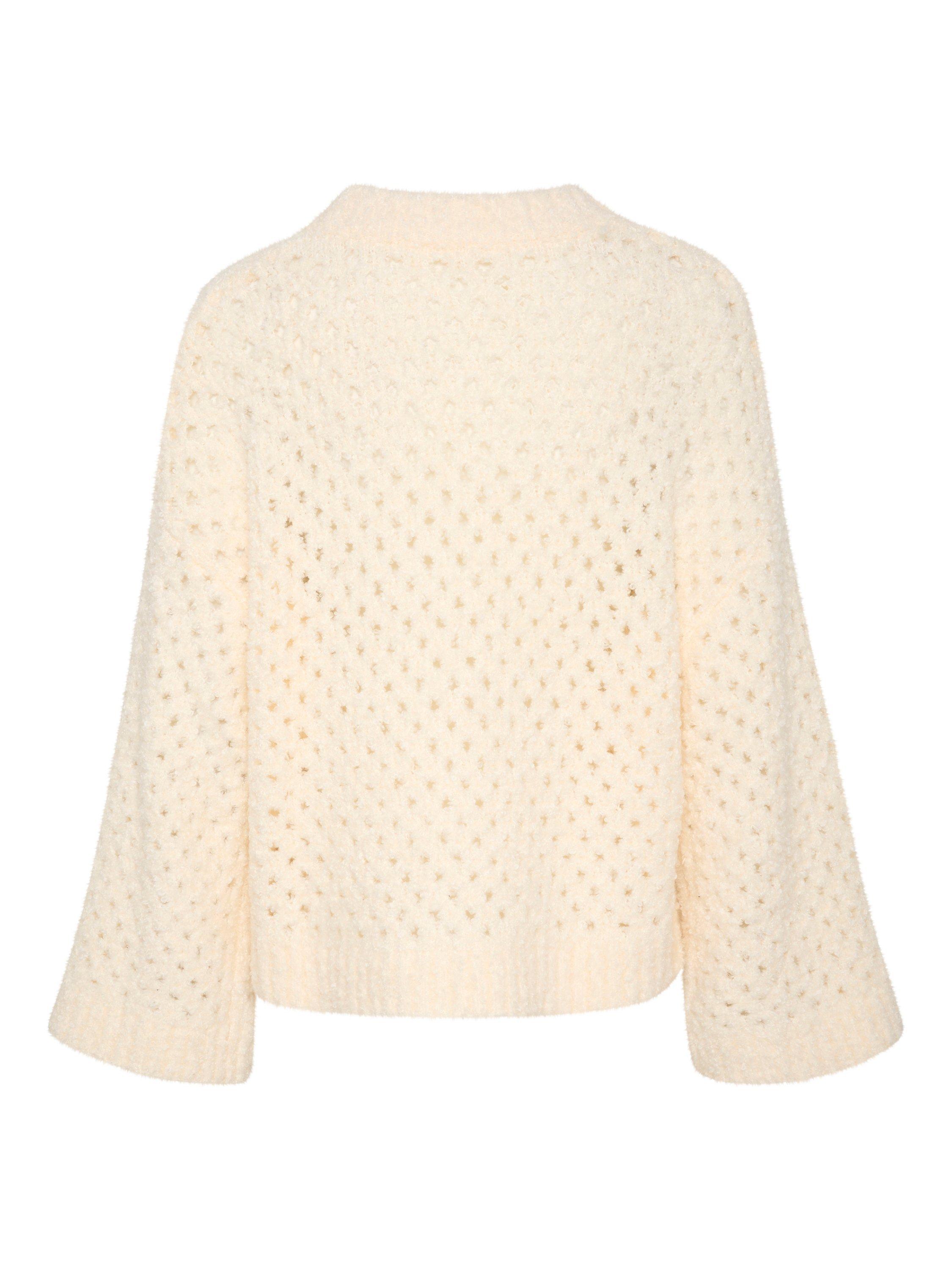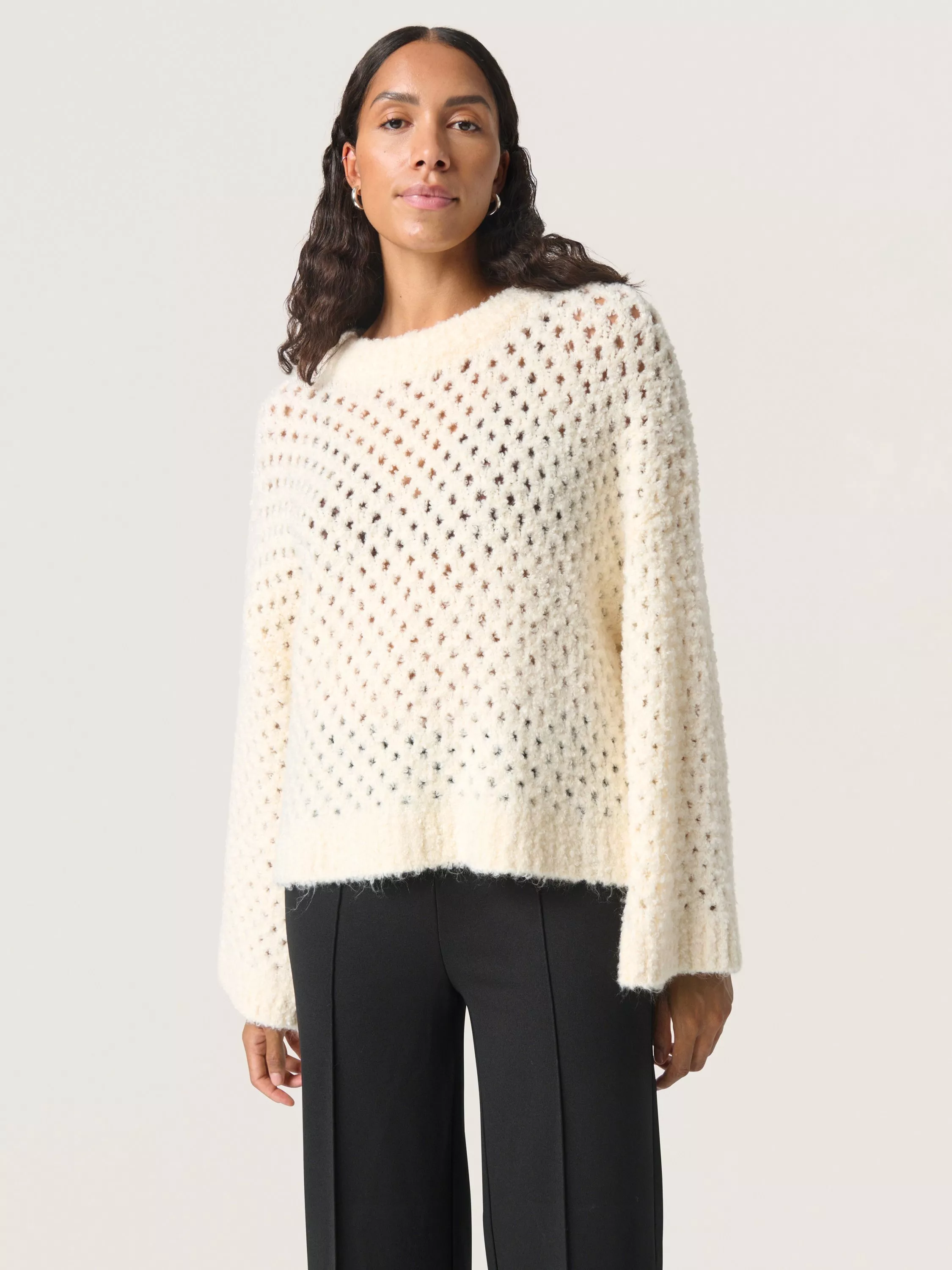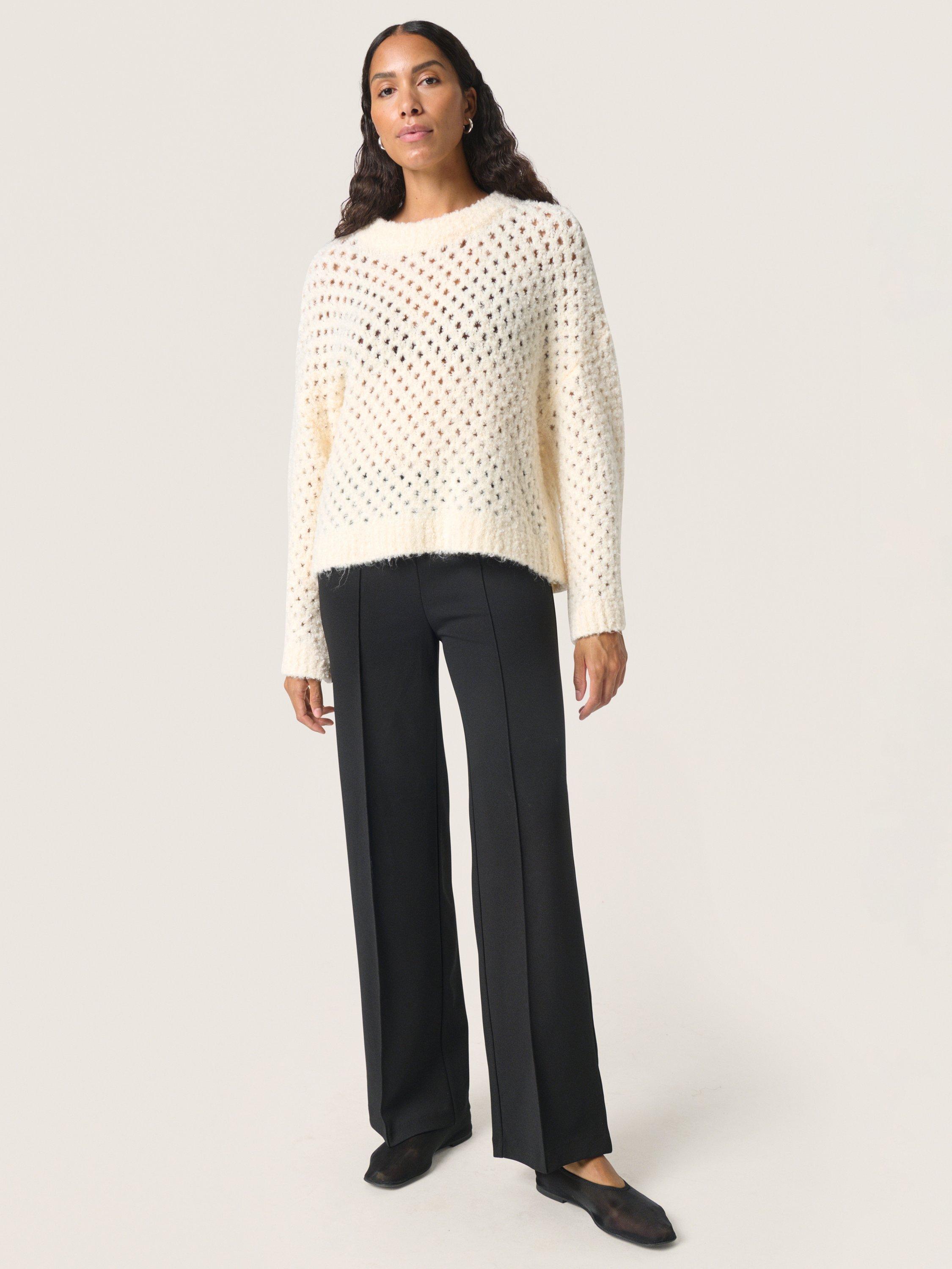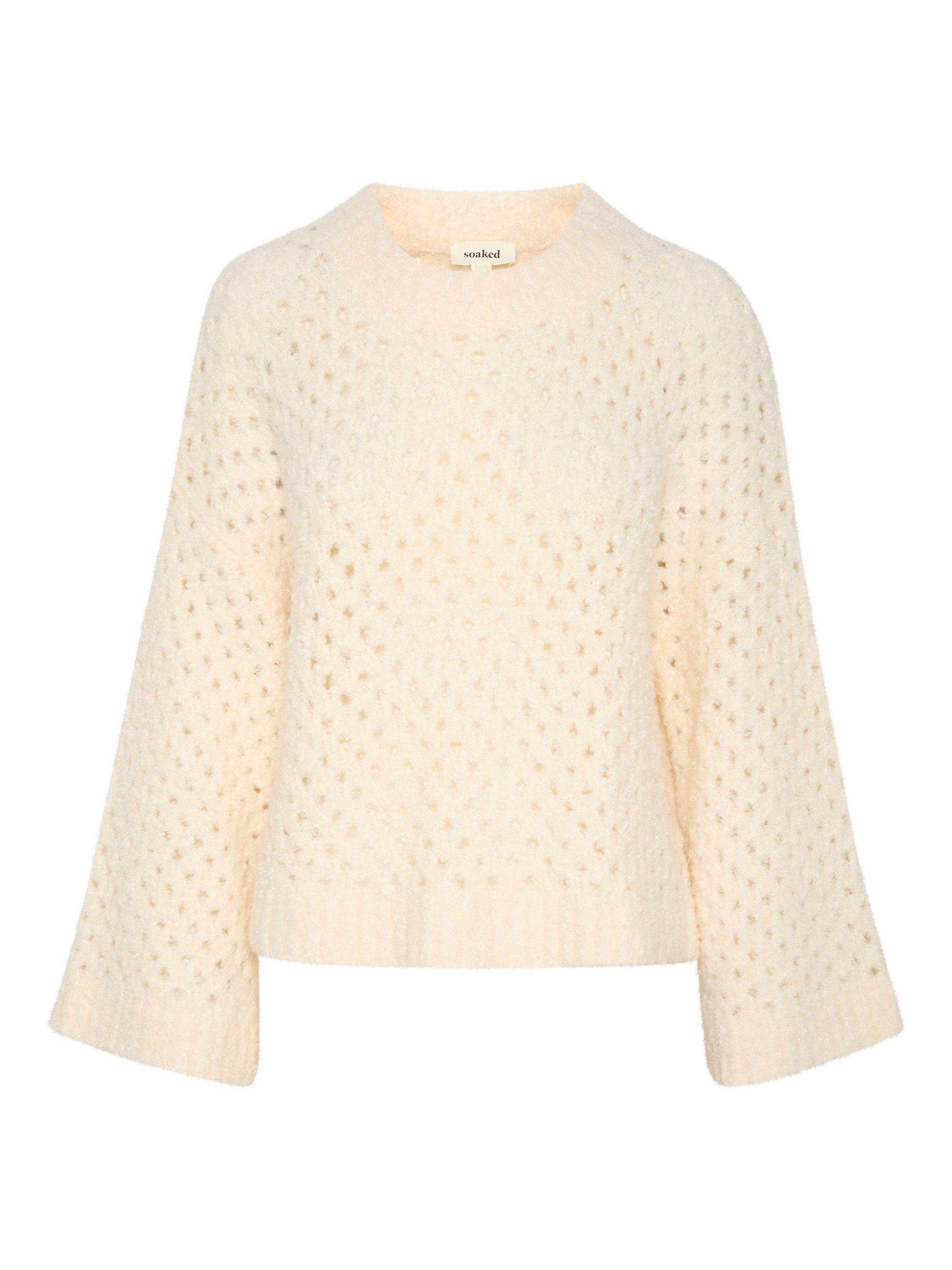 The SLBabbette pullover is a relaxed and cosy style made in a hole knit fabric with rib edges. It has a slash neck and a casual fit with drop shoulders, and it is cut at the hips. The sleeves come down below the wrists, and they have a wide fit.