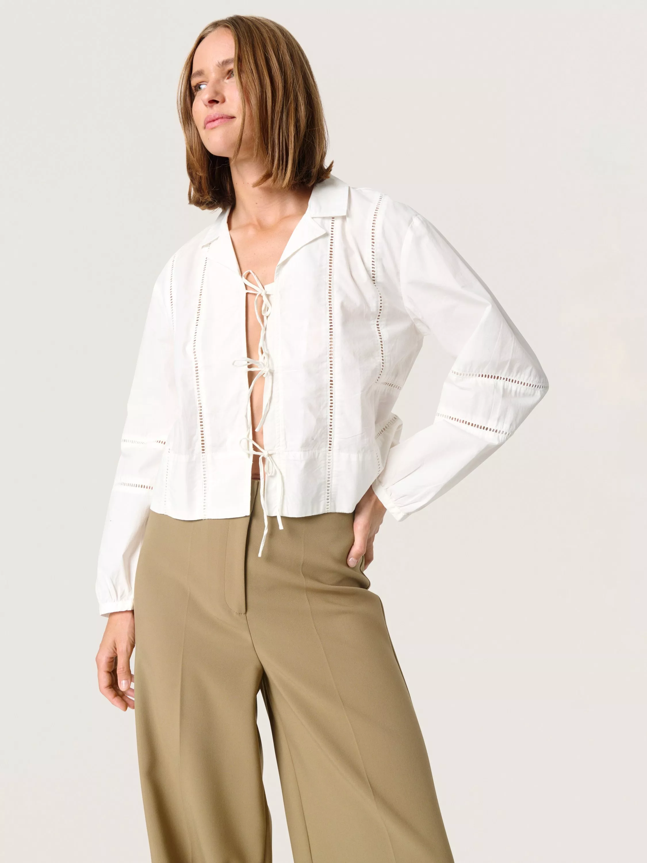The SLCalico blouse is a cool top with endless styling options. It has a notch collar and tie fastening, and it has a casual fit. The blouse is made in a light fabric with ladder lace insets, and it has long sleeves with a loose fit and narrow cuffs.