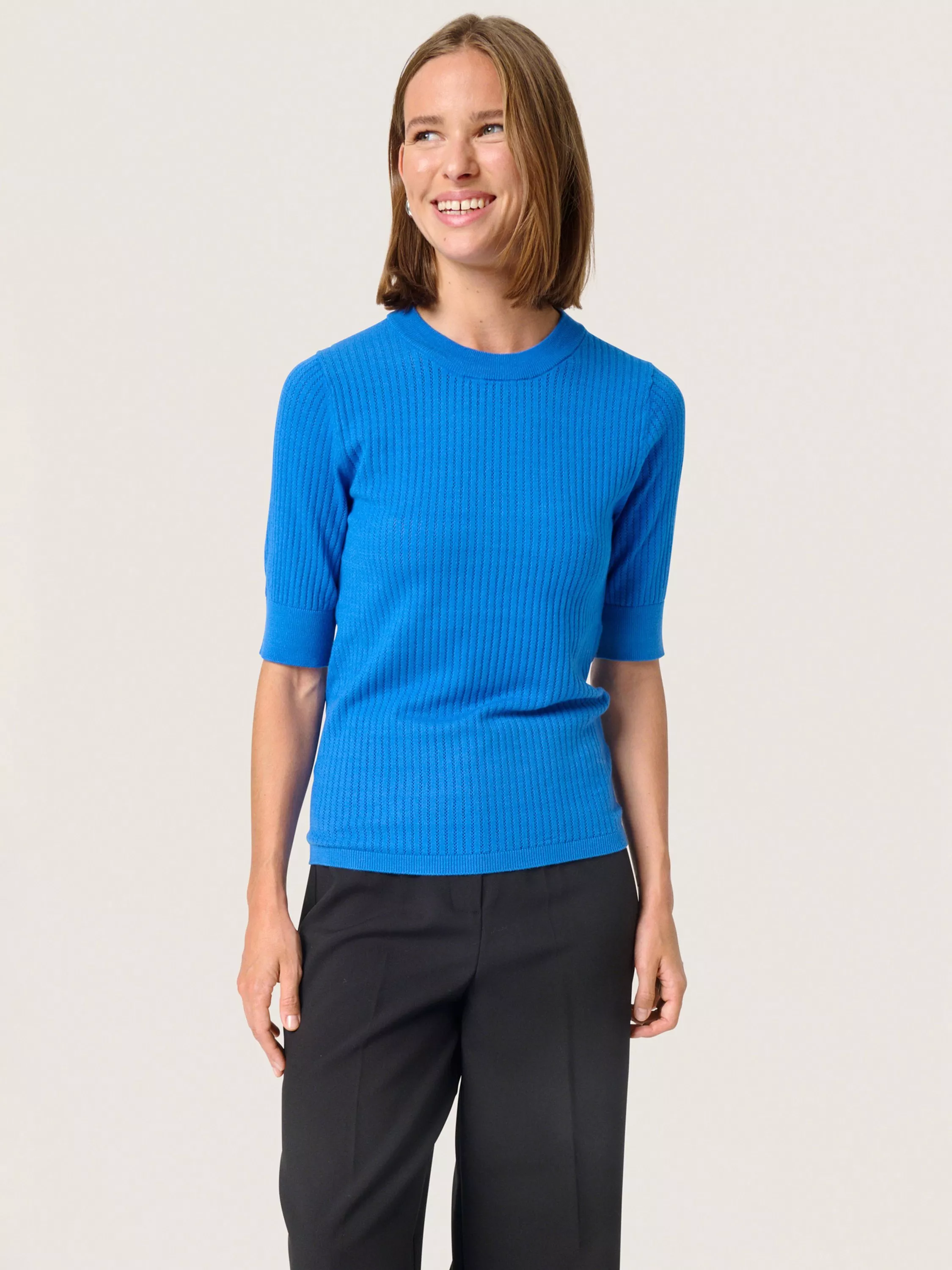 The Spina top is made in a soft and cosy rib knit fabric, and it is the perfect addition to the seasons everyday outfits. The knitted T-shirt has a slim fit and short sleeves that are cut right above the elbows. The Tee has a simple crew neck, and it is cut at the middle of the hips.