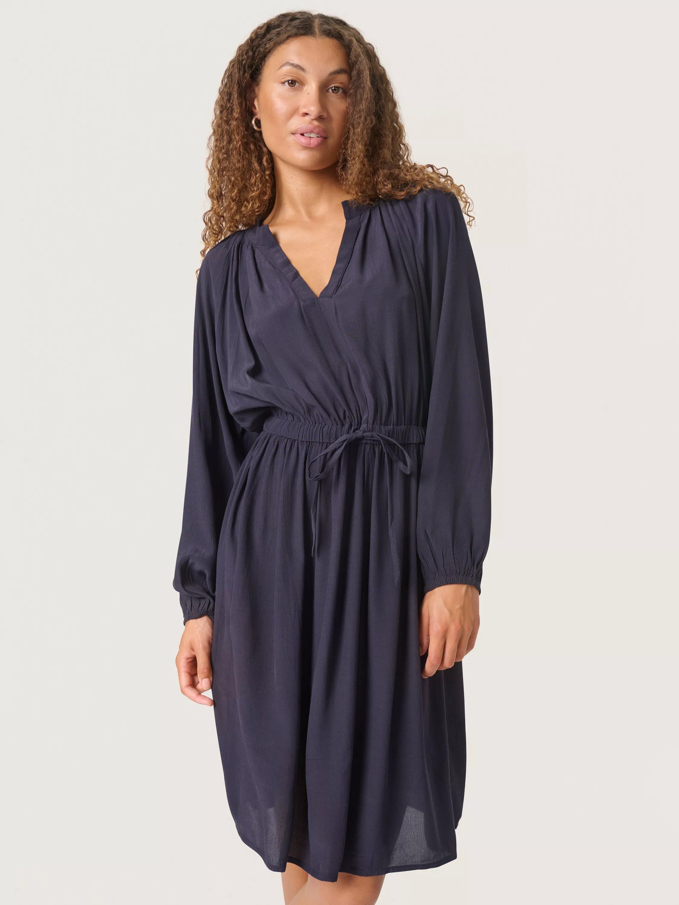 The Valize dress is a feminine and flattering style, that you can wear on any occasion. It has a V-notch neck and a regular fit with an elastic drawstring waist. The sleeves are long raglan sleeves with a loose fit and elastic sleeves edges. The dress is cut at the knees, and has a flared skirt.
