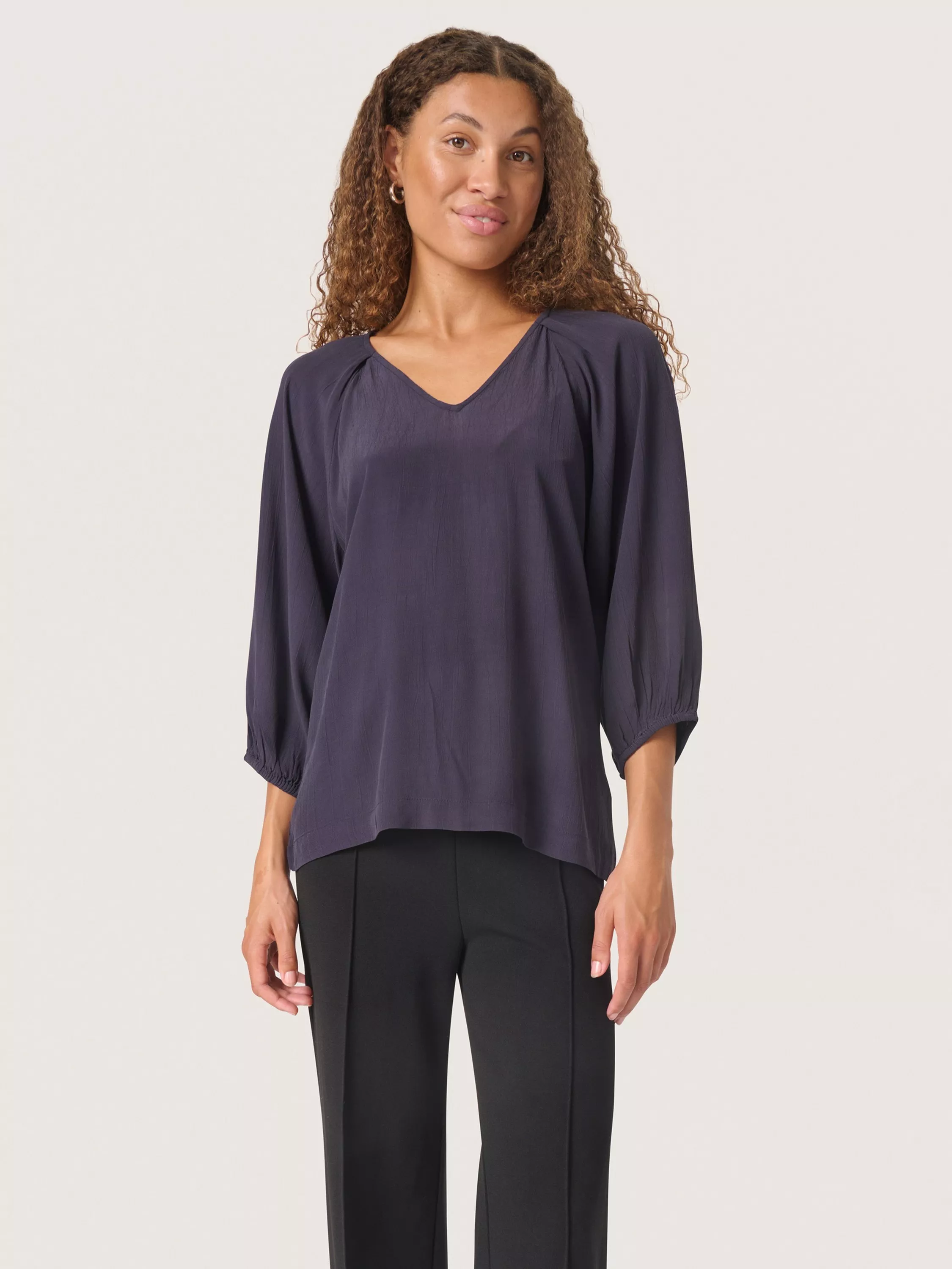 The Valize blouse is a simple and versatile top, that will add a feminine touch to any outfit. It has a V-neck and a casual fit, and it has a rounded hem. The sleeves are 3/4 length raglan sleeves with a voluminous fit and elastic edges.