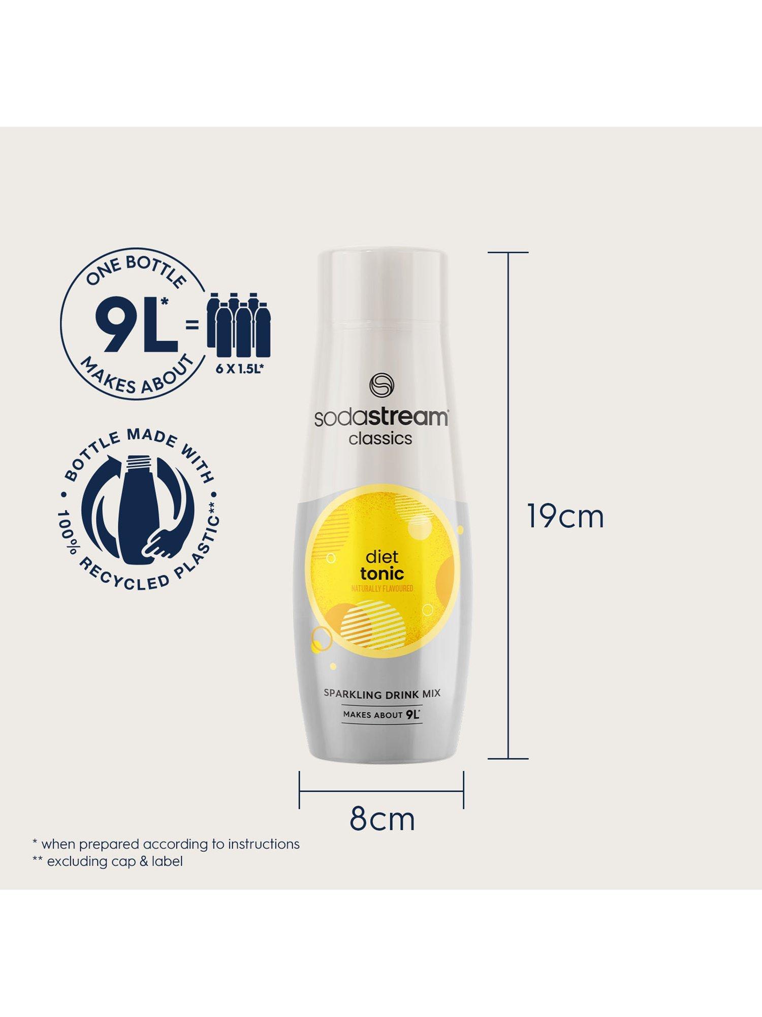 With SodaStream Classics Diet Tonic you can make fresh, bubbly drinks anytime, simply, quickly and exactly to your taste. Each 440ml bottle makes up to nine litres of Diet Tonic with your SodaStream fizzy drinks maker so you have plenty of flavoured sparkling water available to drink while taking up minimal storage space. This Diet Tonic has 50% less sugar than store-bought soda and no high-fructose corn syrup or aspartame. It's perfect as a mixer for cocktails.