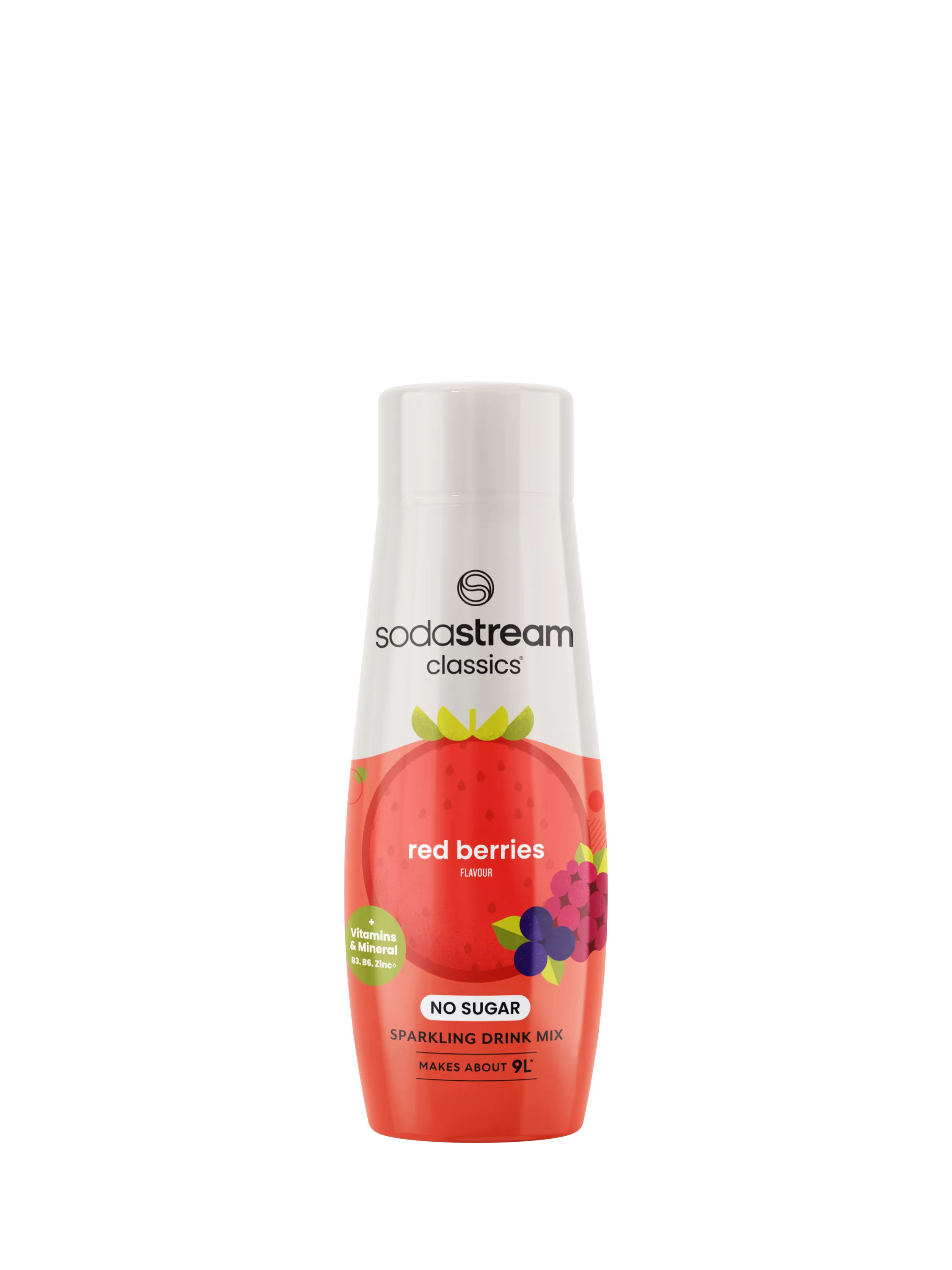 Bring fun and joy to your sparkling water experience with SodaStream® No Sugar Red Berries. Perfectly refreshing any time of day, this Classics drink mix brings fun and freshness to sparkling water for a personalised experience at home. Low in calories, with added vitamins, zero sugar and a deliciously fruity flavour.