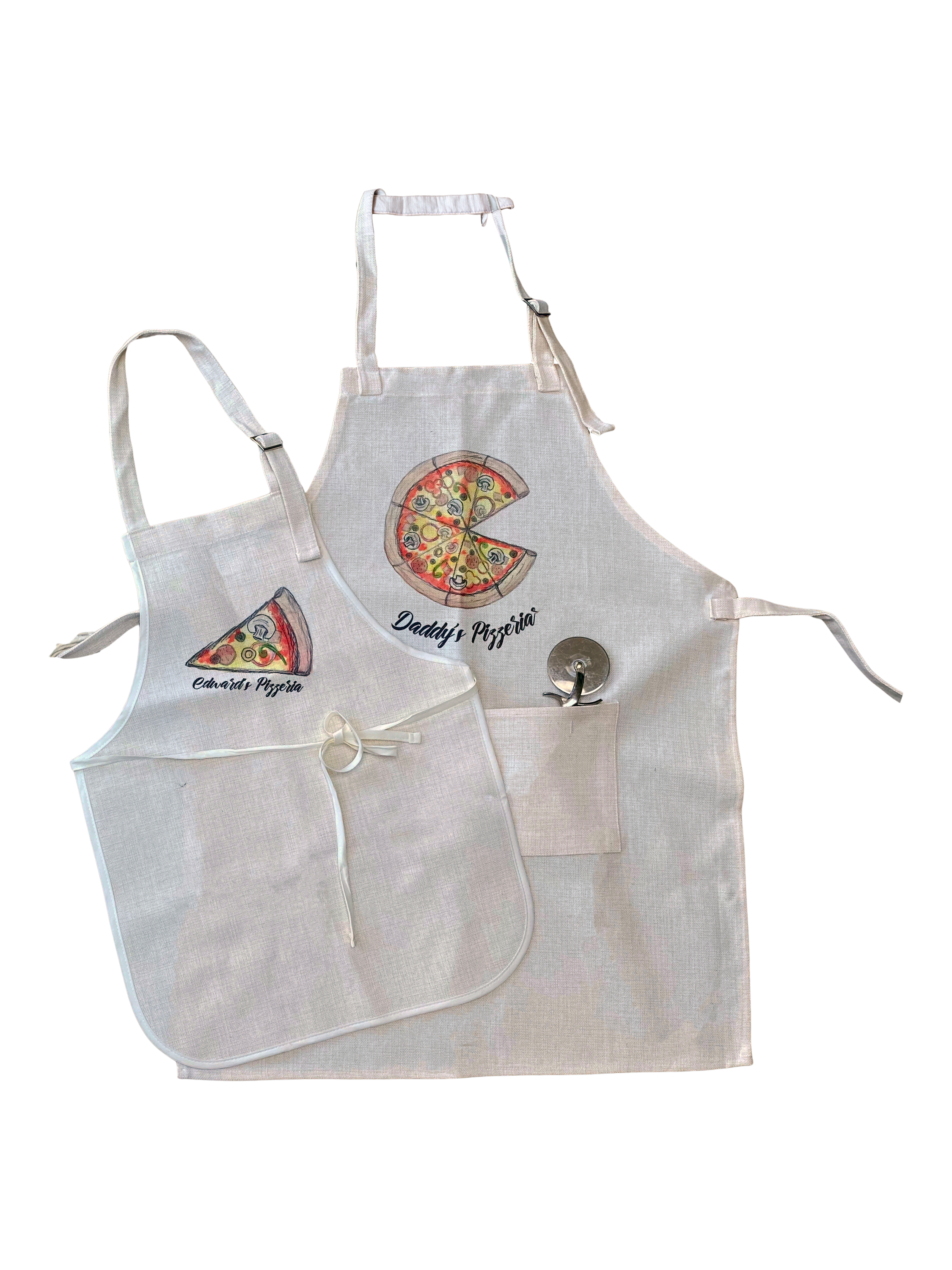 Personalise the aprons with a name on each, and choose up to three matching children's aprons with corresponding slices removed from the adult pizza.