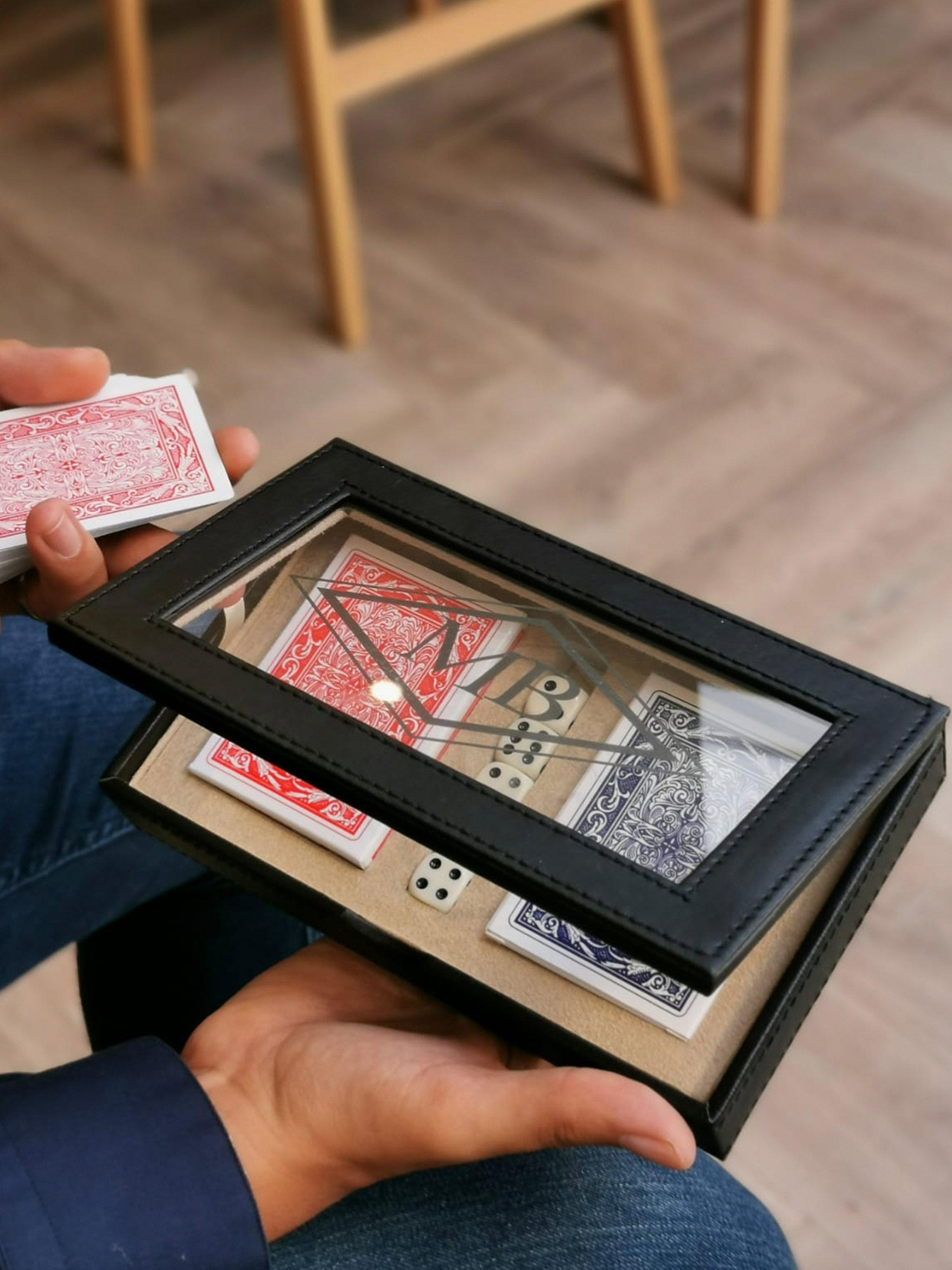 A stylish personalised monogrammed cards and dice game set, this personalised game set has two sets of cards and 5 dice. With the option to personalise with charcoal lettering this makes a perfect gift for your, partner or competitive relative!