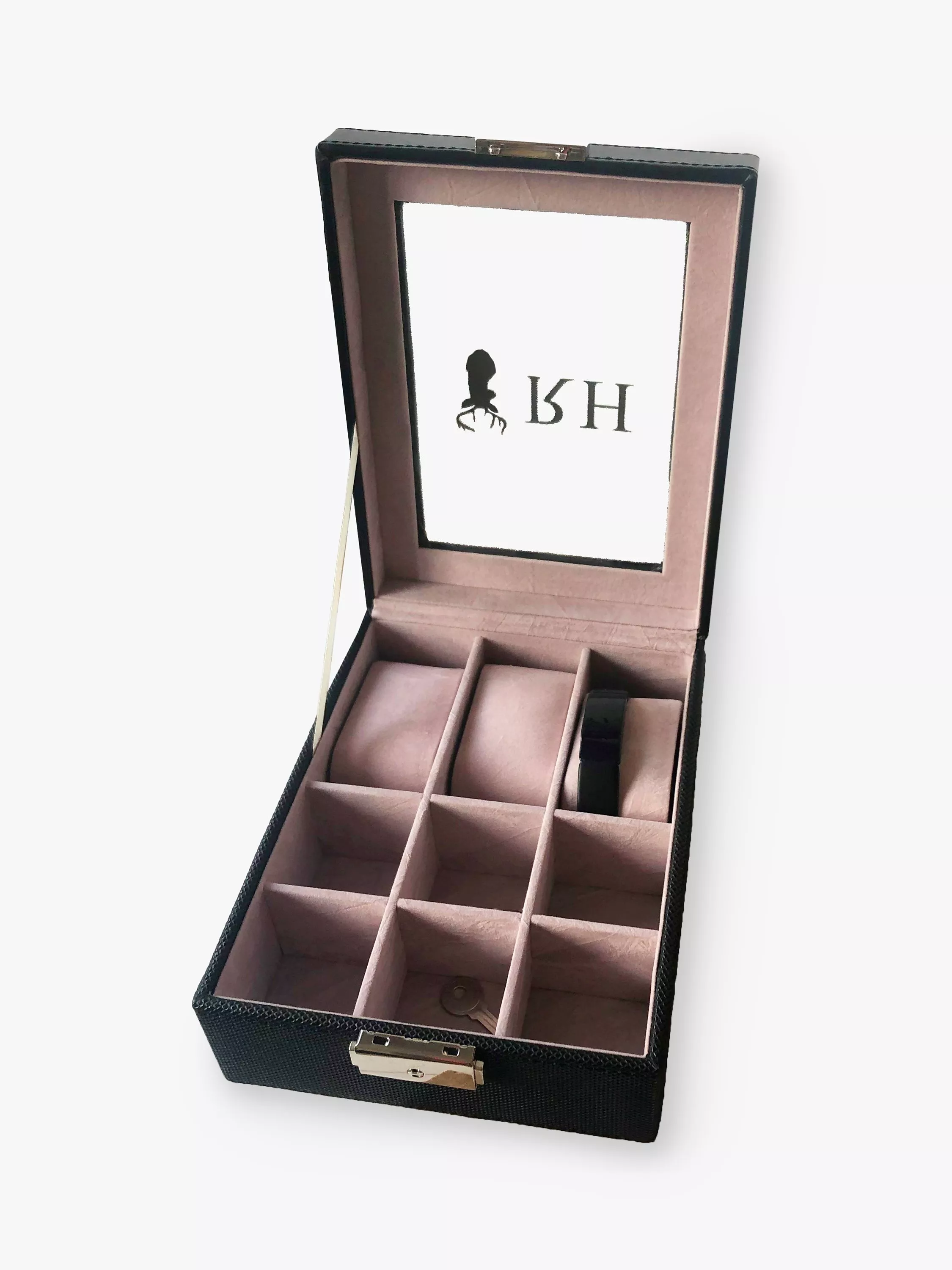 There is space for three watches and 4 separate compartments ideal for rings, cufflinks or small pieces of jewellery.This box can be personalised with initials and a choice of a stag symbol.