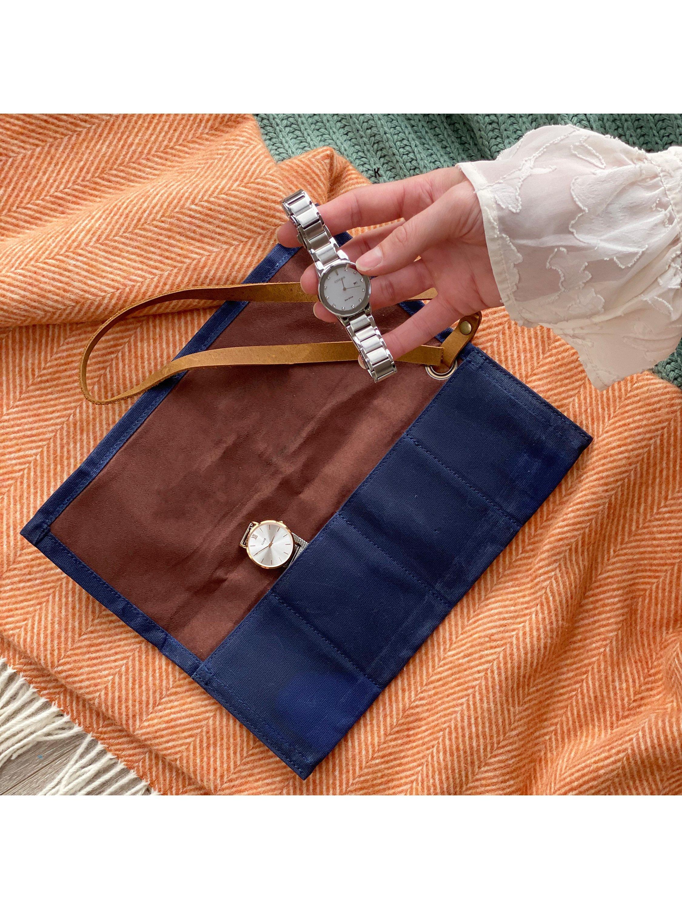 An elegant Personalised Watch Roll, a timeless gift for your accessory-loving partner or friend. This roll features four slots for watches and bracelets, making it a stylish alternative to traditional storage and perfect as a travel companion.