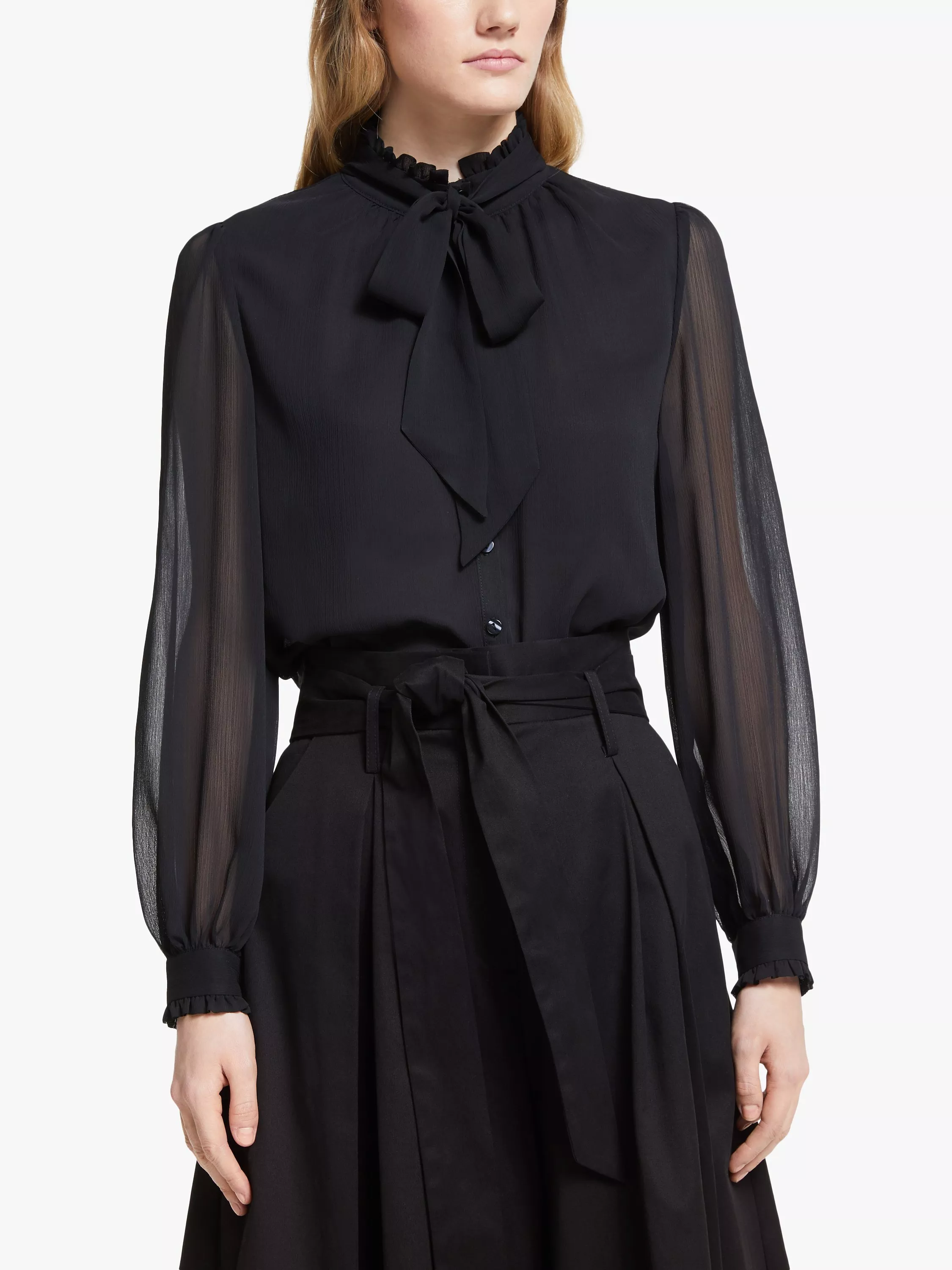 Taking the black blouse from basic to statement but always essential, this Somerset by Alice Temperley style offers decadent style with its tie neck and ruffle detail (matched at the cuffs), with sheer sleeves for a playful finish that looks great wither you tuck it into printed skirts or tailored trousers.