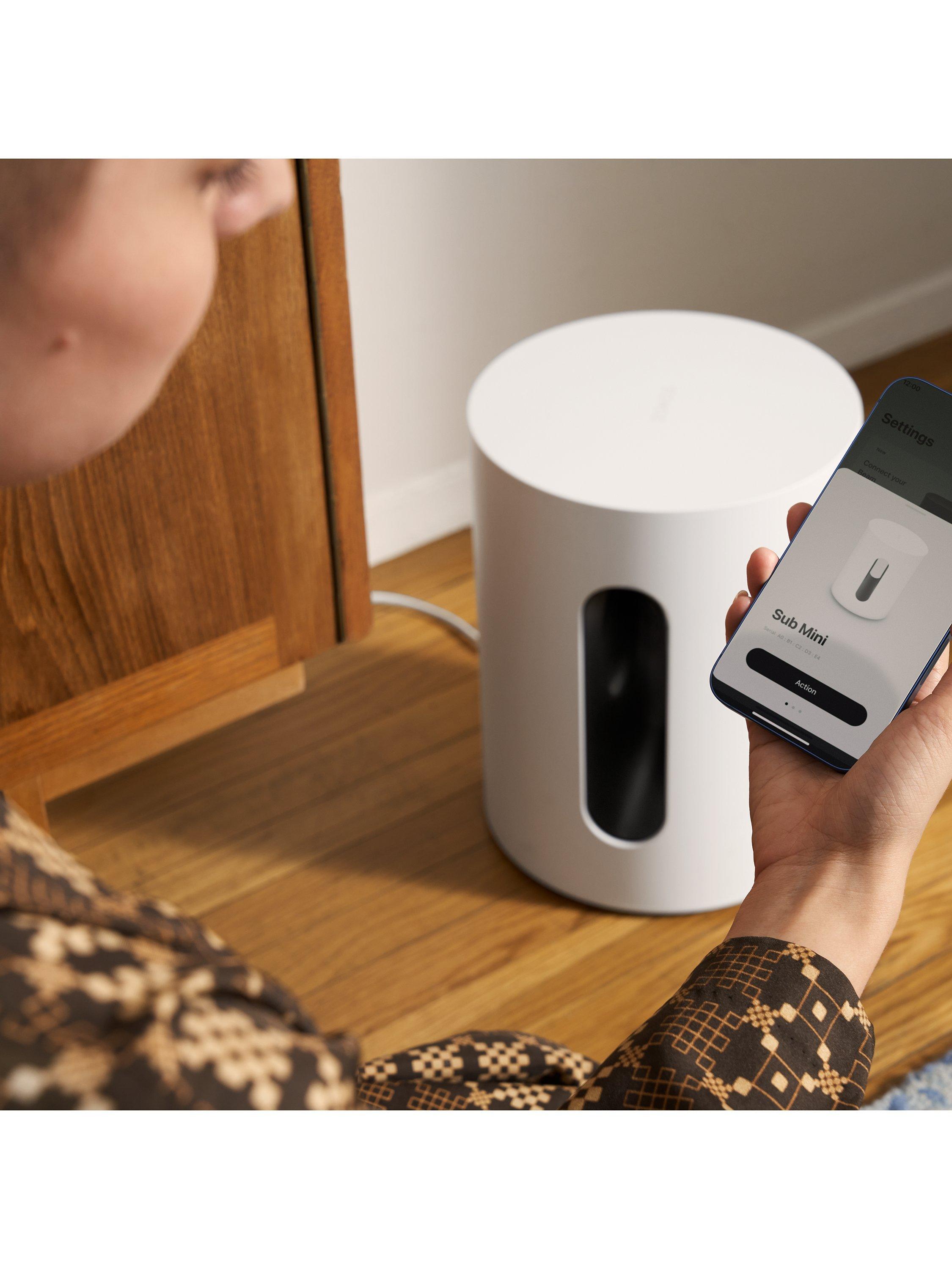 Plug in the power cable and open the Sonos app to wirelessly connect your soundbar or speaker and customise the bass level. The volume automatically adjusts with your paired product.