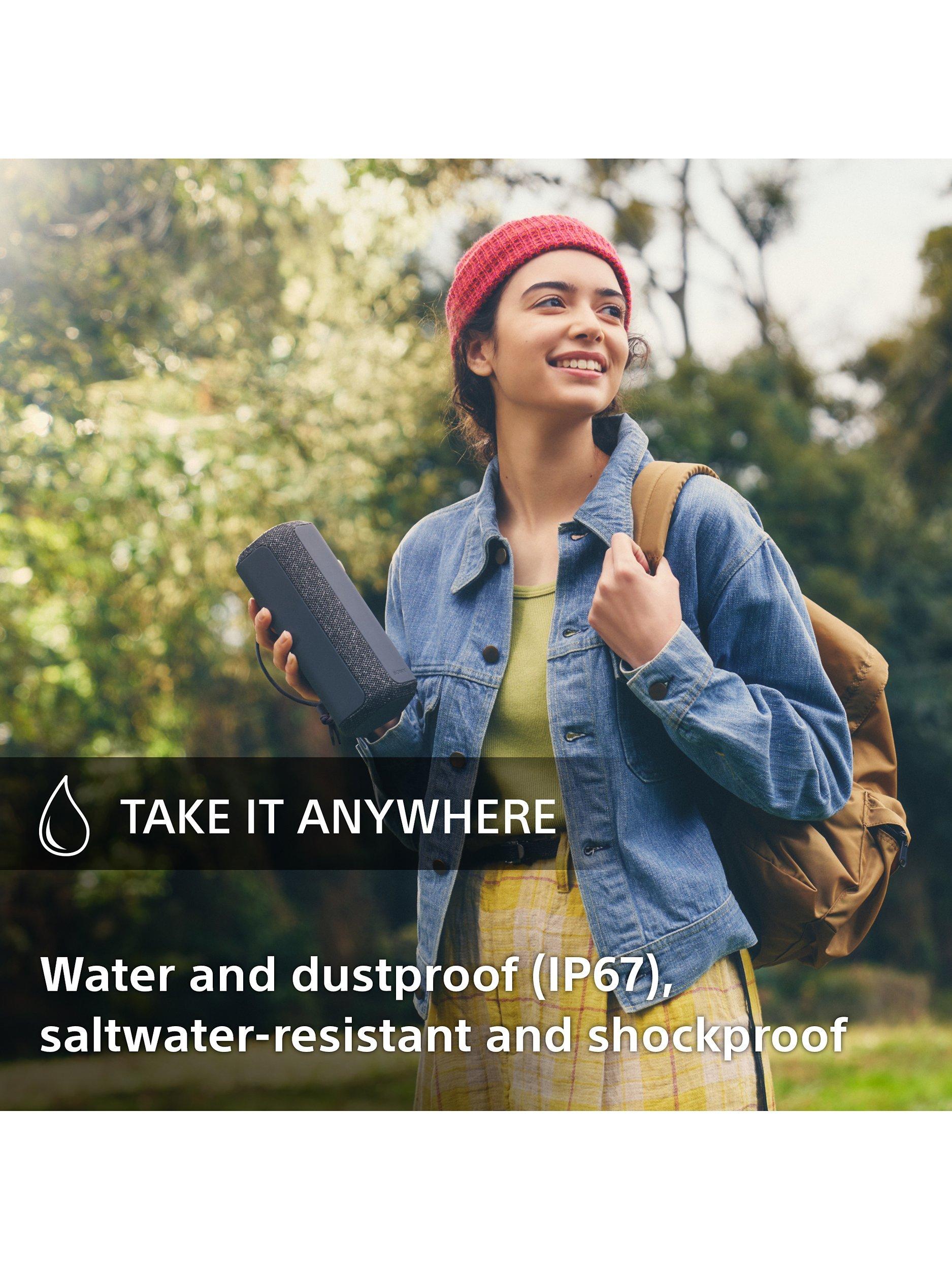 Take your music collection with you wherever you go, and without a worry, with Sony’s compact and portable SRS-XE200 speaker. It’s pretty much everything-proof. Waterproof, dustproof, shockproof, and even saltwater-resistant. IP67-rated to be specific. So you can happily chuck hiking treks, camping trips, or beach parties at it …anything outdoors frankly. And with its handy strap you can easily carry it with you, attach it to a rucsac, or hang it up wherever you lay your hat.
