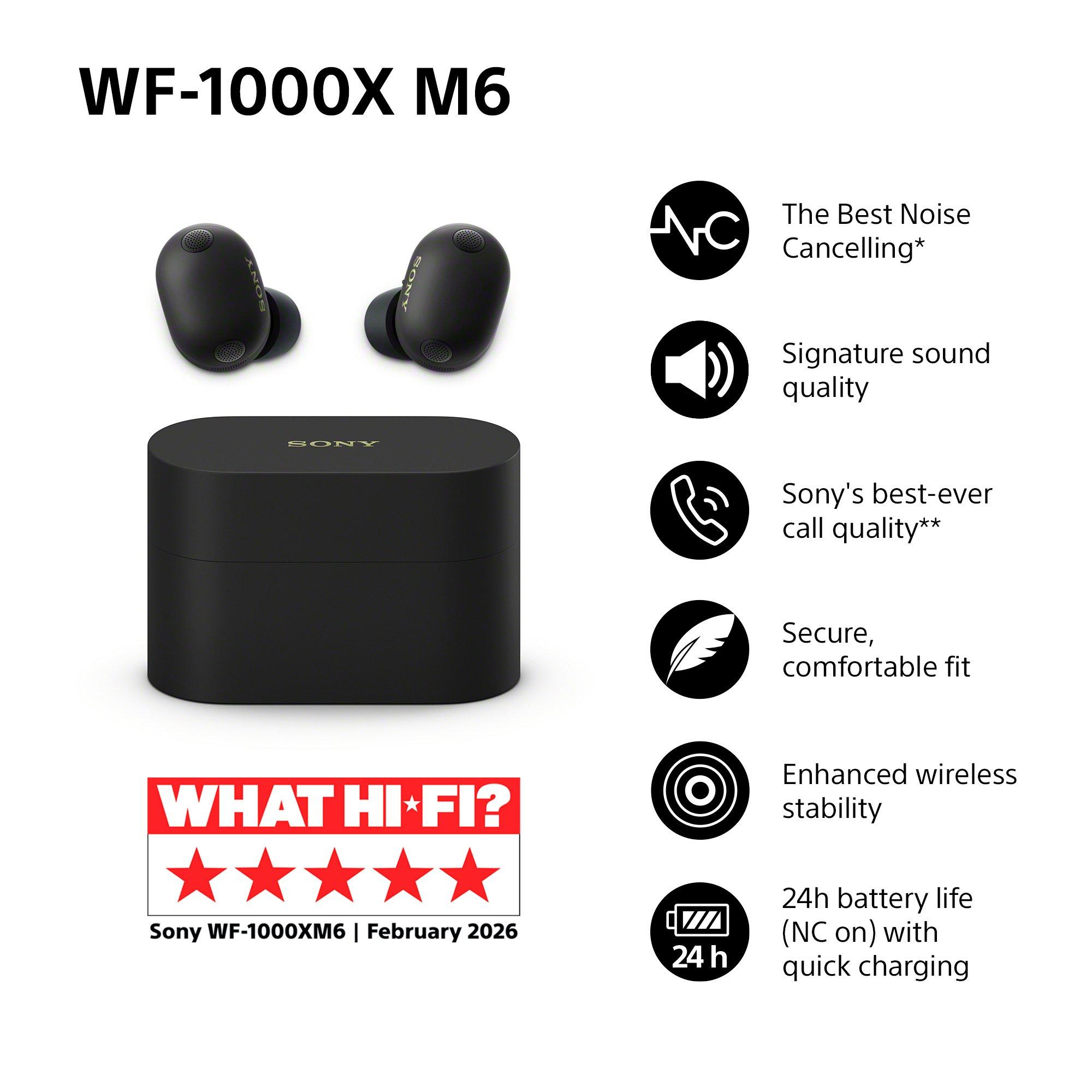 Introducing the Sony WF-1000XM6 Noise Cancelling True Wireless Earbuds. Experience the best rated noise cancelling*, as the new HD Noise Cancelling Processor QN3e and eight precision mics work with Adaptive NC Optimizer to deliver impressive performance wherever you go. Co-created with Grammy Award-winning mastering engineers, the earbuds deliver smooth, balanced sound with a specially designed driver unit, DSEE Extreme, and Hi-Res Audio Wireless support.