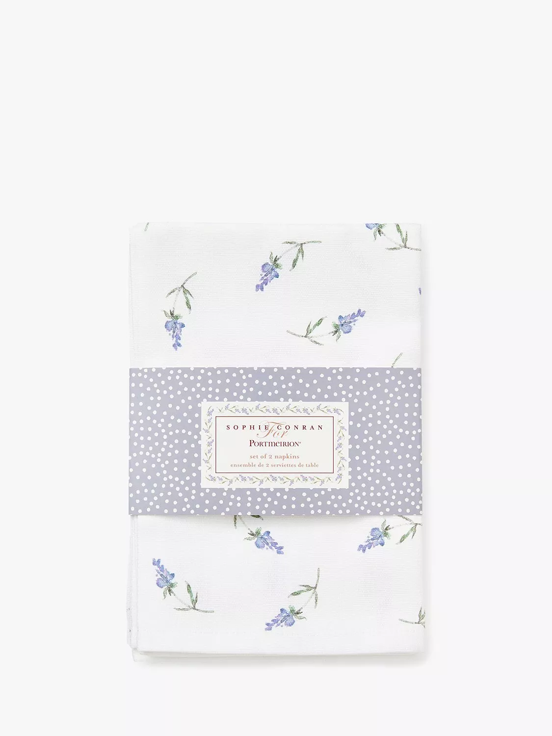 A pair of Sophie Conran for Portmeirion Lavandula napkins decorated in a gorgeous lavender sprig design in shades of purple and green. Made of pure cotton, the napkins are machine washable for everyday use.