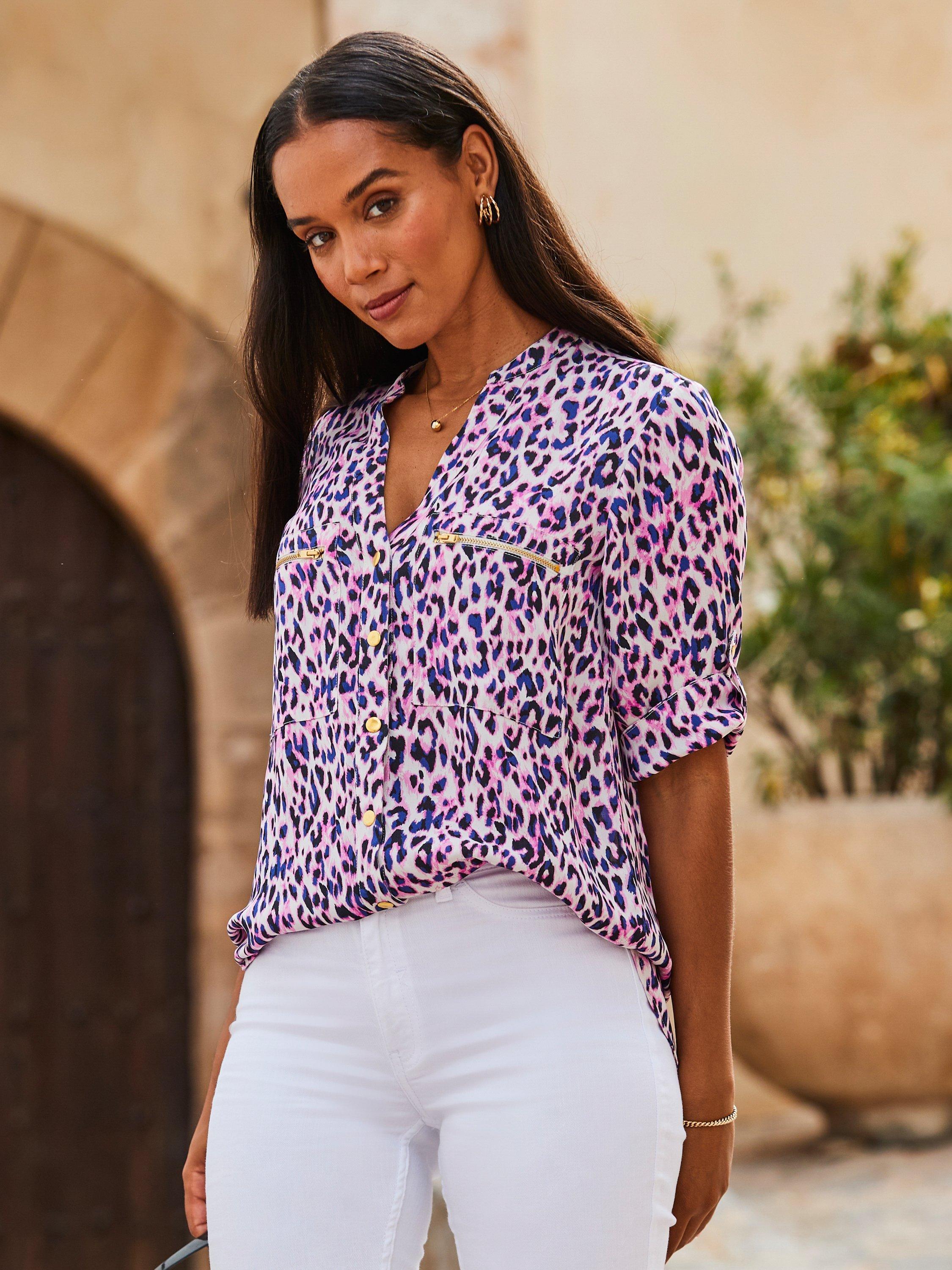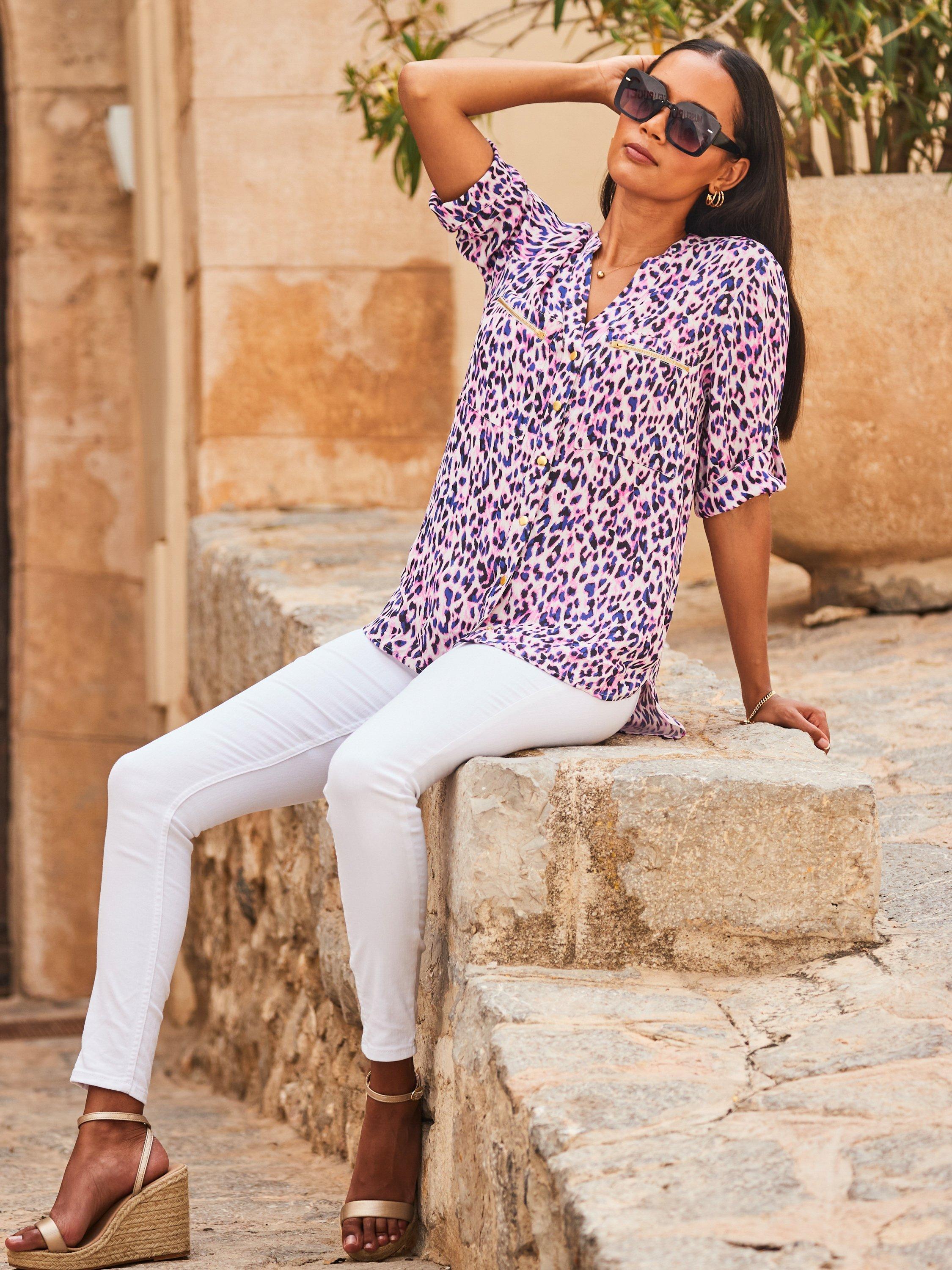 This chic and comfy body-skimming tunic style is elevated with gold poppers and zips, and features tab detail turn-back sleeves. Its flattering longline hem pairs perfectly with skinnies for an effortlessly stylish outfit.
