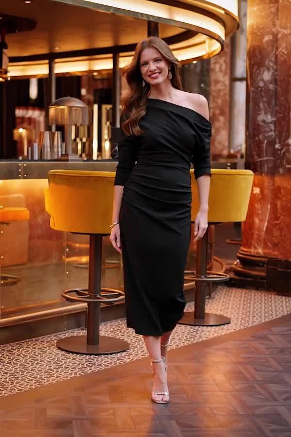 This midi dress features an asymmetric neckline, clever ruching, and three-quarter sleeves, making it a distinctive choice for any party or evening event.