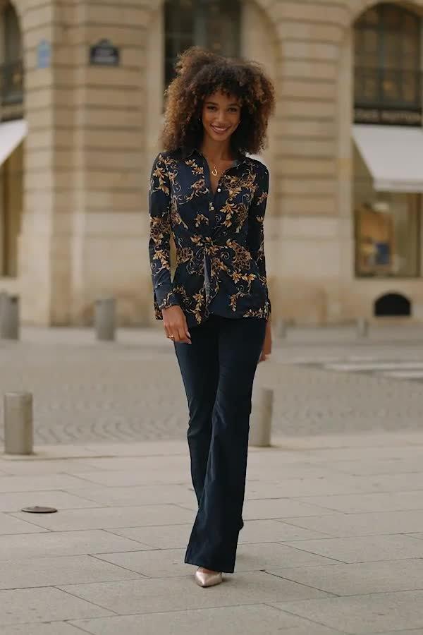 A twist front shirt by Sosandar with an abstract baroque print. Framed with a collar and long sleeves, it's great for energising your weekend look.