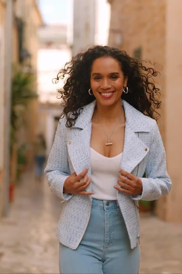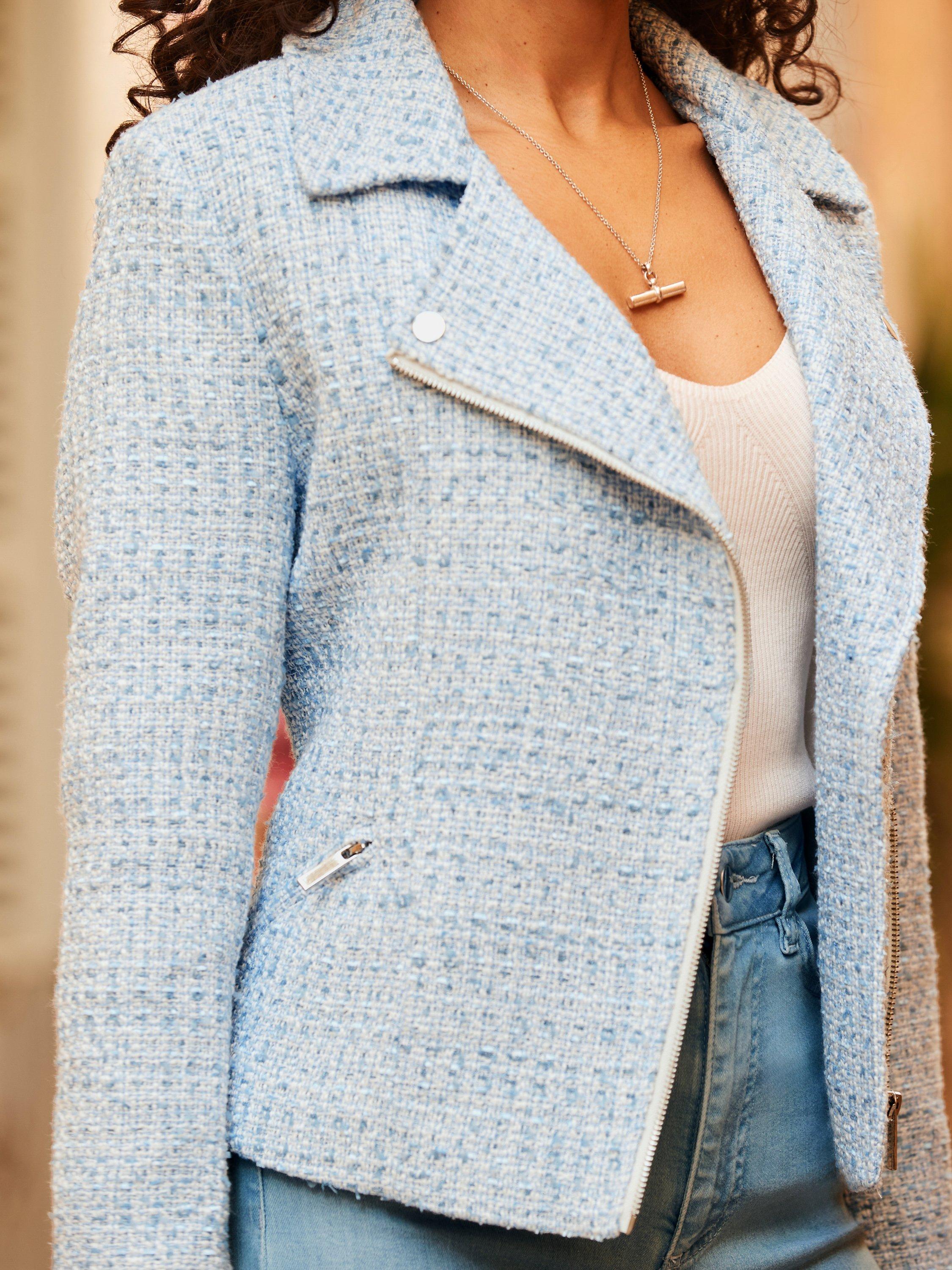 Crafted from soft, silky boucle fabric, this jacket from Sosandar borrows its bold look from classic biker details. Pair it with jeans and make a real statement.