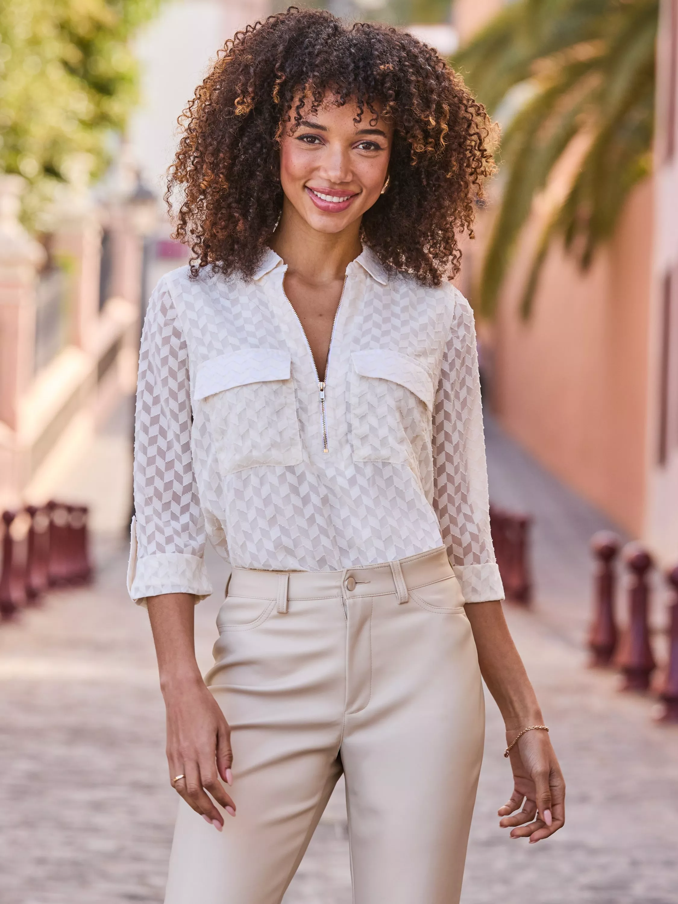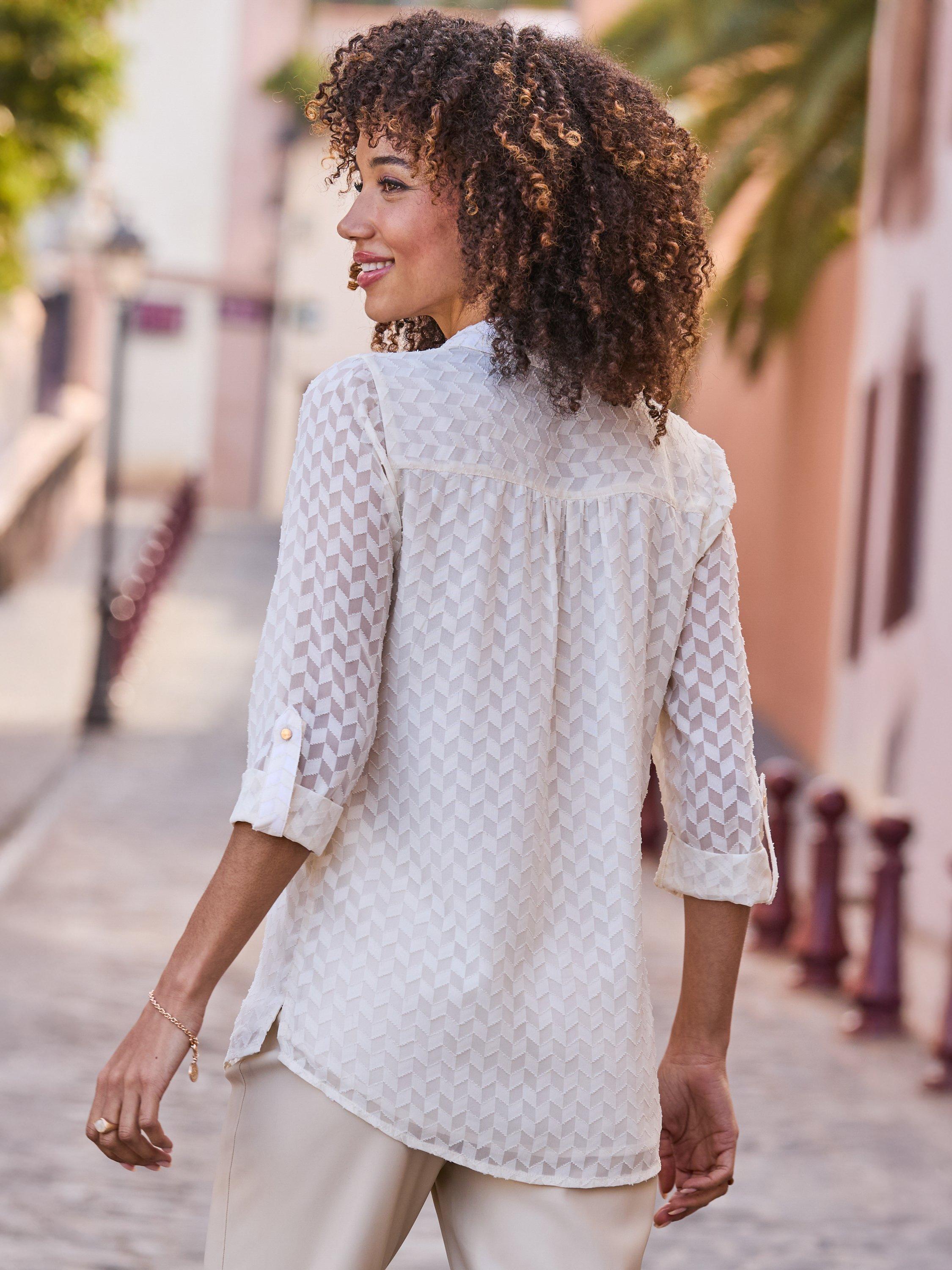 This tunic top from Sosandar keeps you comfortable with its easy roll-up sleeves and smart collar. The textured effect adds interest, making it the perfect piece to express your style.