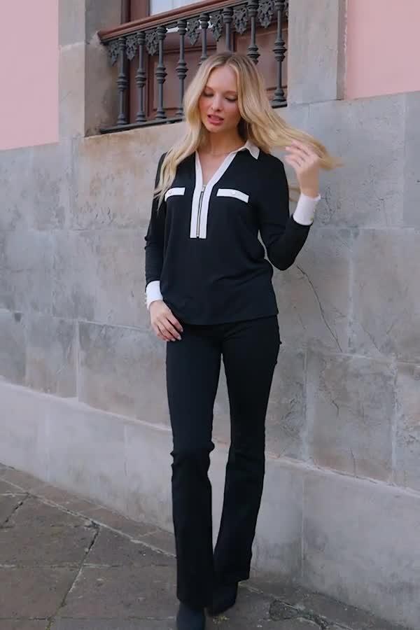 A contrast trim zip jersey top from Sosandar featuring bold blocks of colour, a classic v-neckline and long sleeves.