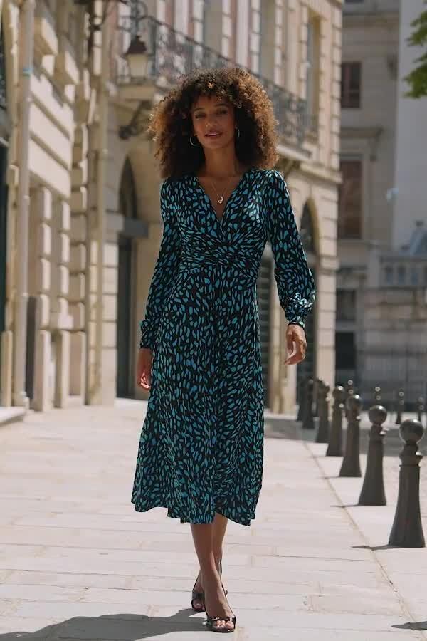 This midi fit and flare dress combines a striking fleck pattern with a flattering ruched shape. The soft V-neck and long sleeves make it perfect for your day plans, helping you stand out with comfort and confidence.