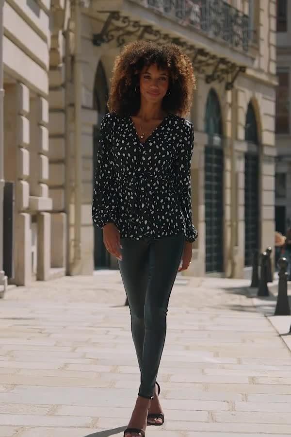 A plisse blouse from Sosandar, refreshed with timeless spots. Framed with a V-neckline, tie front and long sleeves, it offers comfort for busy days.