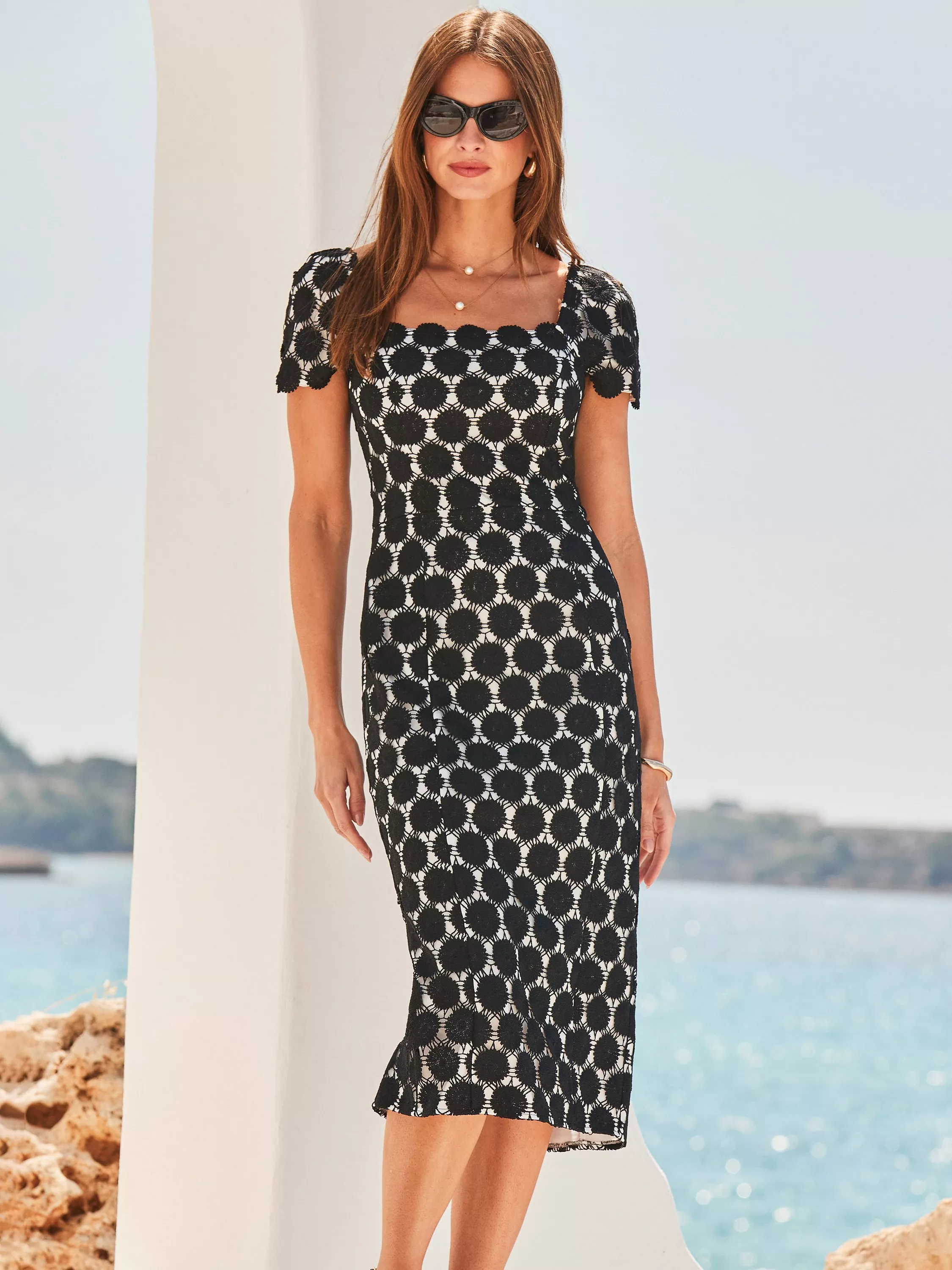 The Sosandar midi pencil dress turns everyday moments into highlights. With a sharp geometric pattern and crafted texture, it flatters you effortlessly. The square neckline and short sleeves deliver lasting comfort, while the concealed zip makes dressing swift - ideal for work or weekend plans with a twist.