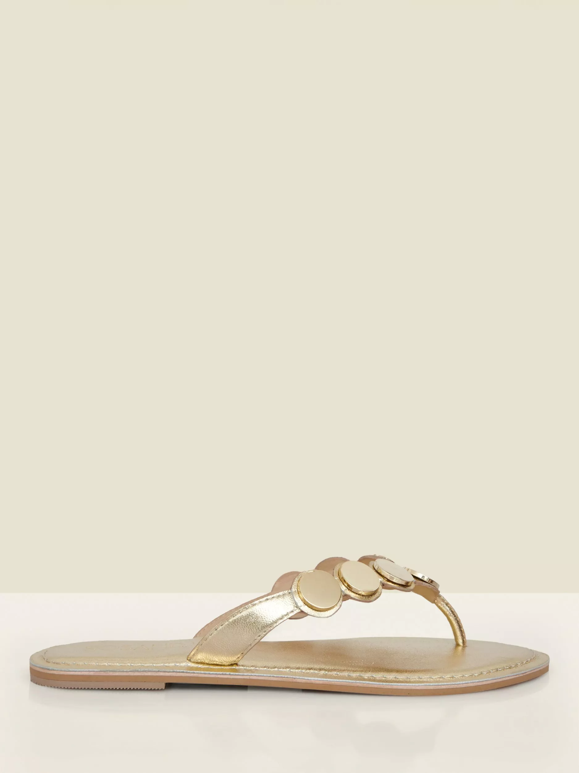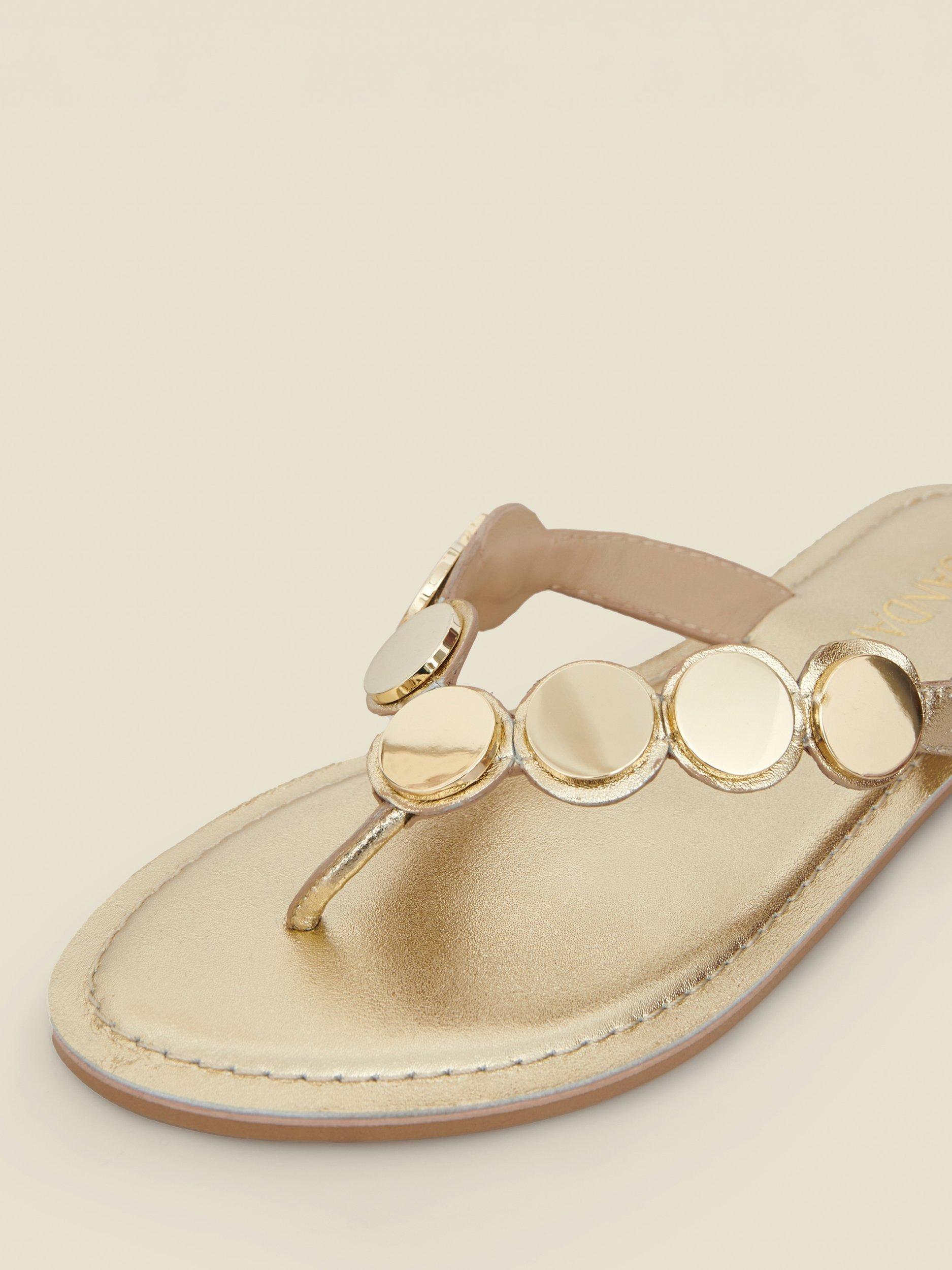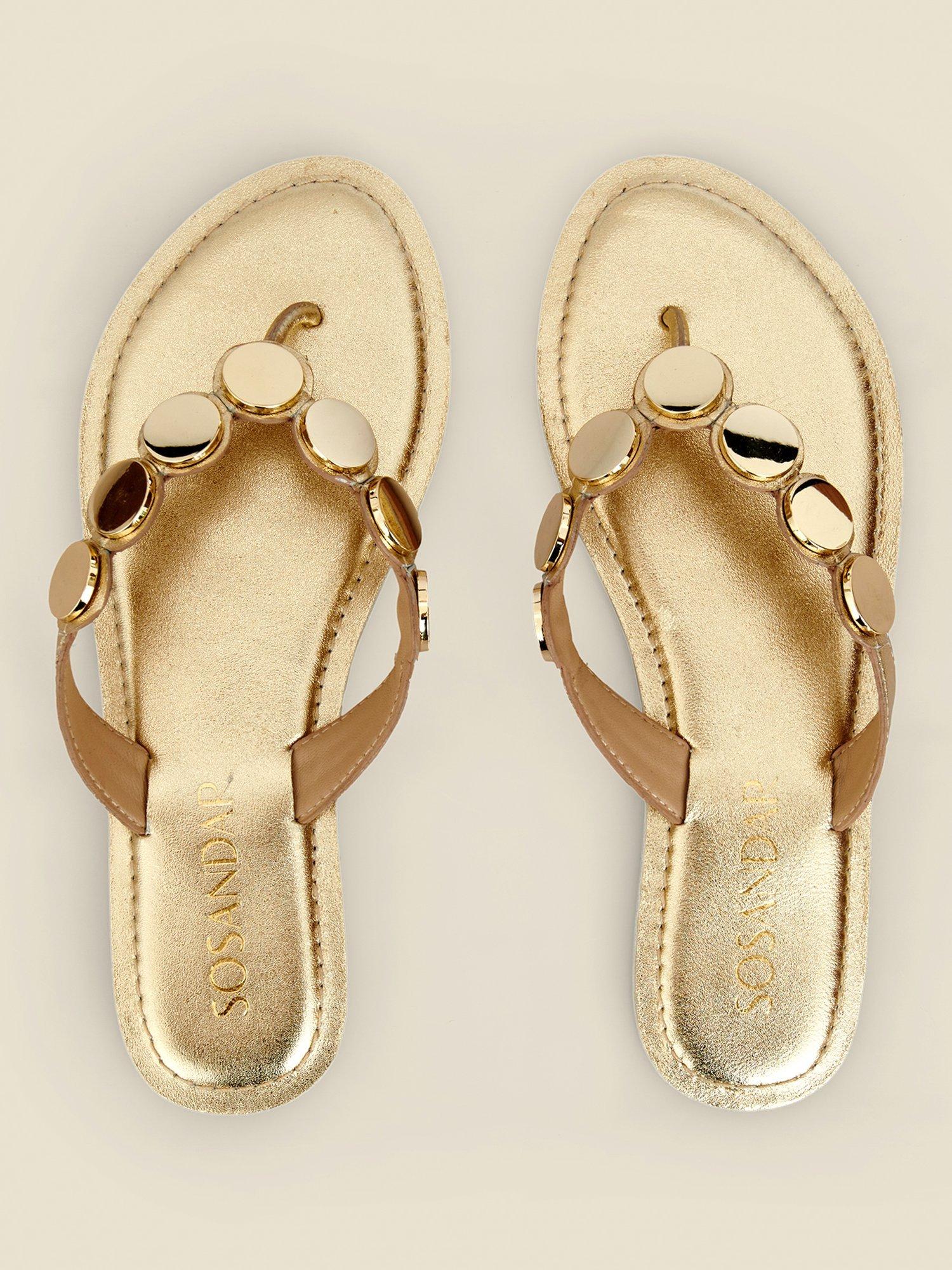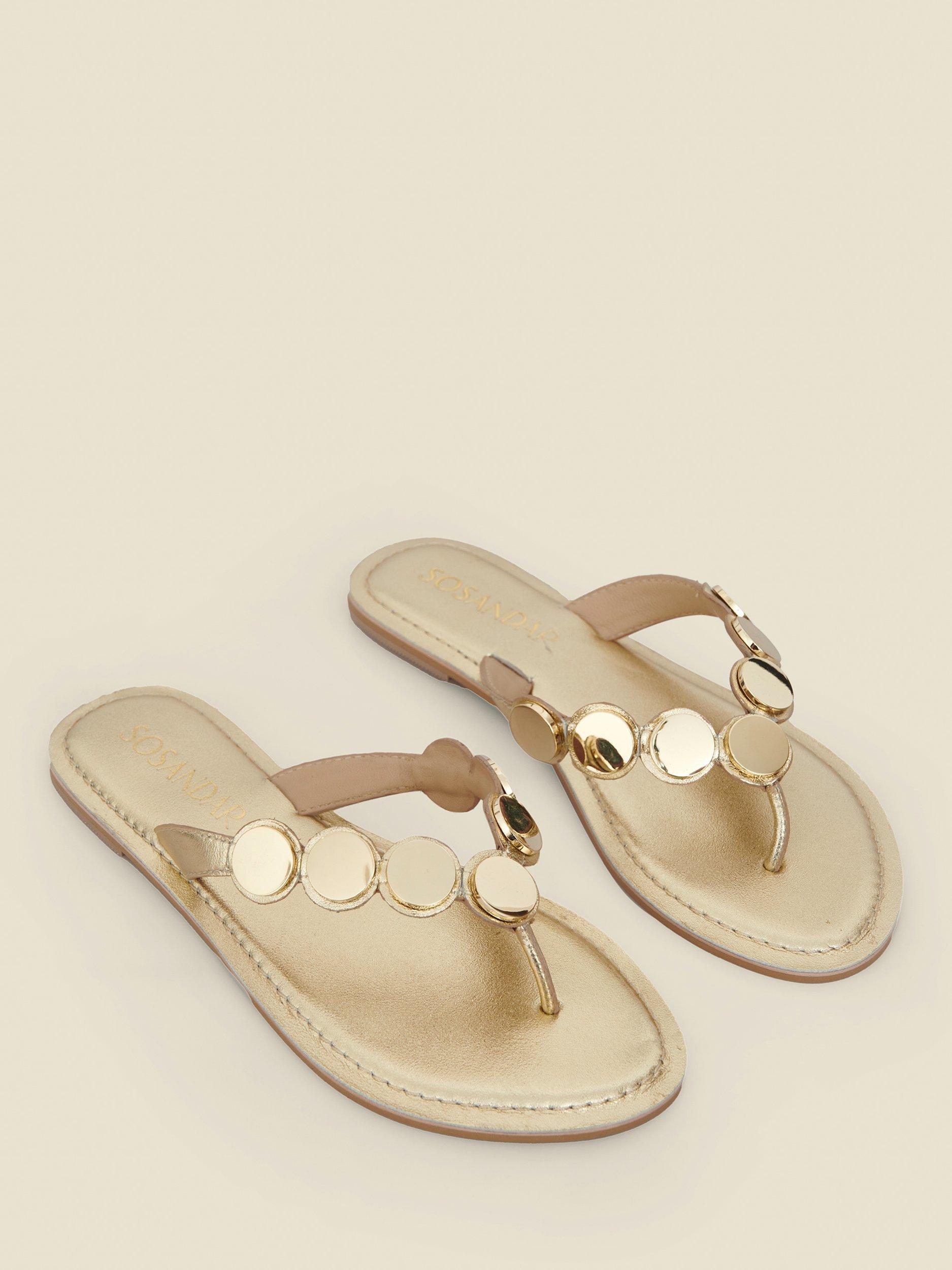 Sandals worth booking a holiday for. Crafted from luxe metallic gold leather with a trending toe post silhouette and a cushioned sole for a comfortable wear. Style with everything from shorts to sun dresses.