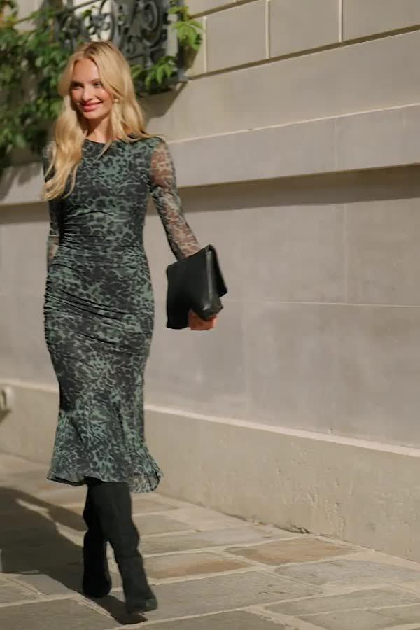 This party-ready mesh midi sheath dress features a bold leopard pattern, while long sleeves and a round neck keep you comfortable. Designed to fit beautifully, it lets you express yourself with confidence.