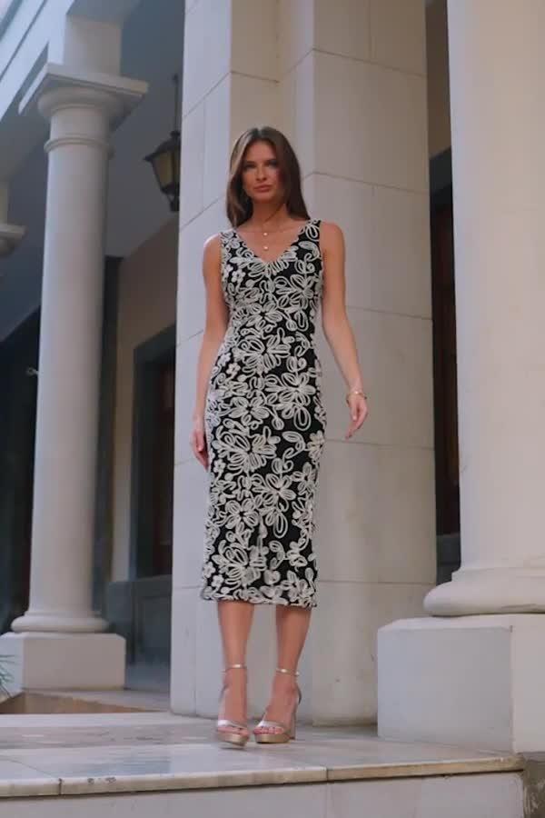 Form-fitting at every point - from the bodice to the hem, this mid-length dress from Sosandar features a fuss-free v-neckline and an all-over floral macrame texture.