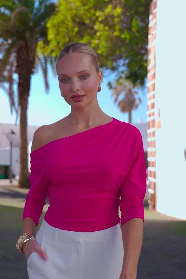 Featuring an asymmetric neck and three-quarter length sleeves, this off-shoulder jersey top by Sosandar is designed in a slim sculpting silhouette.