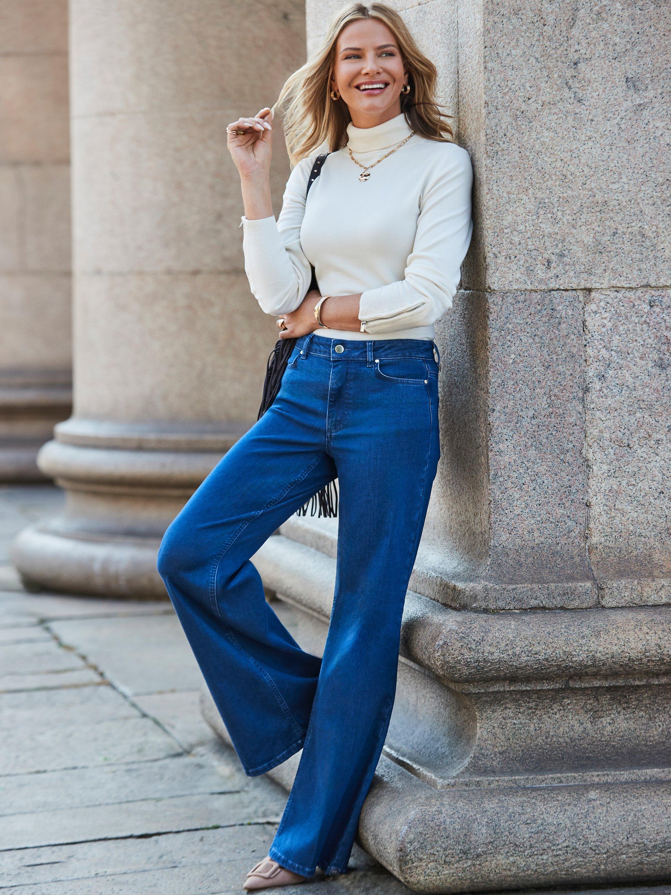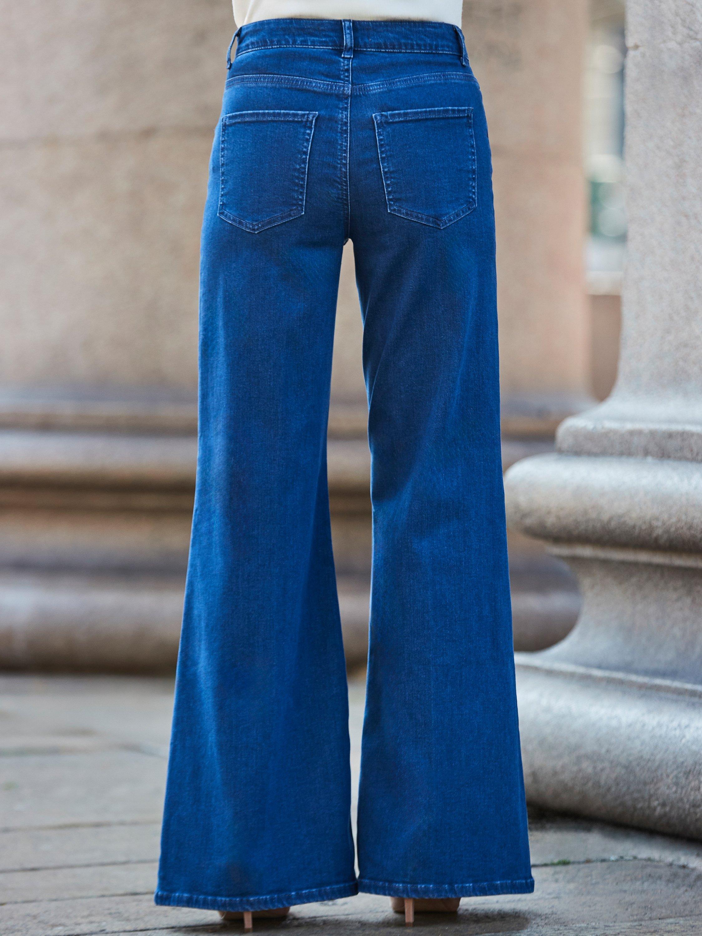 Revived in an effortlessly wearable form, these mid rise palazzo jeans from Sosandar are composed from pure cotton for soft and breathable all day wear and have regular grazing hems.