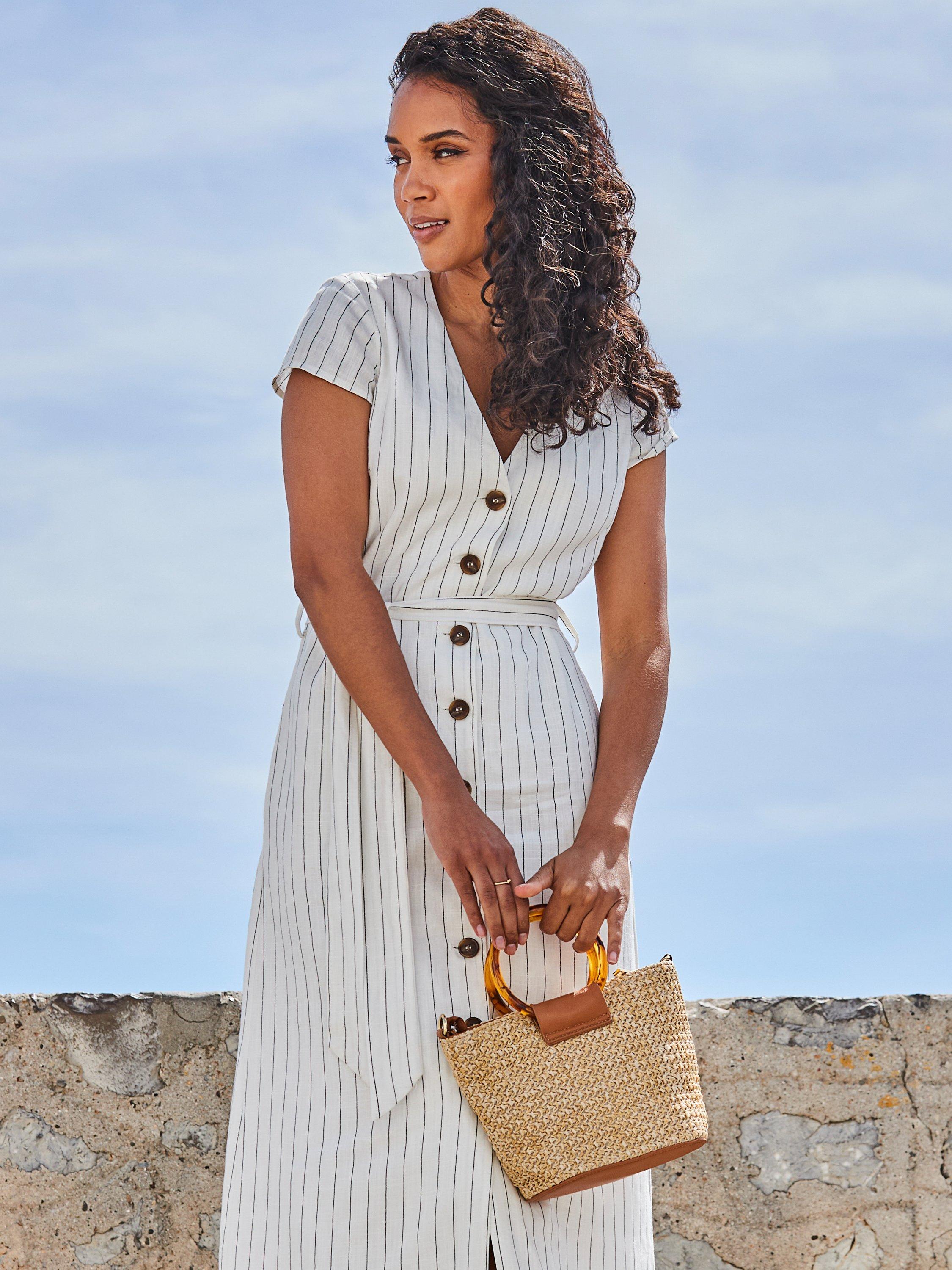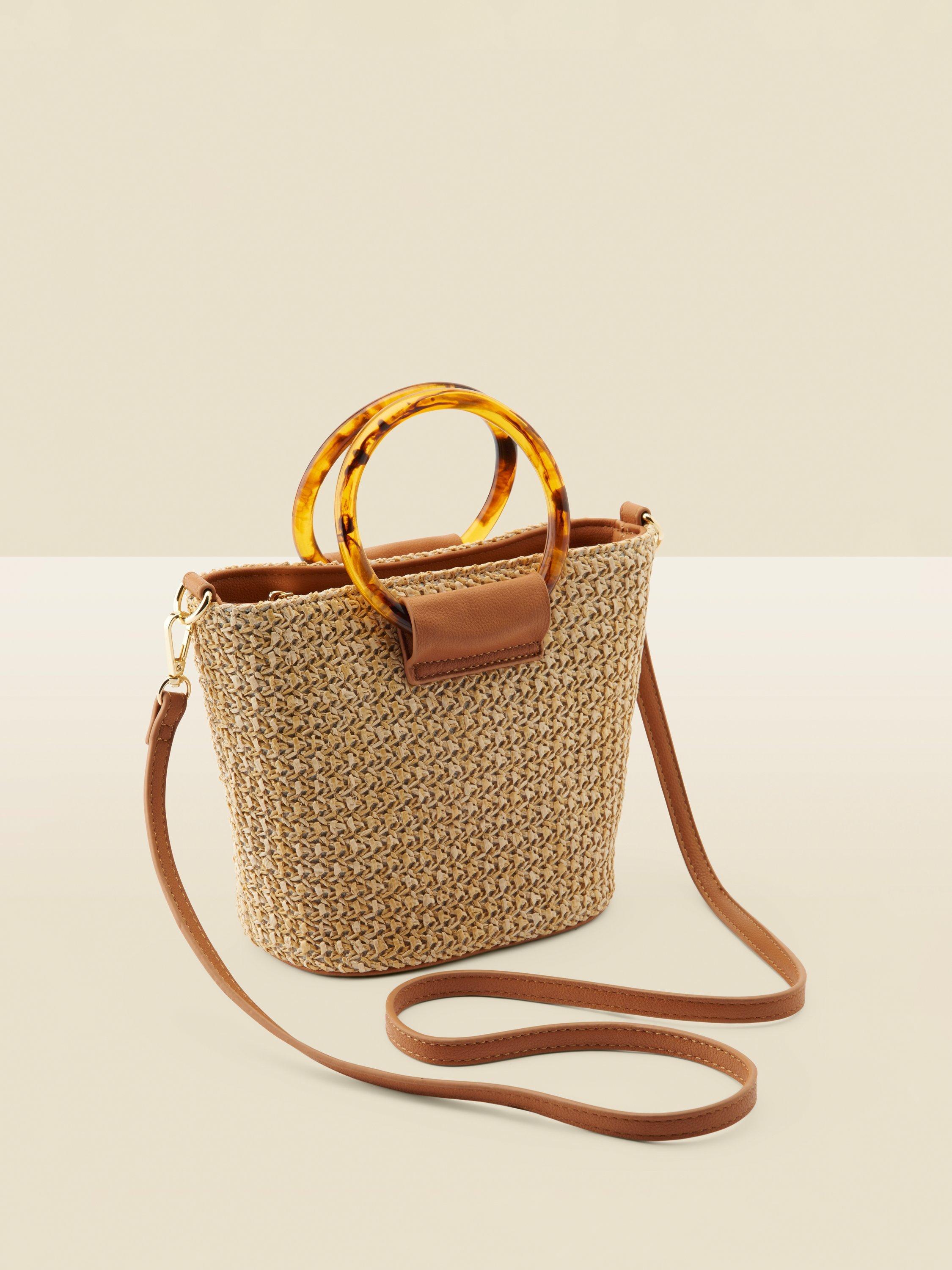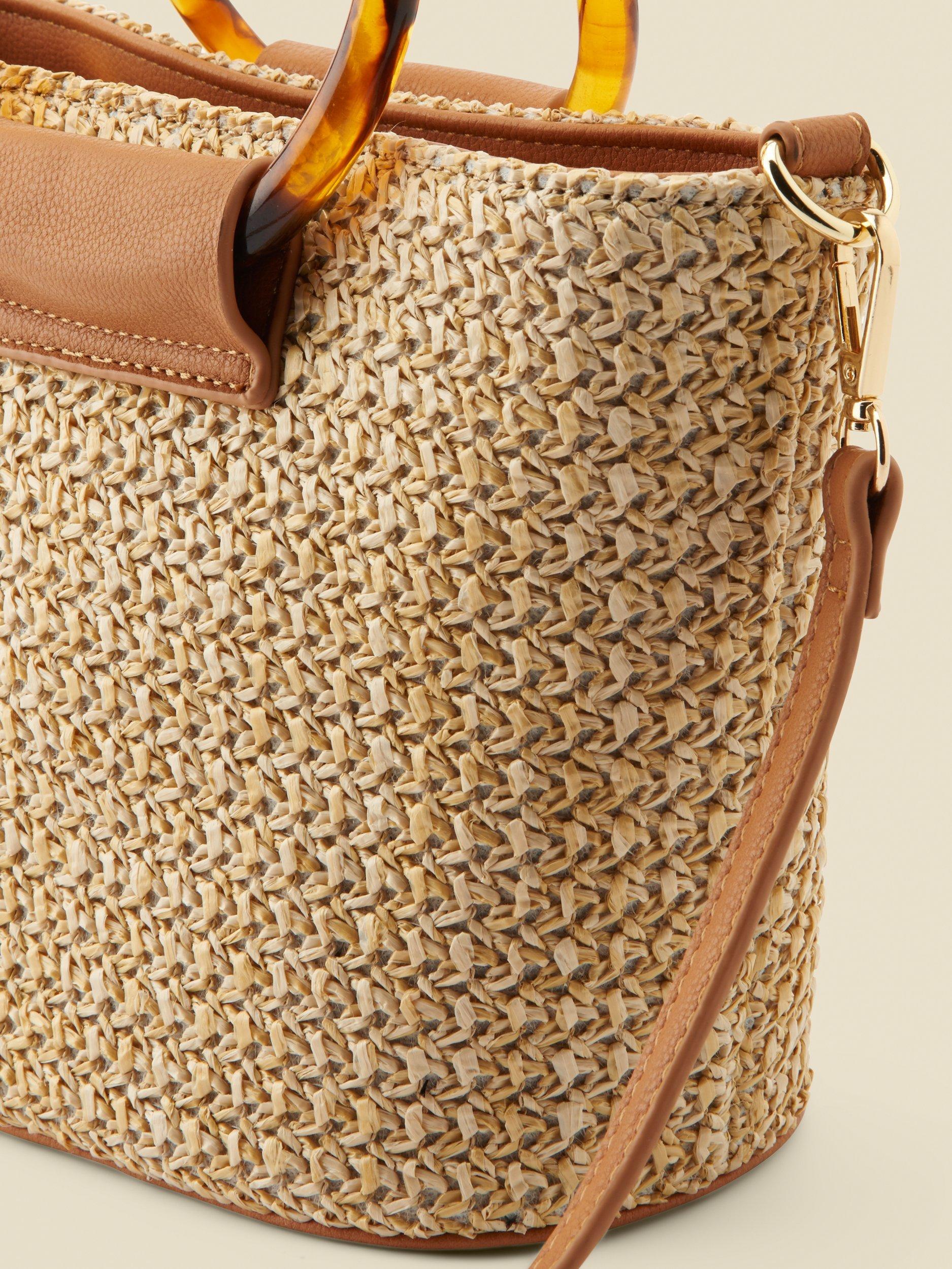 Found: the perfect summer bag. In a classic grab bag style, Sosandar have created this iteration in chic raffia with a tortoiseshell hoop handles, a removable crossbody strap and a simple, secure zip.