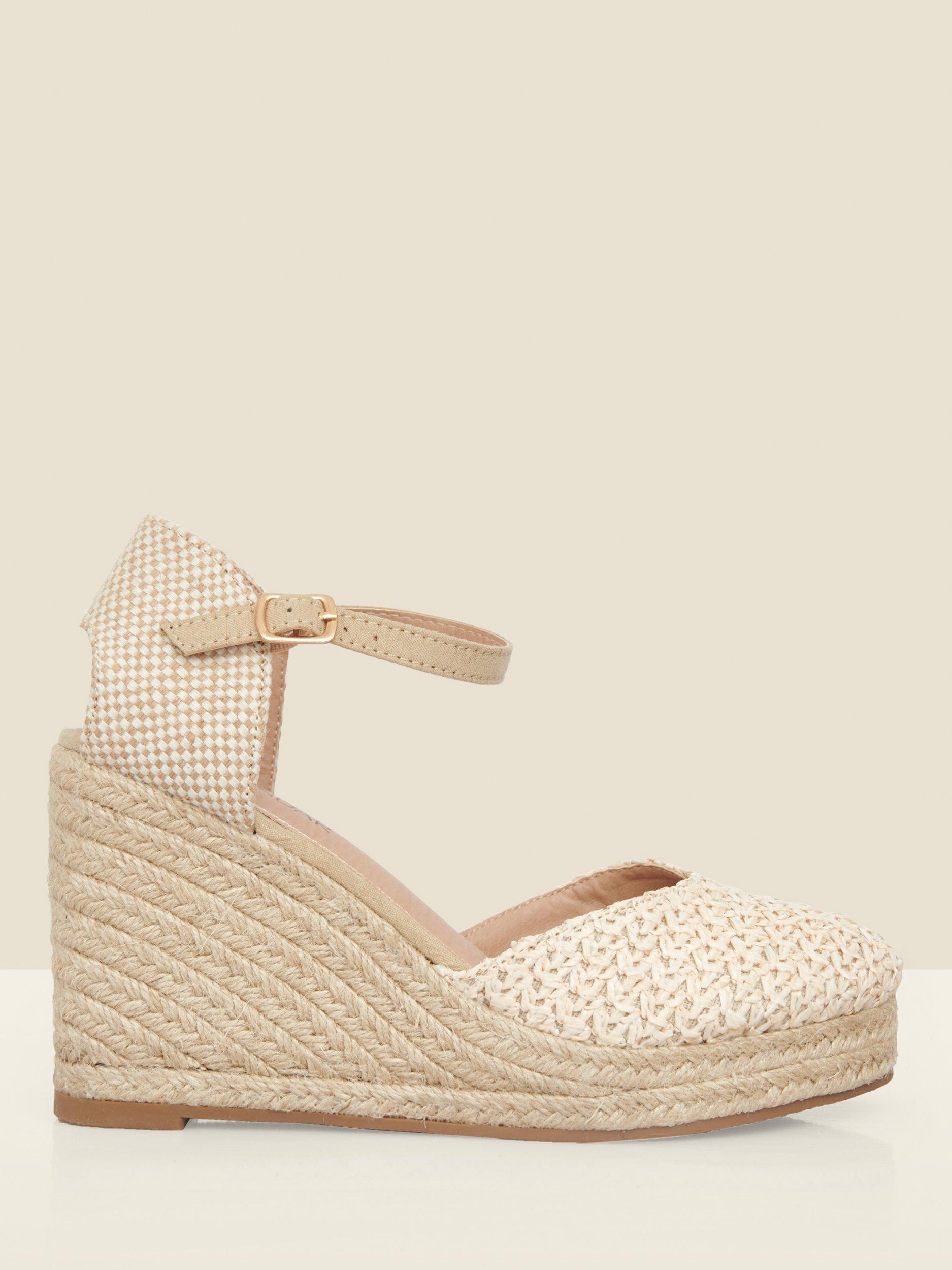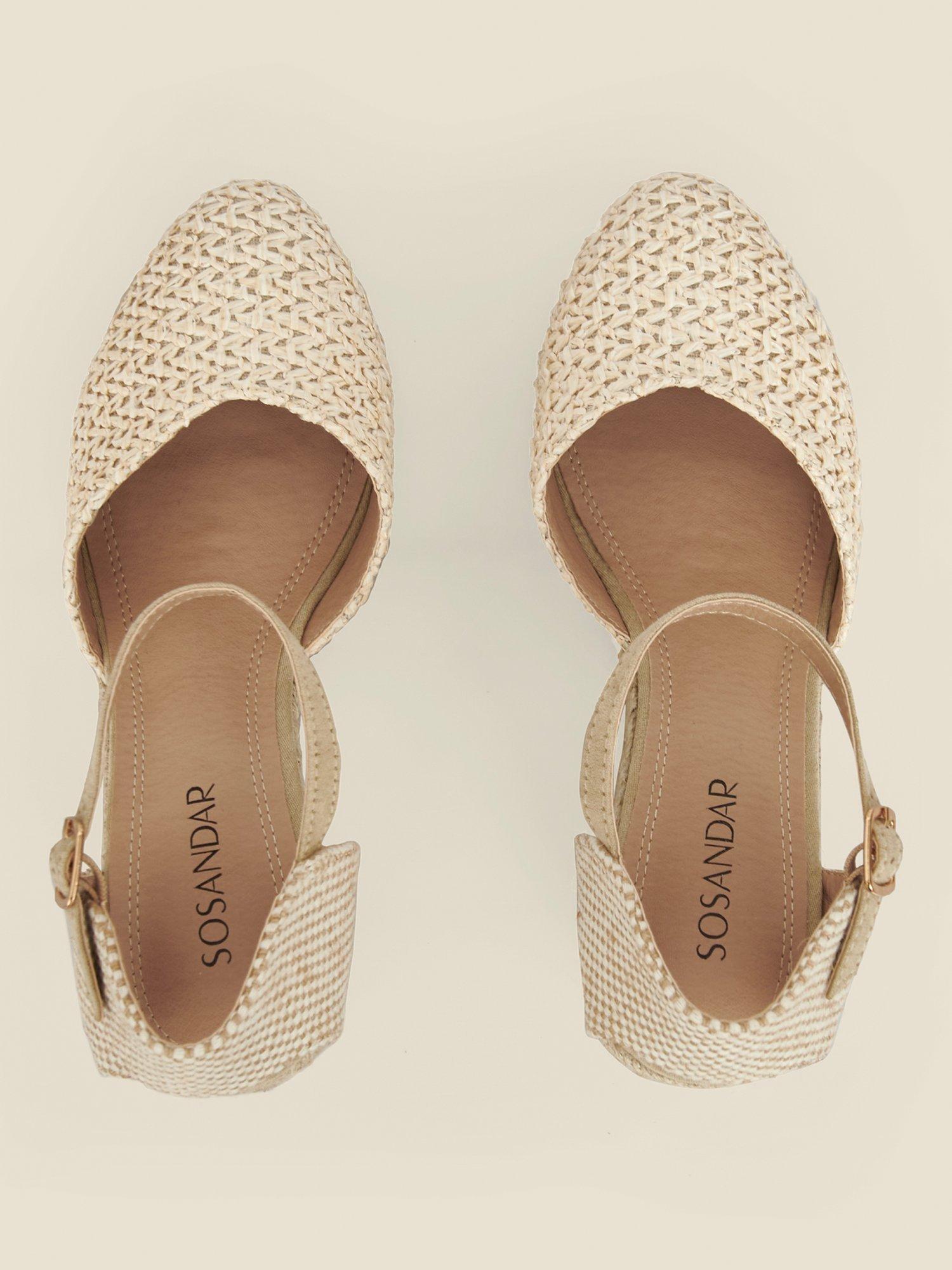 Bolstering your warm-weather collection, this pair of stitch detailed espadrilles by Sosandar is made with textured raffia uppers. Sitting on a wedge heel, they have a rounded closed toe design and an adjustable ankle fastening.