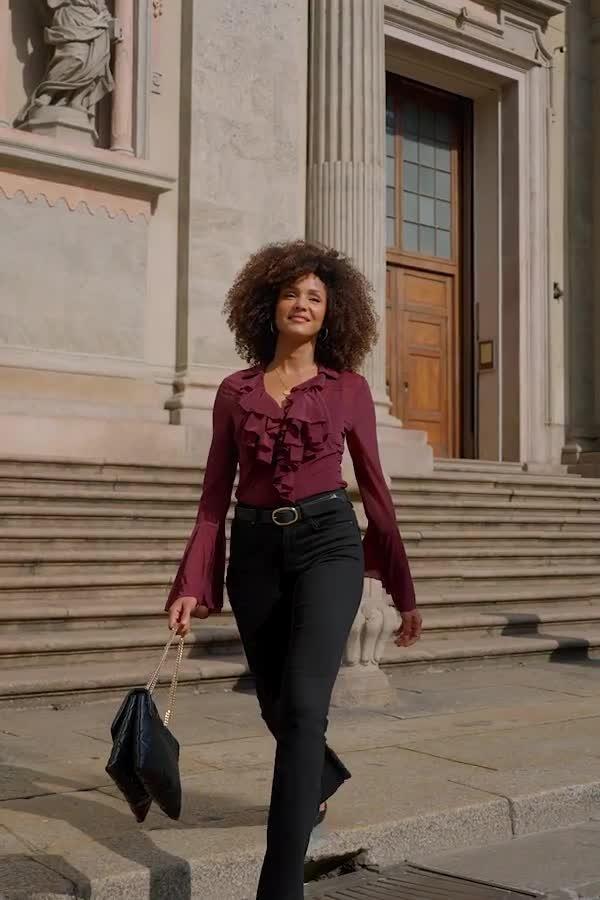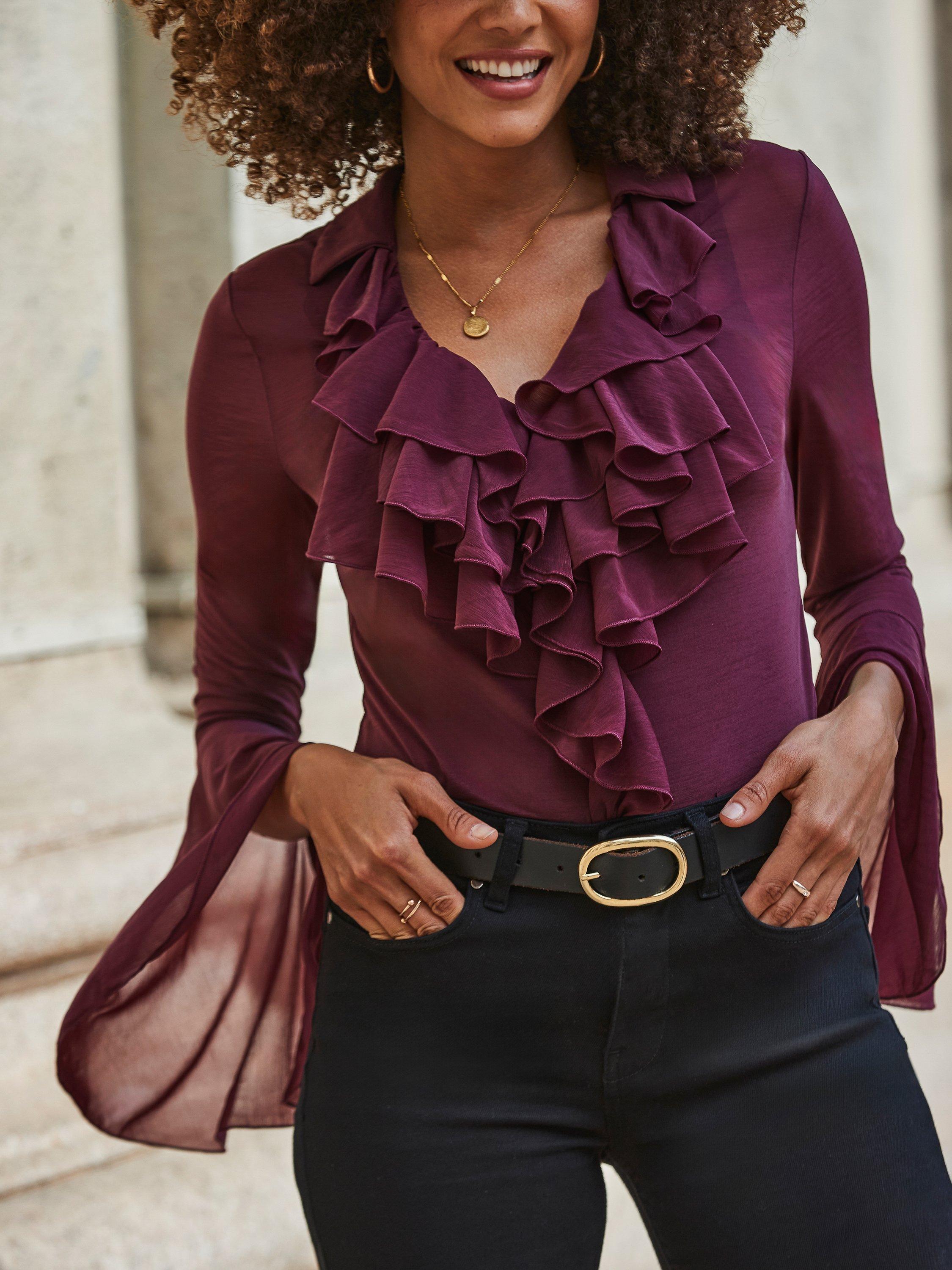 Crafted from a soft and stretchy jersey fabric, this blouse stands out with its ruffle front design and sheer fluted sleeves. It's the perfect fit for the 'jeans and a nice top' dress code.