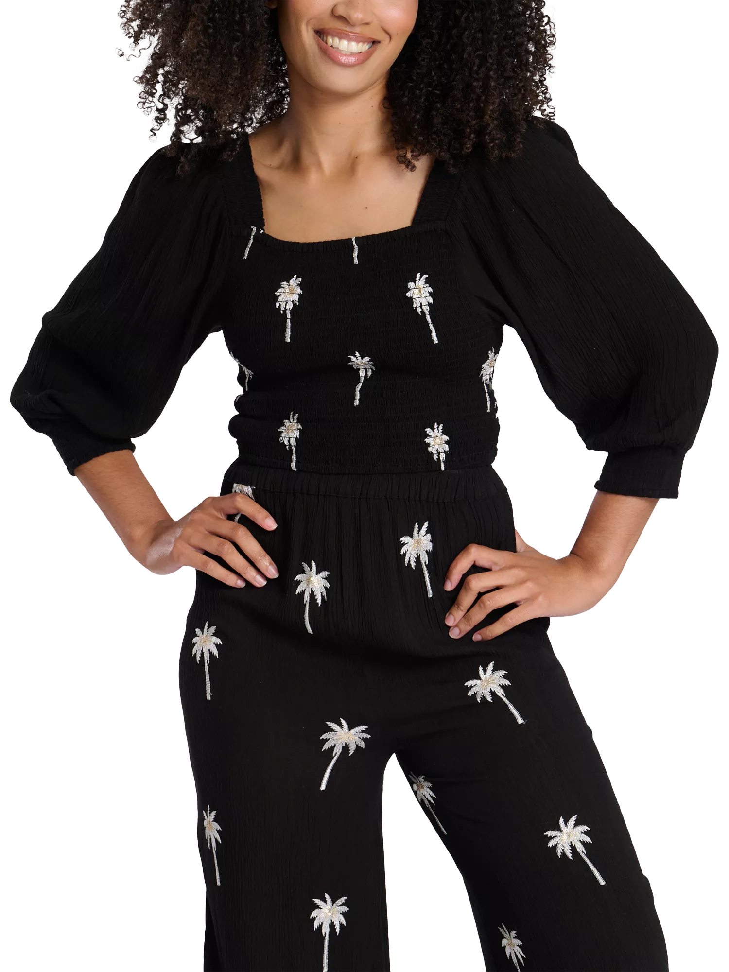 The Long Sleeve Top with Embroidered Palmtree Design brings a coastal charm to your wardrobe. Crafted from soft, breathable fabric, this top features beautifully detailed palm tree embroidery, adding a playful yet elegant touch. The long sleeves and relaxed fit offer comfort and versatility, making it perfect for casual outings or layering.