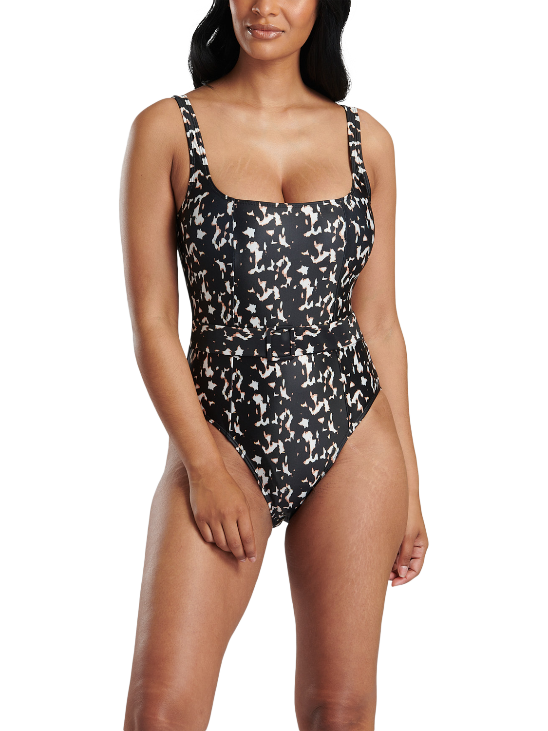 Make a statement in South Beach's Animal Tummy Control Swimsuit with Belt and Buckle Detail. Featuring a sleek animal print design and a flattering tummy control feature, this swimsuit adds a touch of sophistication with its stylish belt and buckle accents. Without cups for a natural fit, it's perfect for those looking for both style and comfort by the water.