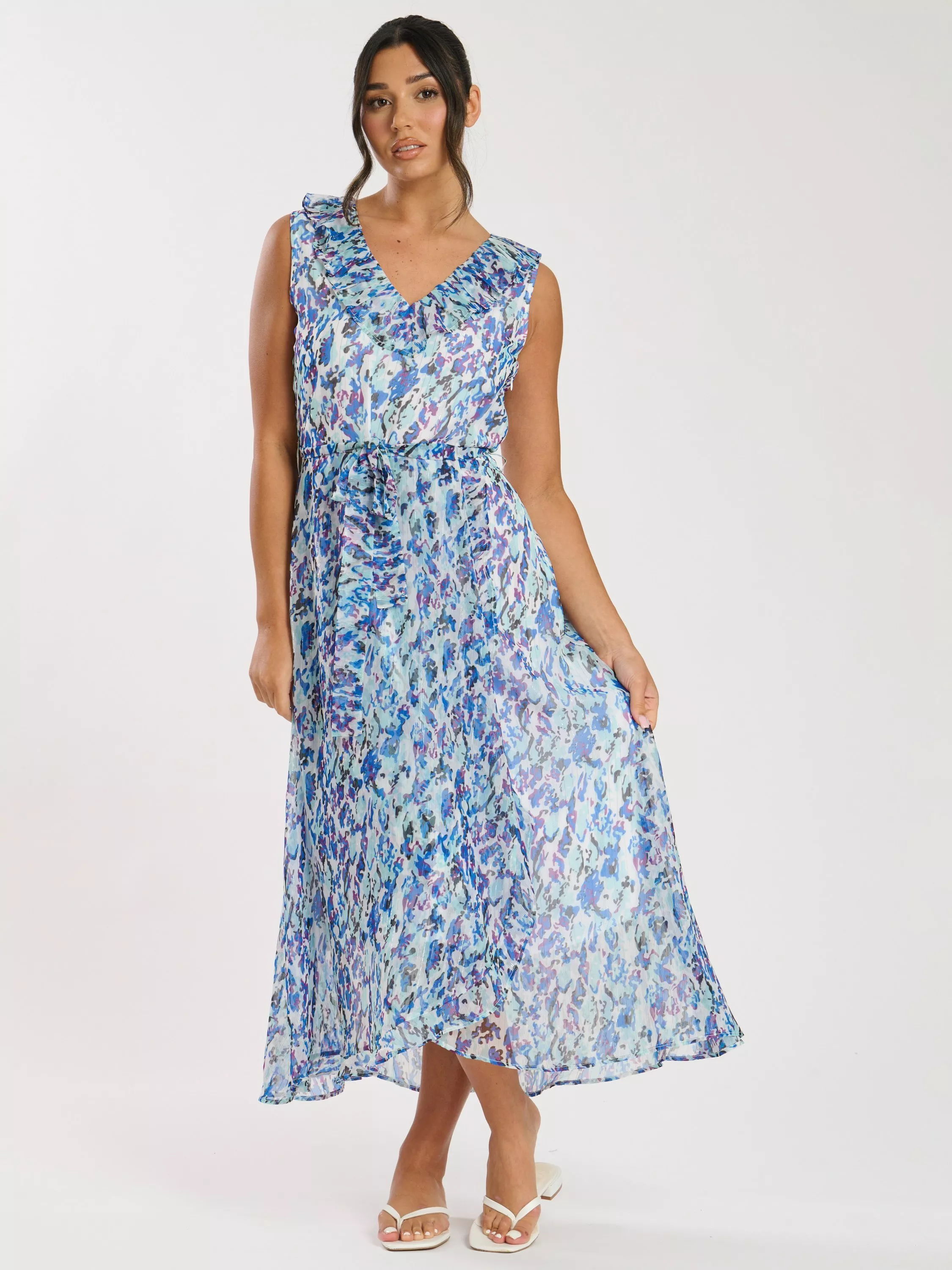 In a shape that really flatters, this mid-length dress from South Beach features frills across the v-neckline and down the centre front. With an abstract floral design, this sleeveless style is effortlessly flattering for summer occasions and more.