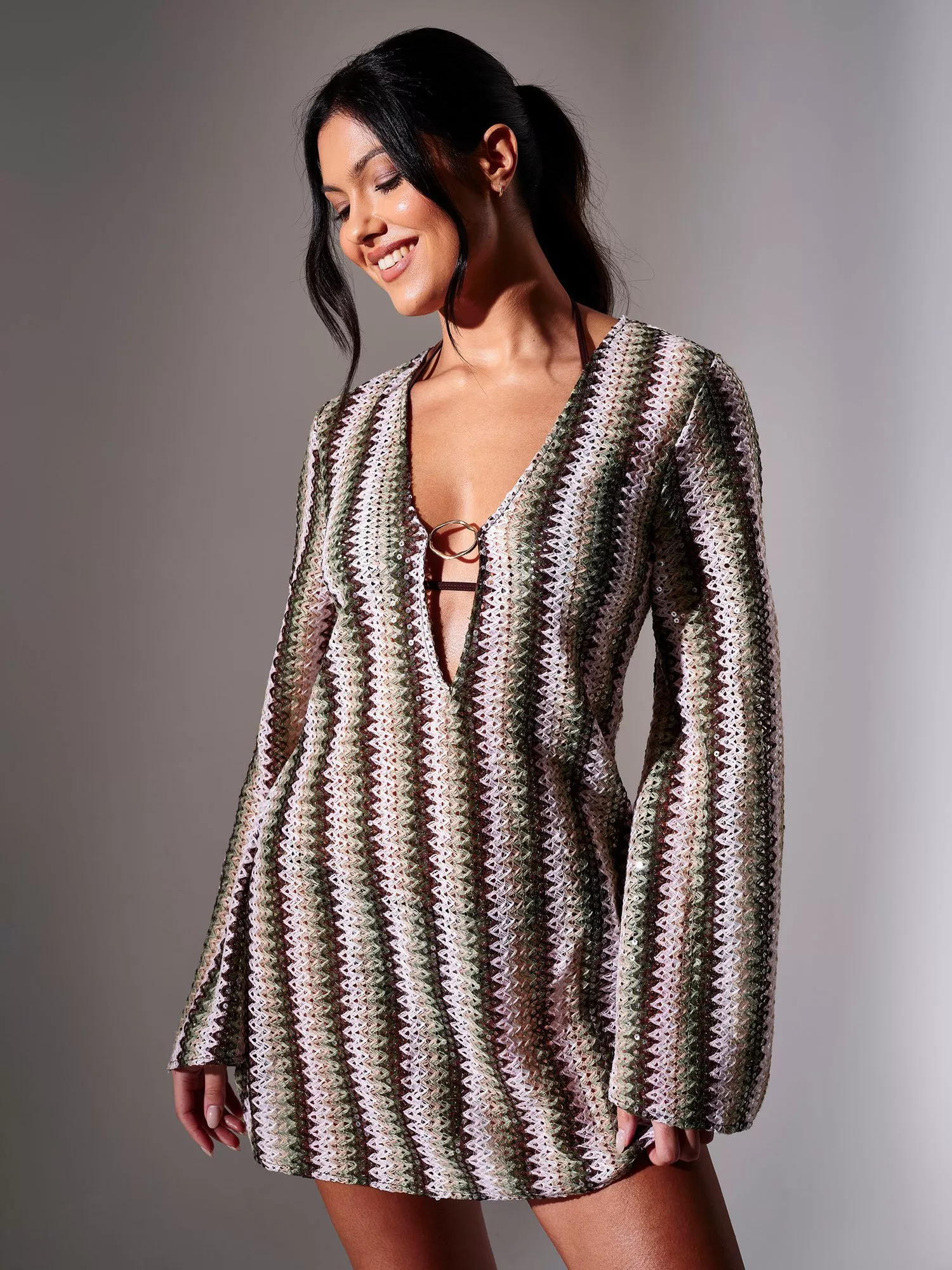 A South Beach mini kaftan dress. With a playful sequin crochet stripe design and relaxed fit, it's finished with a ring detail to the front, making a statement with ease.