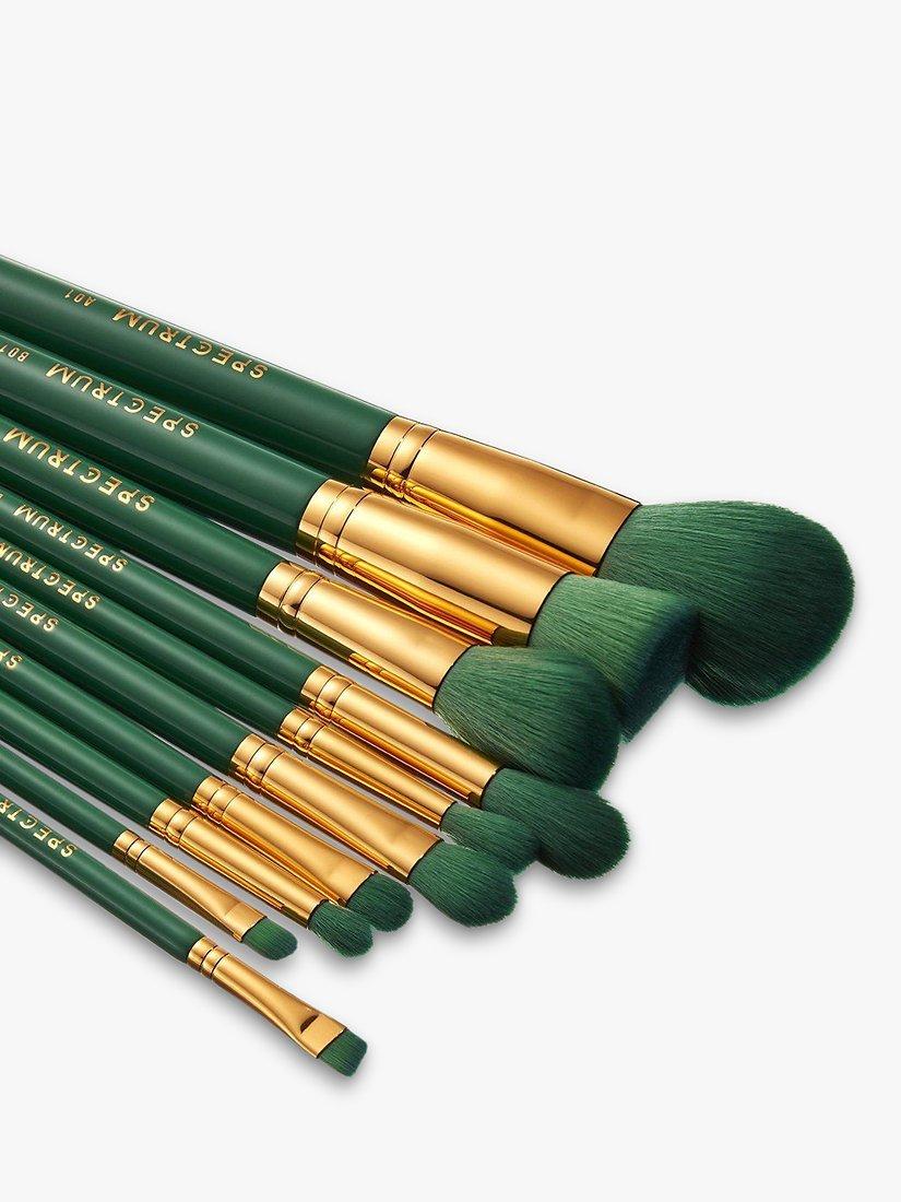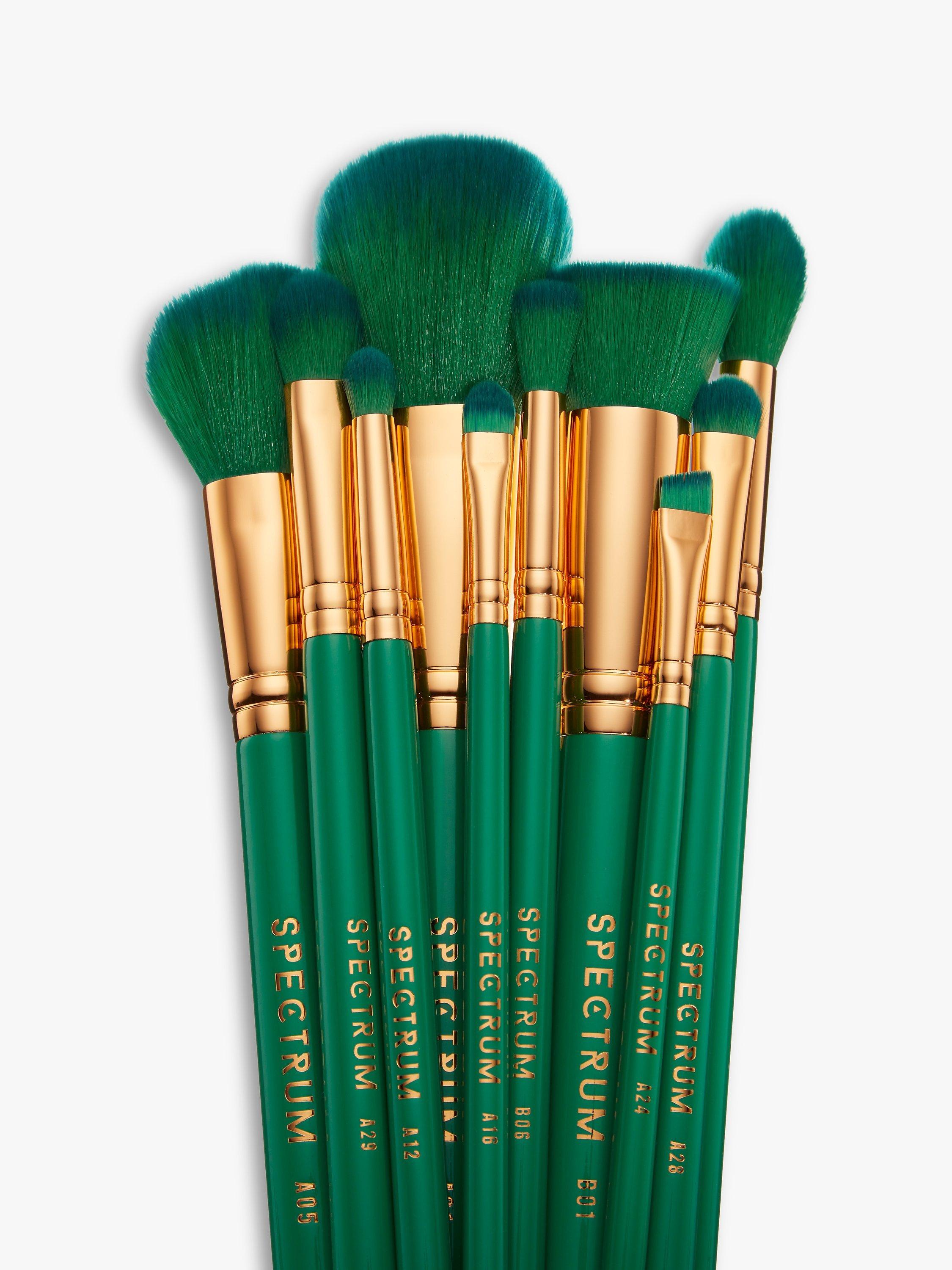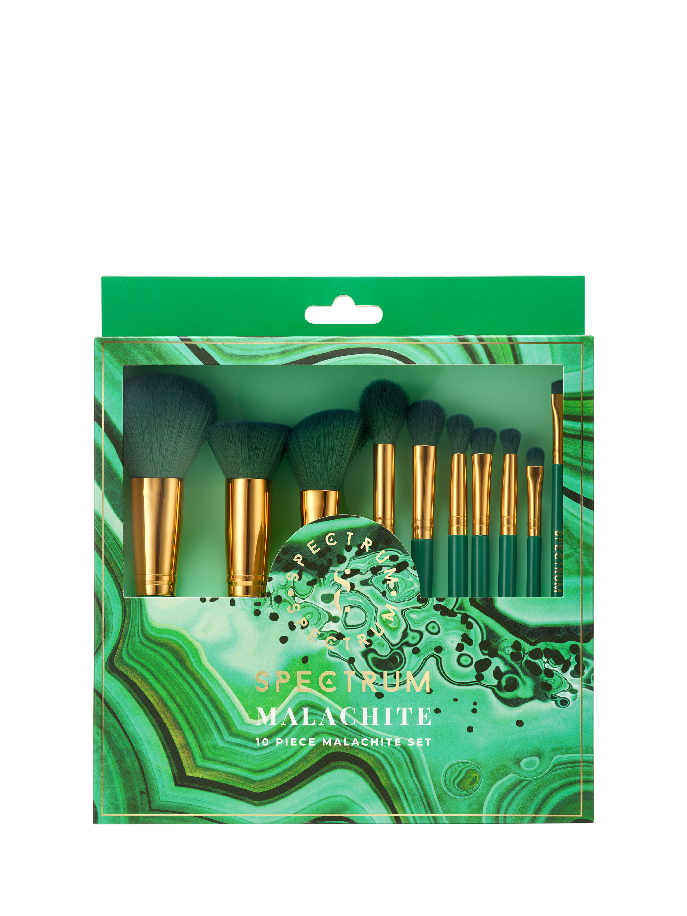 The Malachite 10-piece set combines emerald green jewel tones with luxe gold detailing, to deliver a gorgeous green makeup brush set that will add a touch of glamour to any makeup bag.