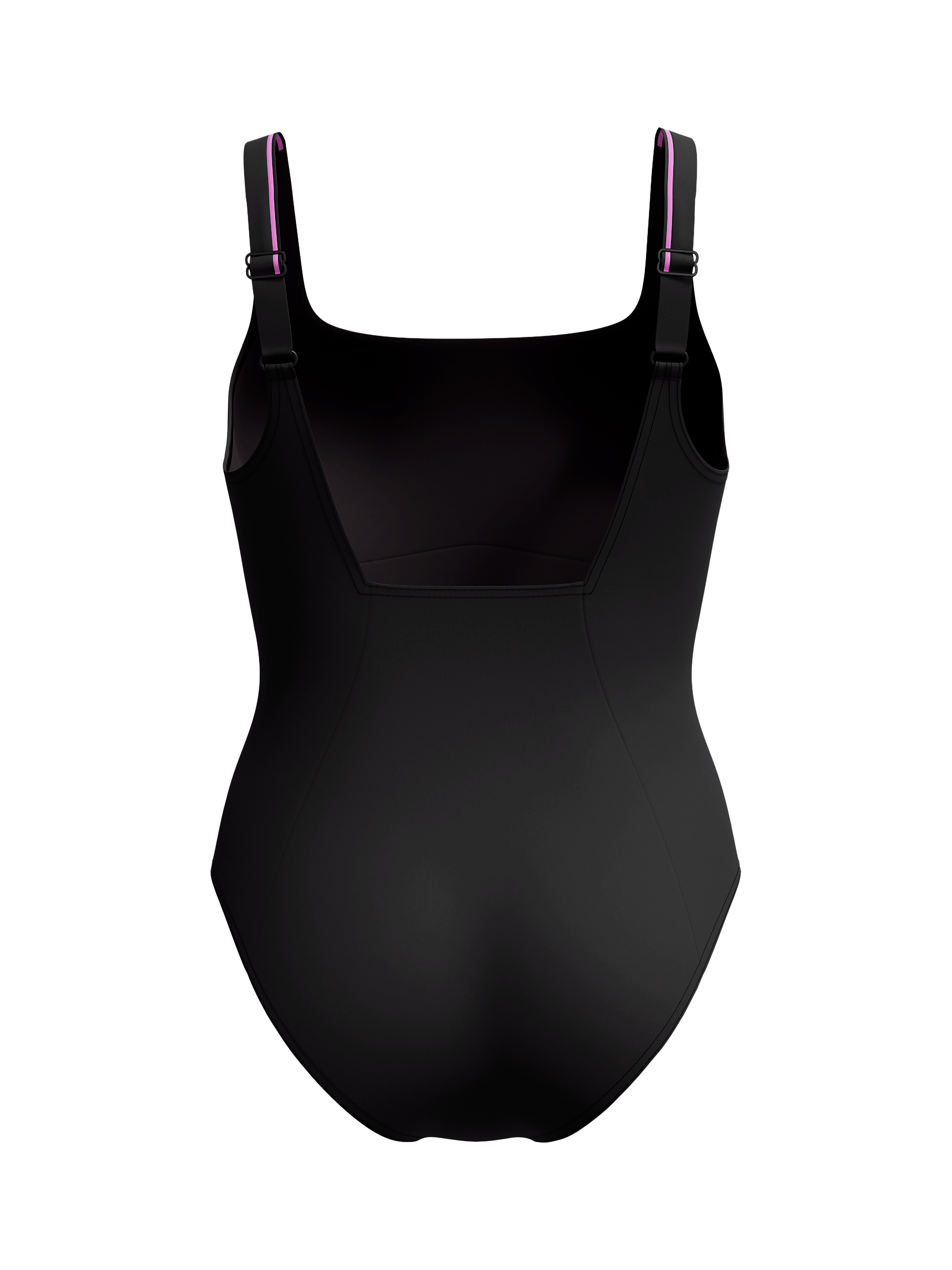 Part of Speedo's fitness shaping range. The sporty Contour Eclipse swimsuit pairs a square neckline with contrasting underband detail to draw the eye upwards and flatter your shape. Comfy SHAPE COMPREX fabric delivers all-over shaping, whilst supportive seams and shaping fabric offer medium bust support. Designed with chlorine-resistant LYCRA® XTRA LIFE™.