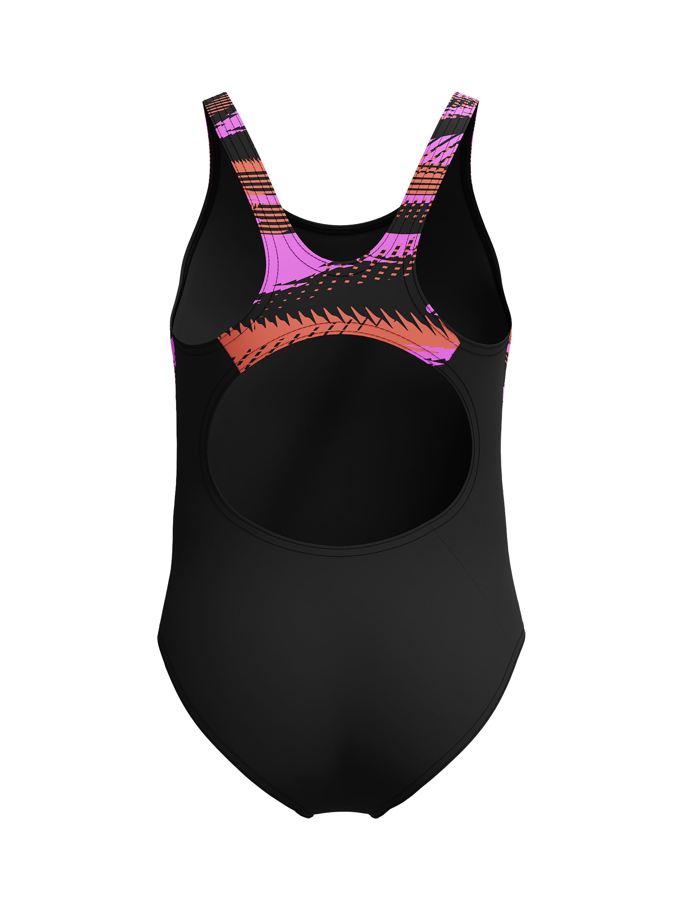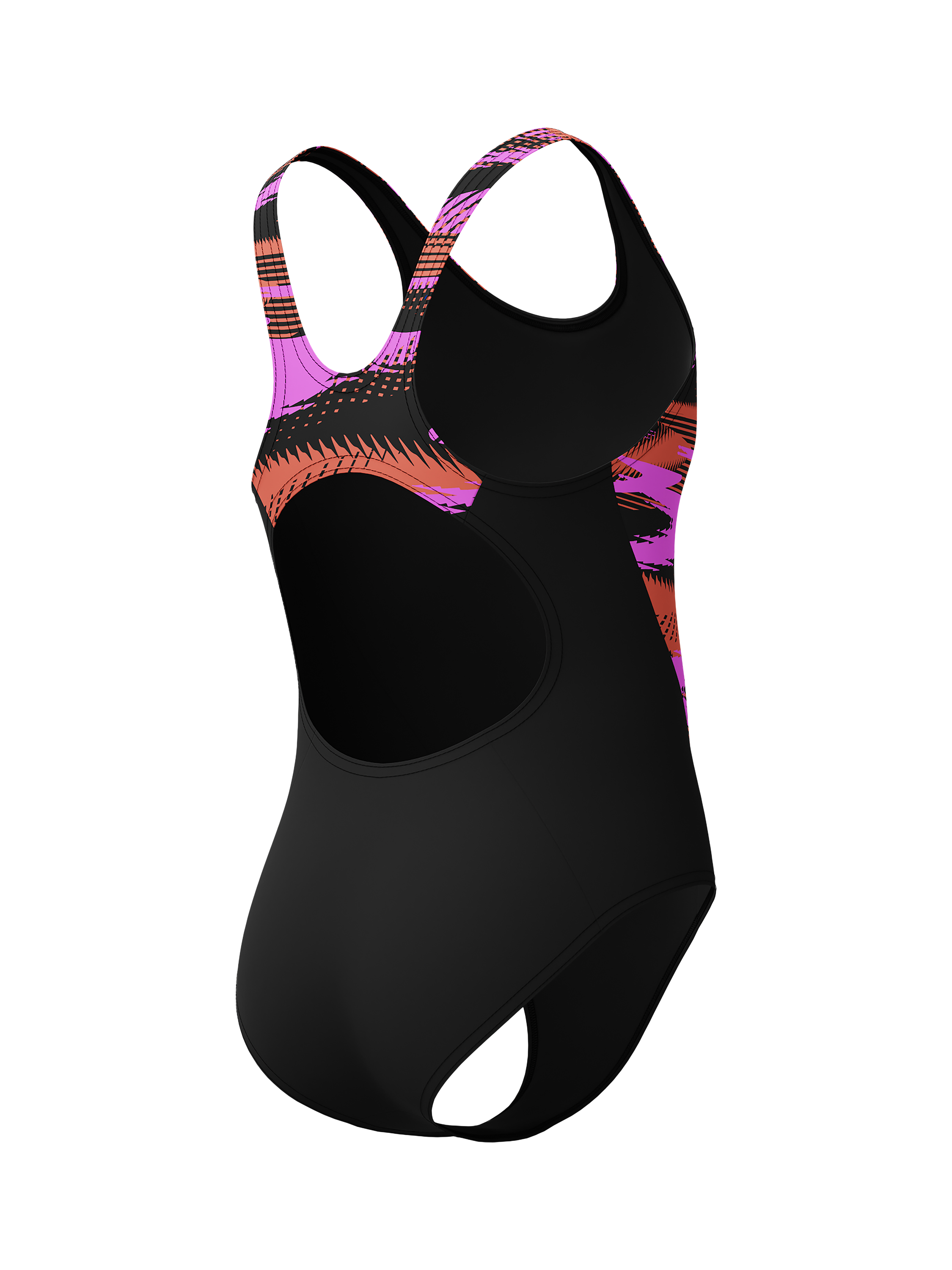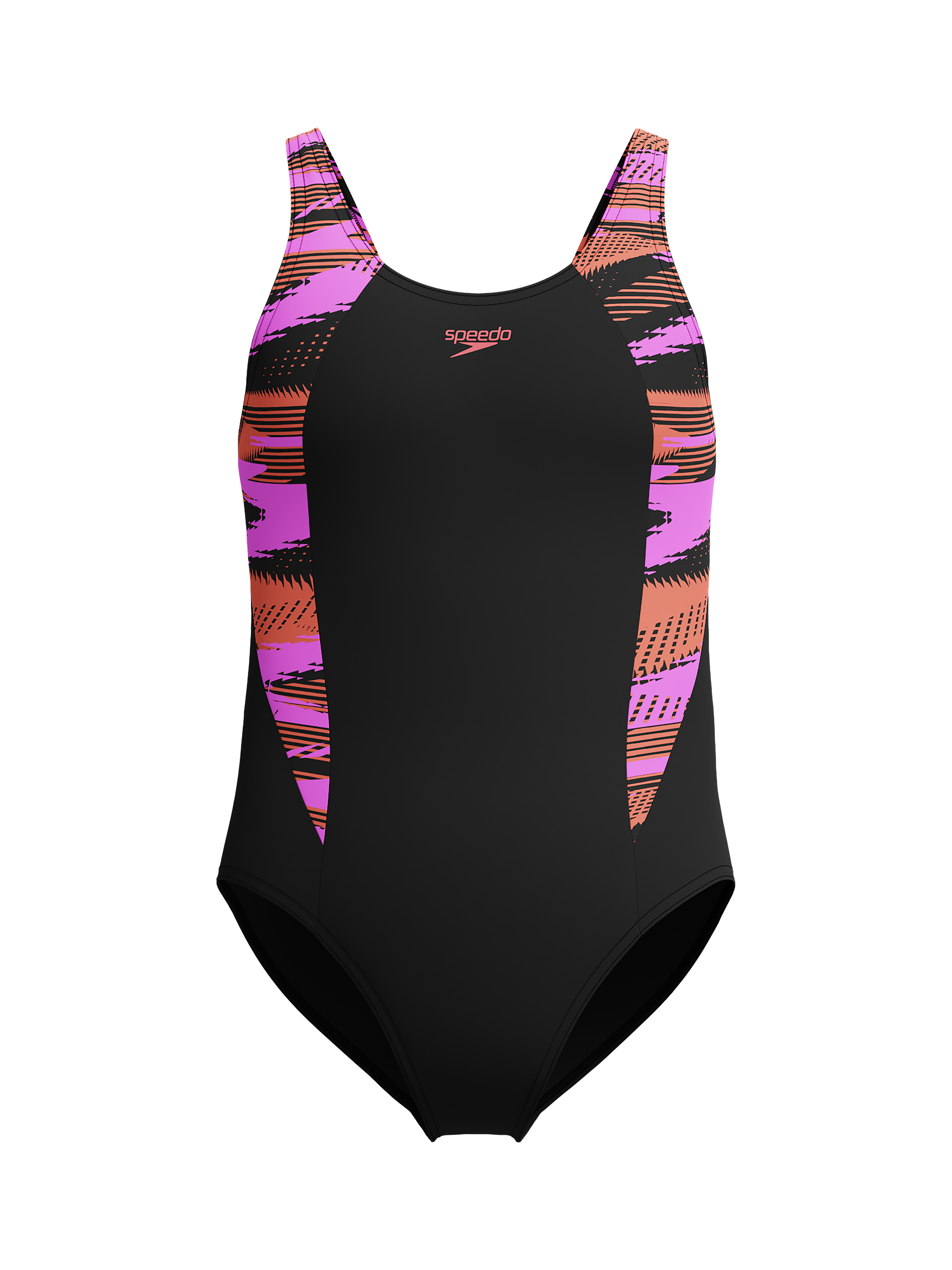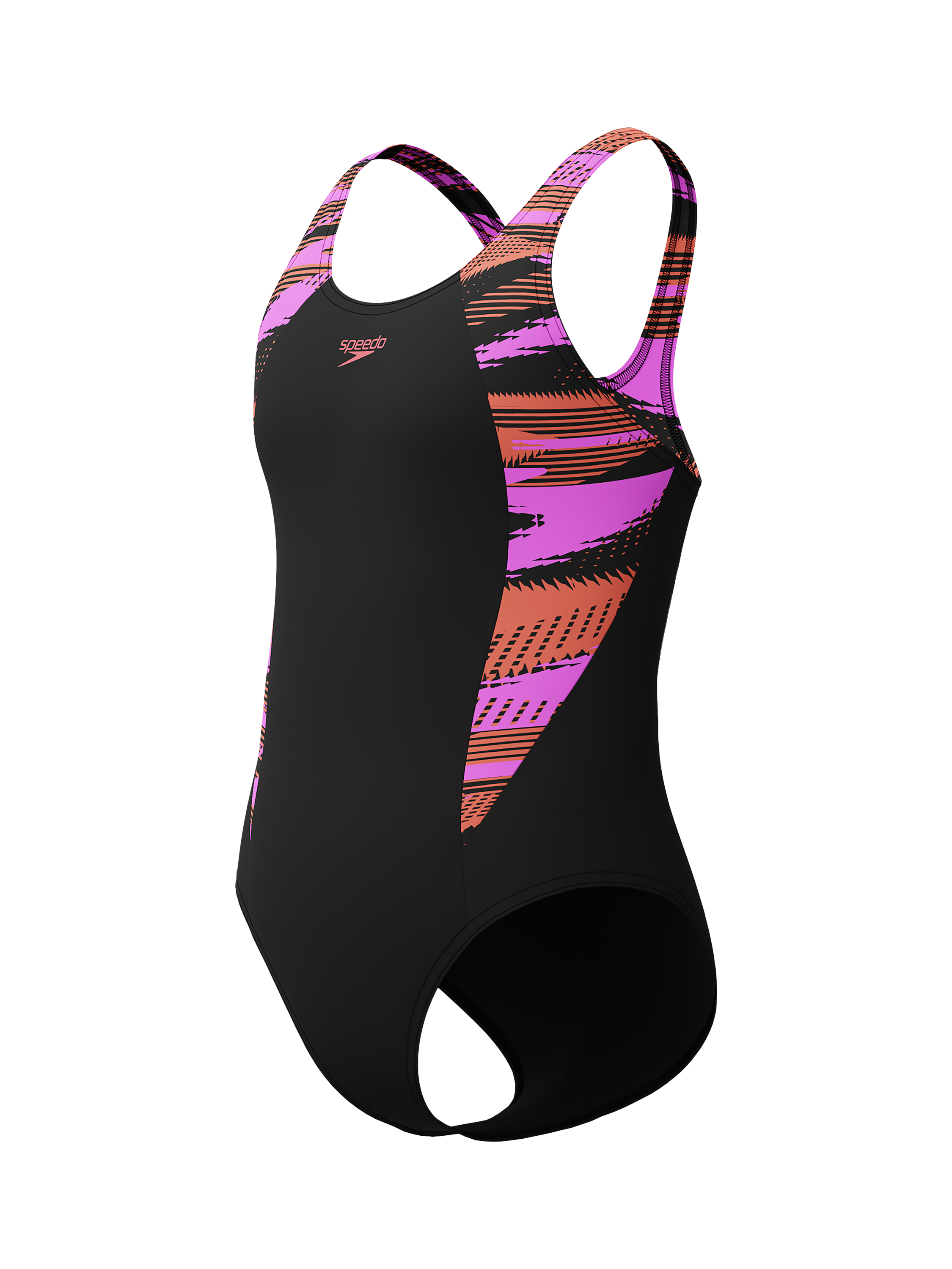 Keep energy levels high wearing this junior muscle-back swimsuit, featuring colourful splices of the Speedo's HyperBoom print. Flexibility and freedom of movement come as standard with the sporty muscleback design. Cut from pilling-resistant Enduraflex fabric for better shape retention and higher chlorine resistance.