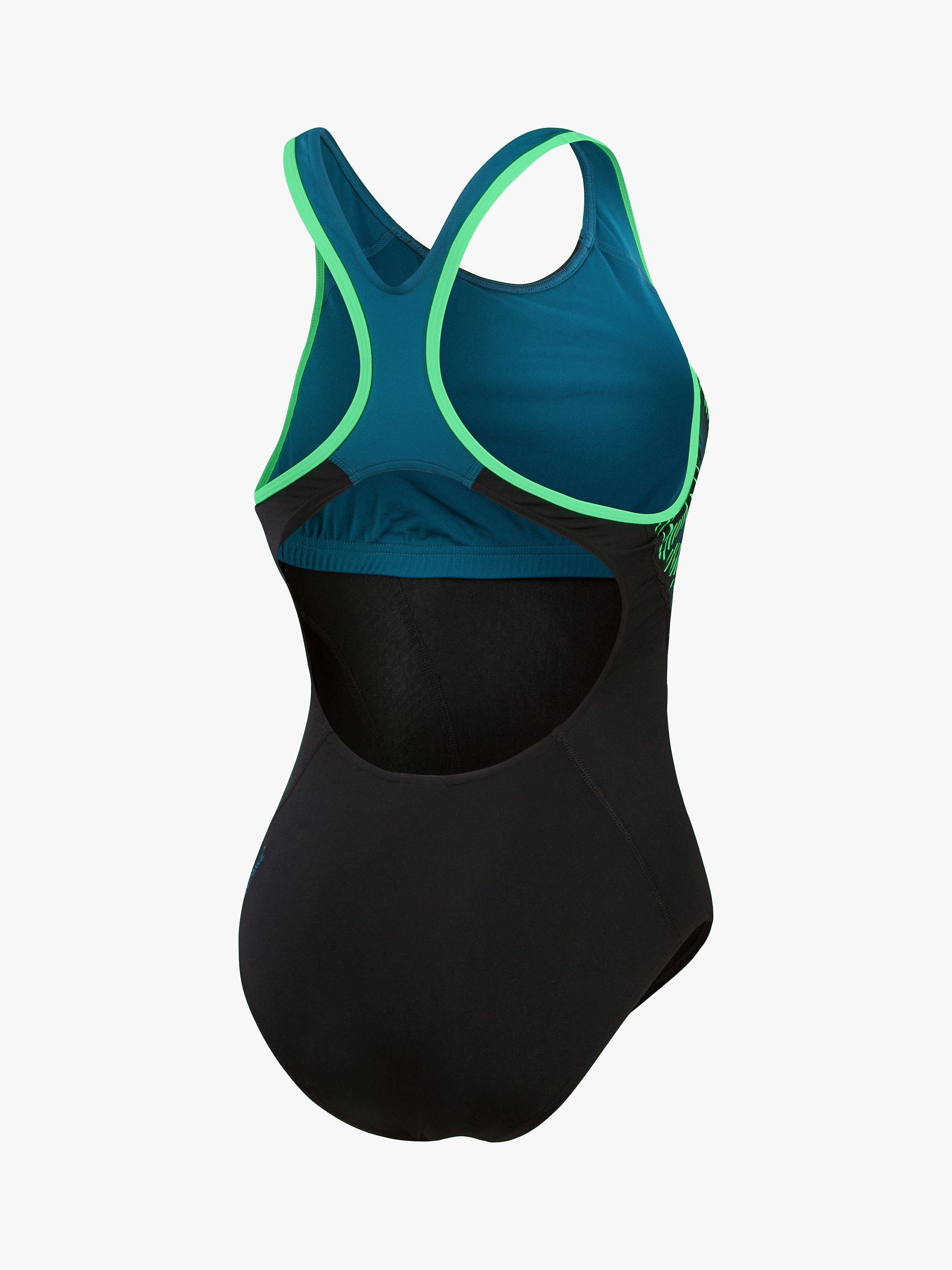 Stylish performance swimwear. Power through your workout wearing the flattering black Laneback swimsuit featuring contrasting straps and an abstract teal and green graphic panel print. The Laneback design provides flexibility and freedom of movement so you can swim in comfort.