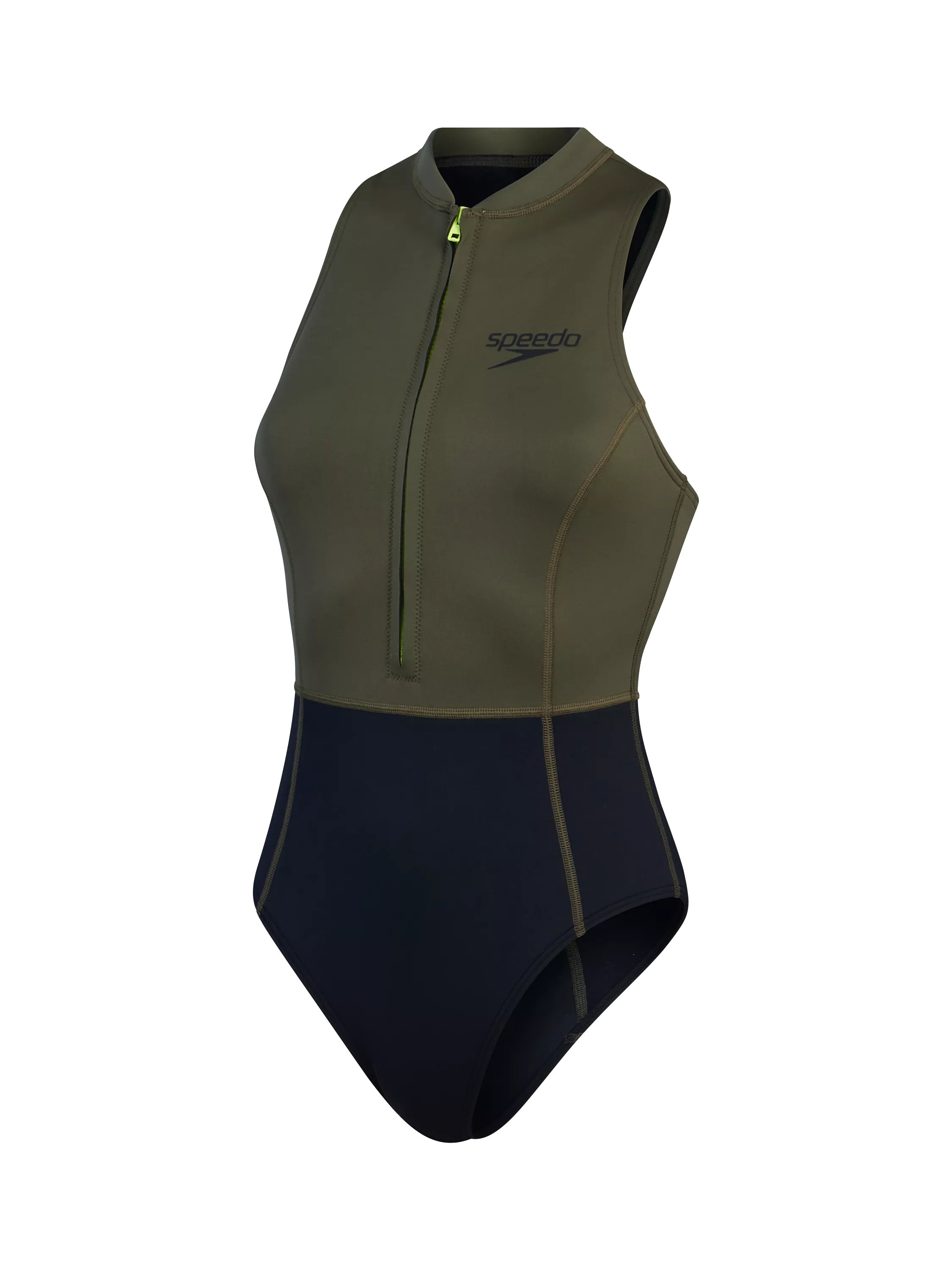 Stay warm during your coldwater swim wearing this high-neck Sleeveless Thermal Swimsuit. Lightweight, petroleum-free chloroprene rubber provides neoprene-level warmth in frosty temperatures and stretches to fit like a second skin. The racerback design allows maximum shoulder movement. Flatlock seams banish chafe. A Hyper Yellow zip boosts your visibility underwater.