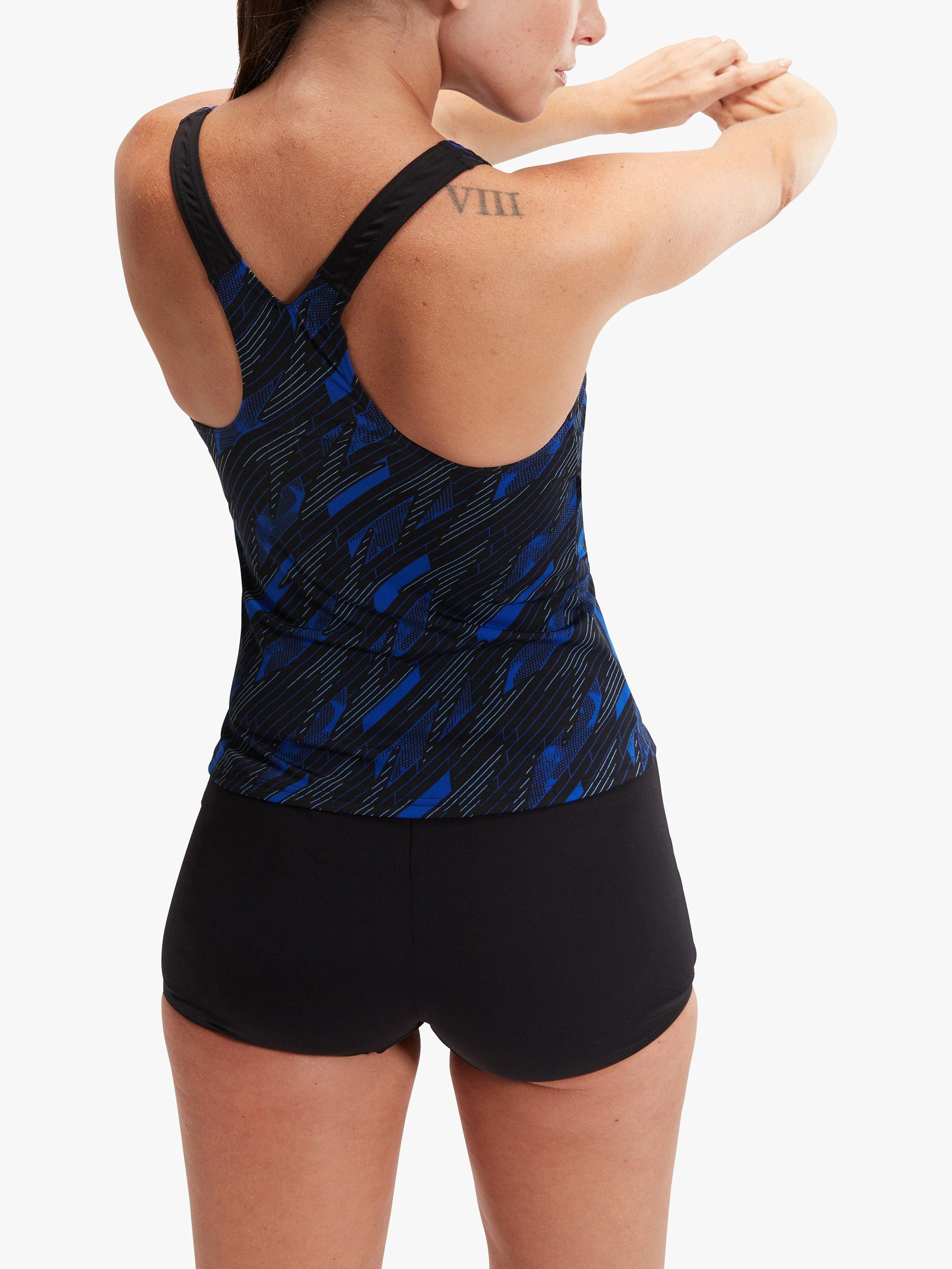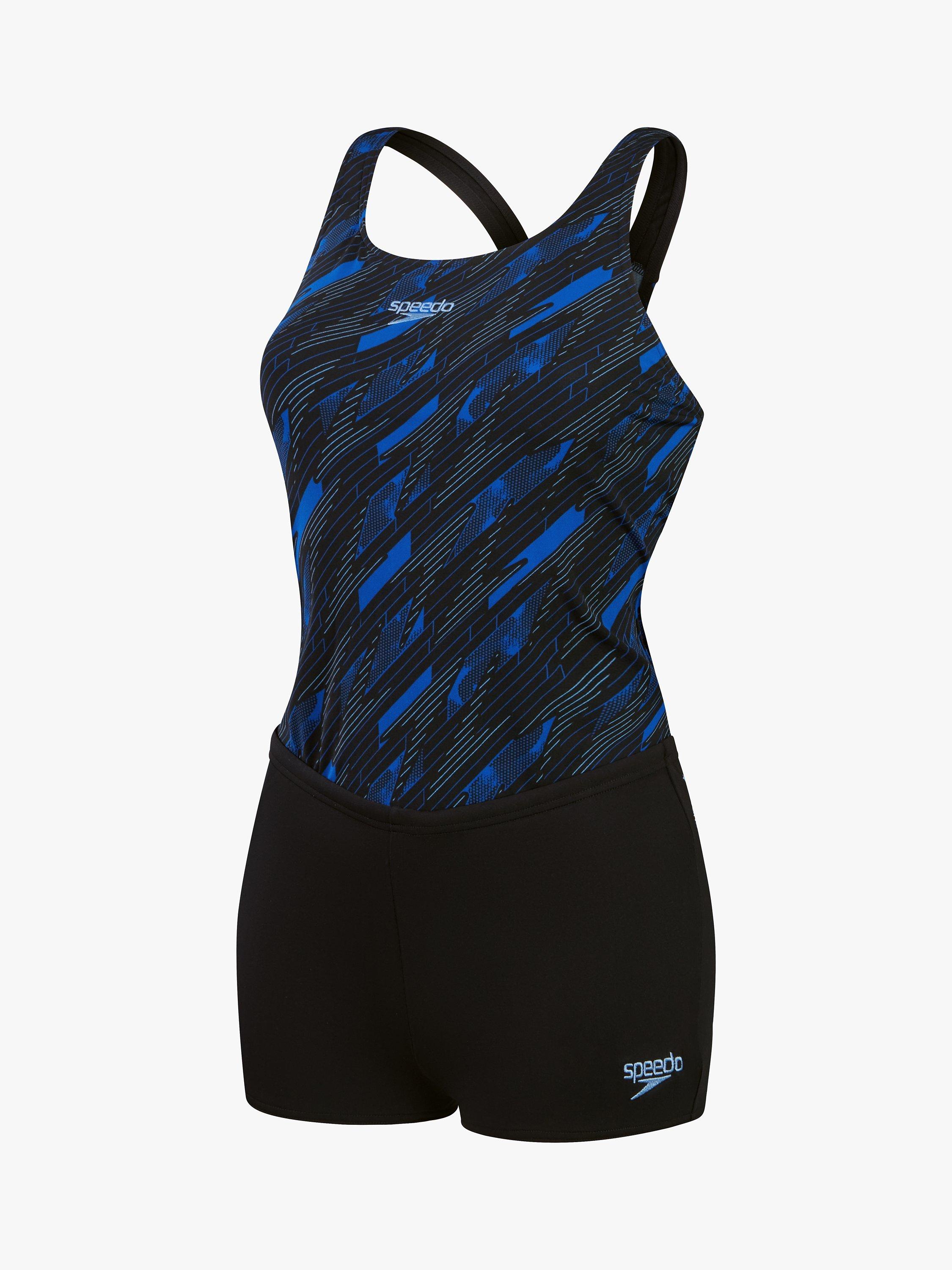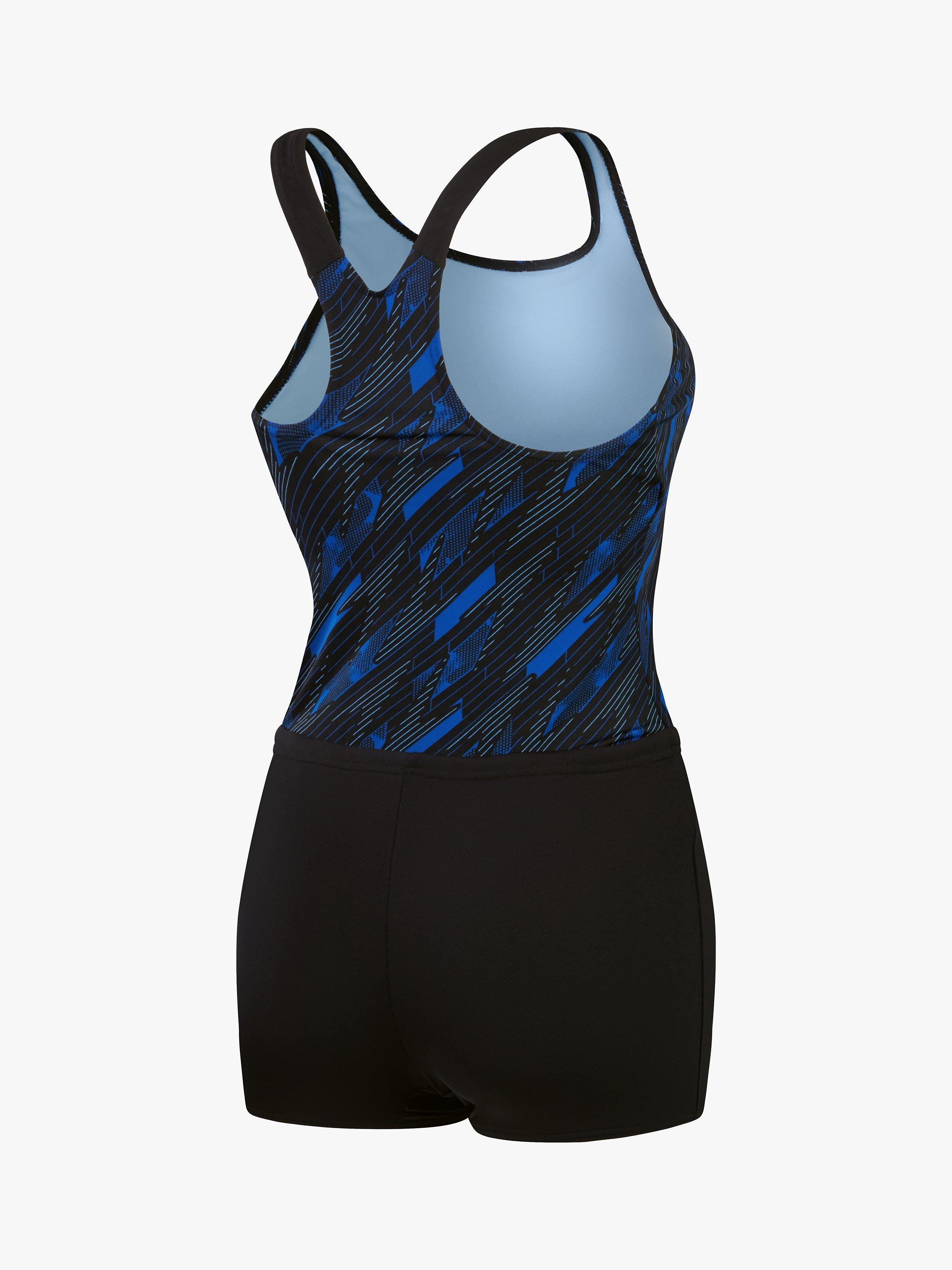 Make a statement in a HyperBoom logo print, paying homage to Speedo's legacy graphics. The racerback design aids shoulder movement during your workout, while the bust shelf liner provides light support. The boyleg short offers more coverage than a standard brief and includes an internal drawcord for a secure fit.
