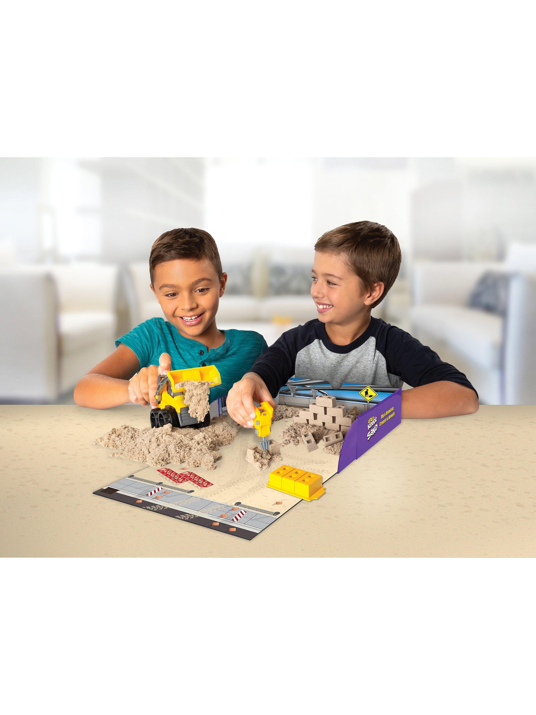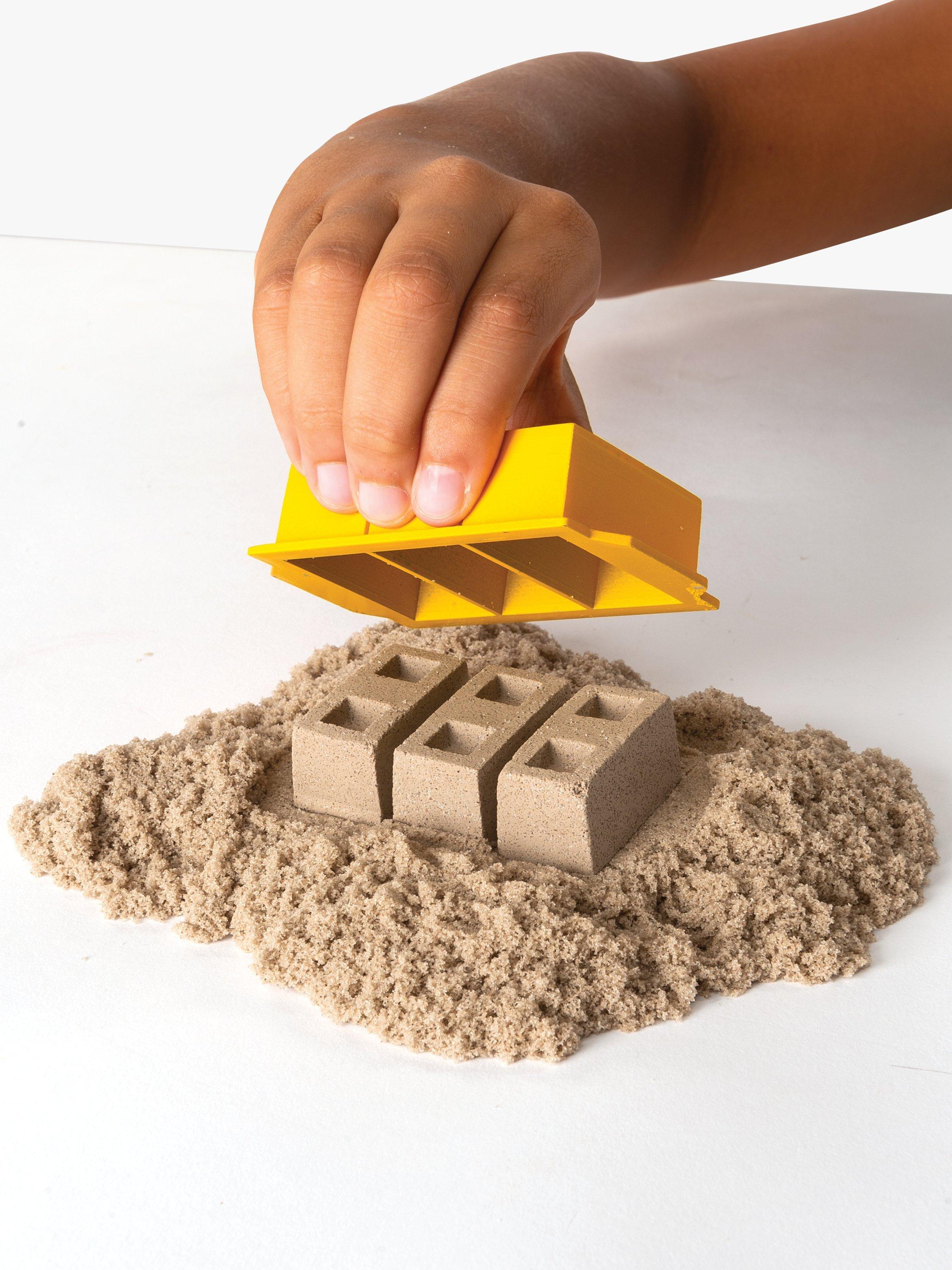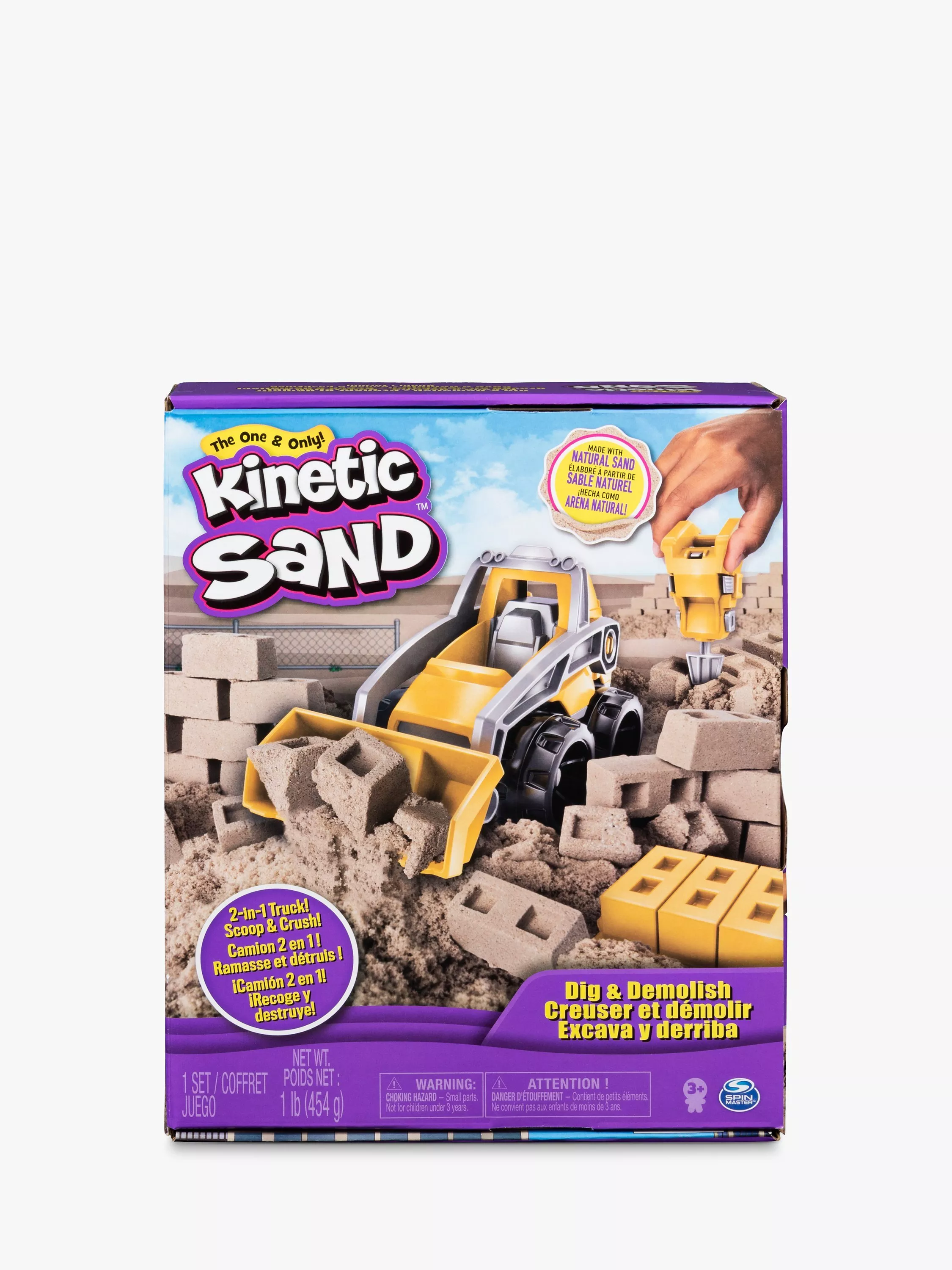 Build, dig and crush with the Kinetic Sand Dig & Demolish playset. This themed sand kit includes everything you need for real construction fun: 453 g of brown Kinetic Sand, a brick mould and a 2-in-1 construction truck. Kinetic Sand is the original magical, mouldable and mesmerising sand. It flows through your hands and never dries out so you can play again and again. Build a brick wall using the brick mould and clip the jackhammer attachment onto the truck. Crush the wall and start all over. Switch the attachments on the truck and scoop the Kinetic Sand to move it around the construction site. The Dig & Demolish box even opens up into an enclosed construction play space. When you’re finished playing, pack everything away inside the box until next time for easy storage. Let Kinetic Sand flow through your hands – it’s so satisfying, you won’t be able to put it down. The perfect gift for kids, Kinetic Sand is made from natural sand and is wheat, gluten and casein free. Create with the Kinetic Sand Dig & Demolish Set again and again and have hours of construction fun.