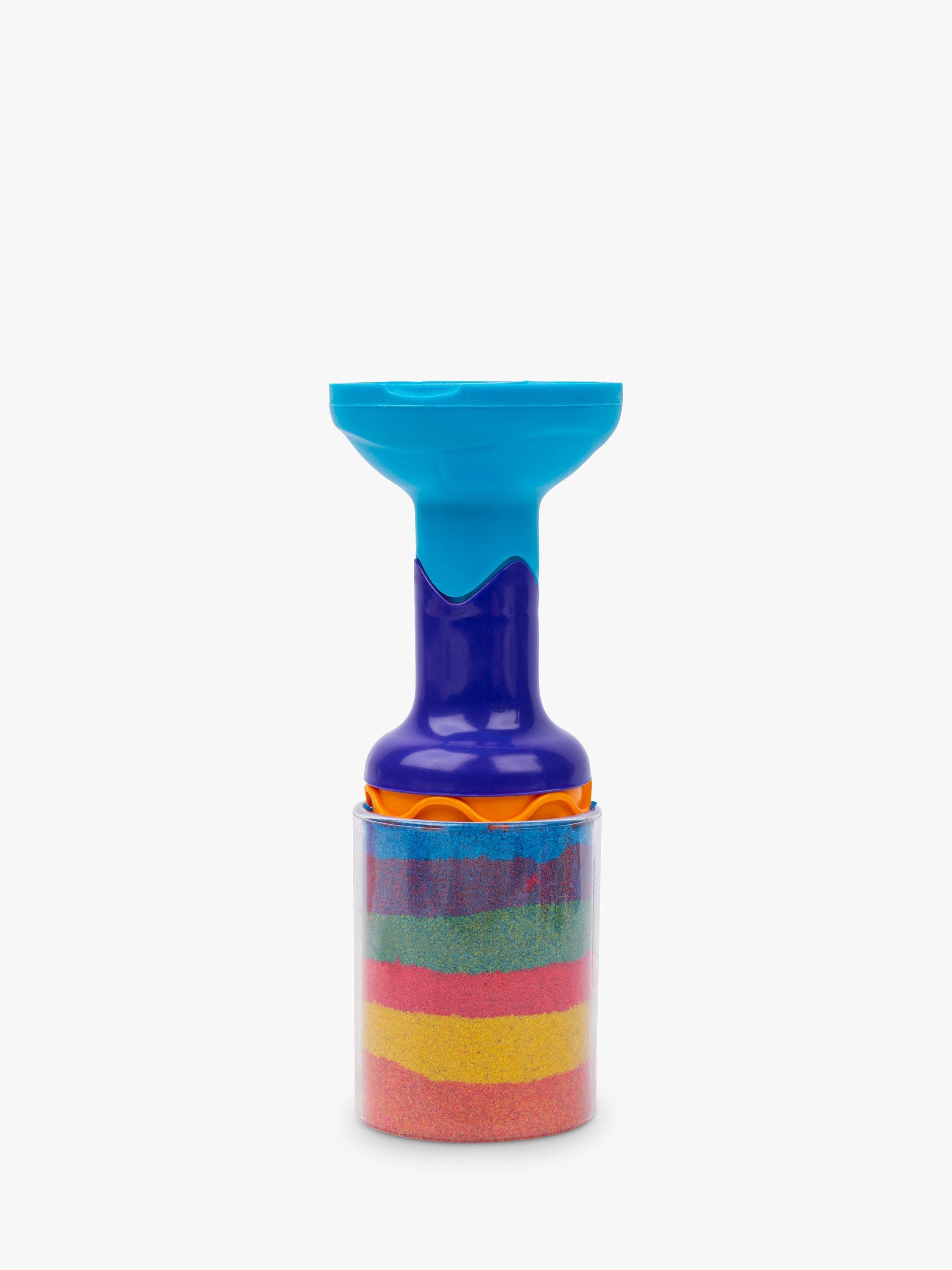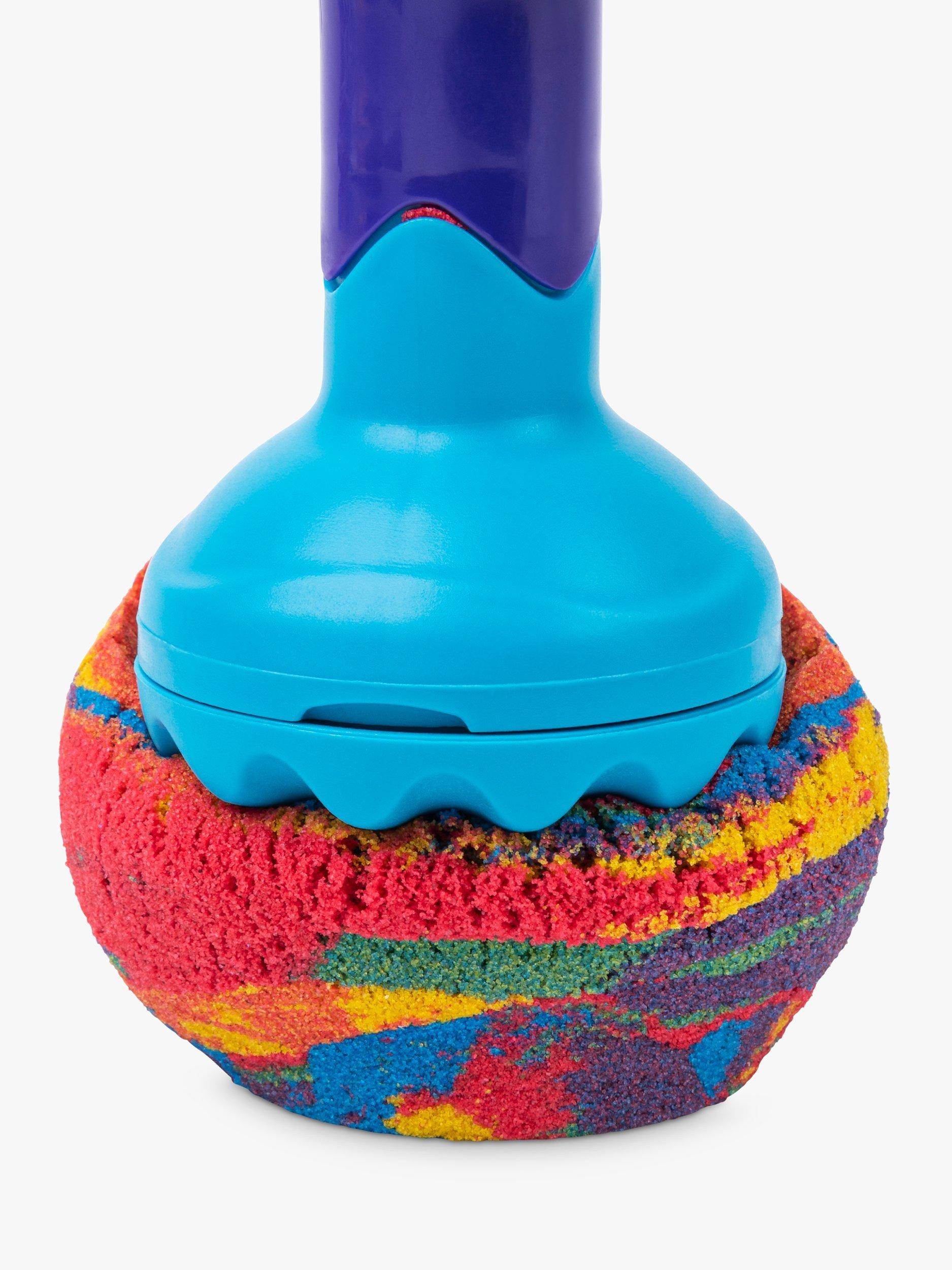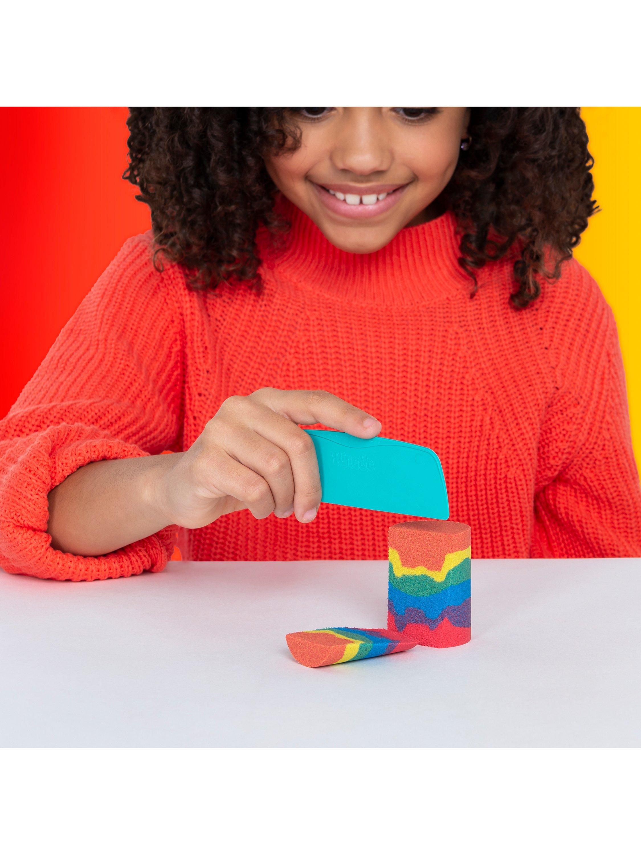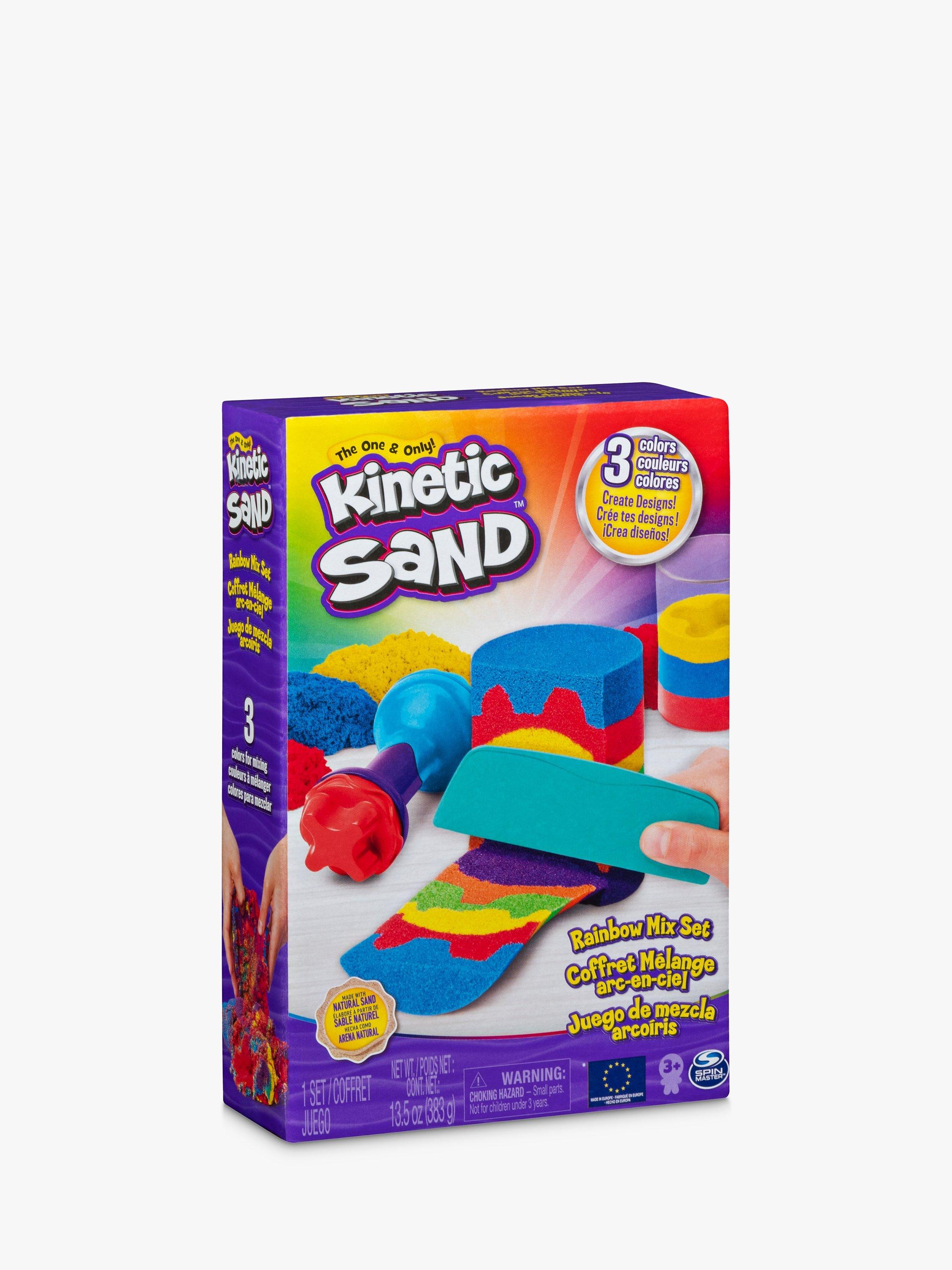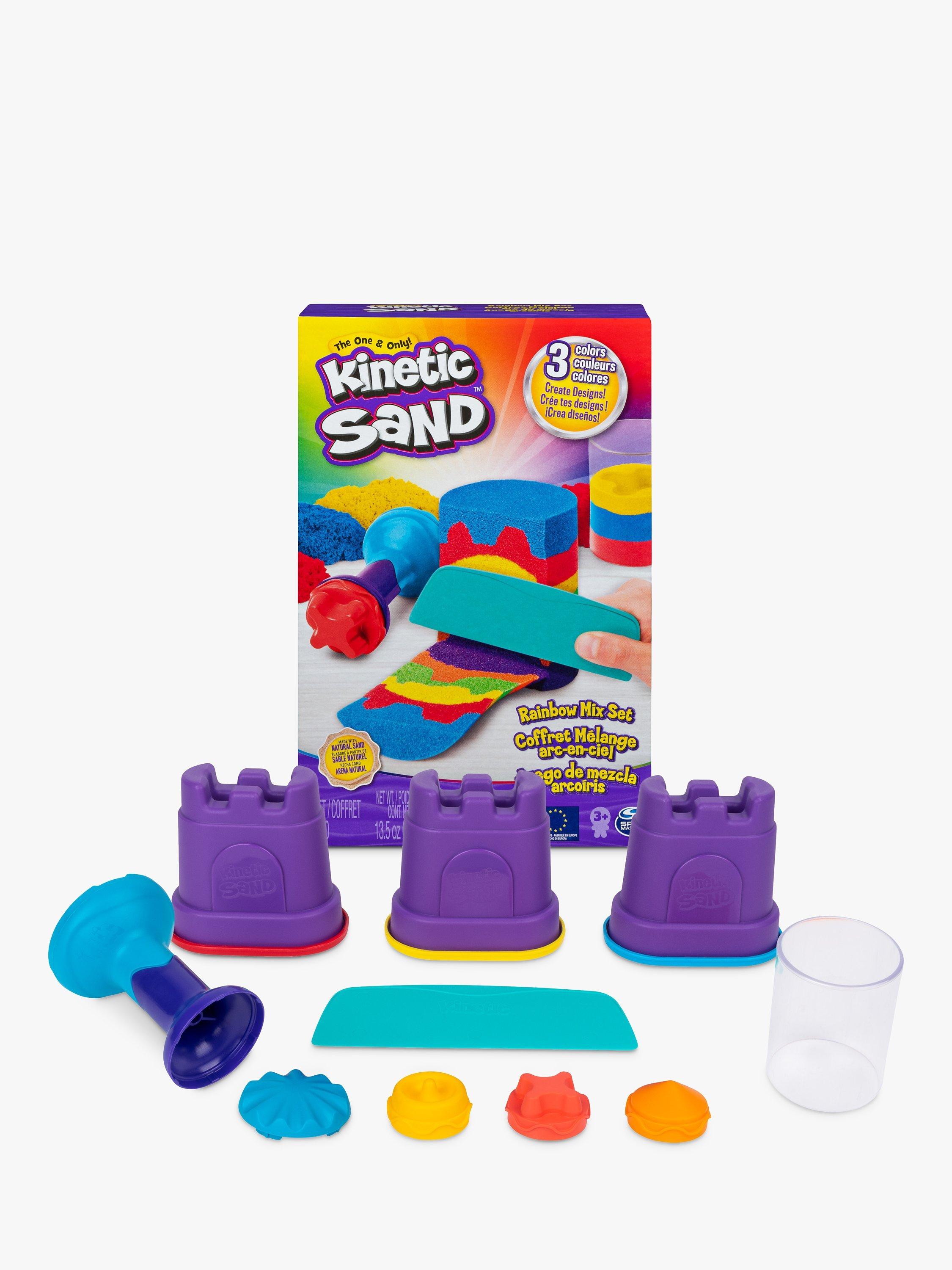 Create mesmerising rainbow effects with the Kinetic Sand Rainbow Mix Set! This set includes everything you need to mix and create the colours of the rainbow! With six different tools and three primary colours of Kinetic Sand (127g each of red, yellow and blue) in Castle Containers, there are so many ways to create! Kinetic Sand is the original mesmerising sand that flows through your hands and never dries out, so you can play again and again. Create perfectly-sized portions of Kinetic Sand to help you easily mix together the colours of the rainbow! Snap on one of the three stamps to the squisher tool, layer your sand segments into the stacker mould any way you want, and press down. Remove your creation from the mould to reveal your surprise patterned creation! Slice and dice with the kid-friendly slicer; mix your rainbow creation together; mould colourful castles and create again and again! Let Kinetic Sand flow through your hands – it’s so satisfying, you won’t be able to put it down! Film your sandisfying rainbow creations and create your own videos to share. Create surprise rainbow creations every time with the Kinetic Sand Rainbow Mix Set!