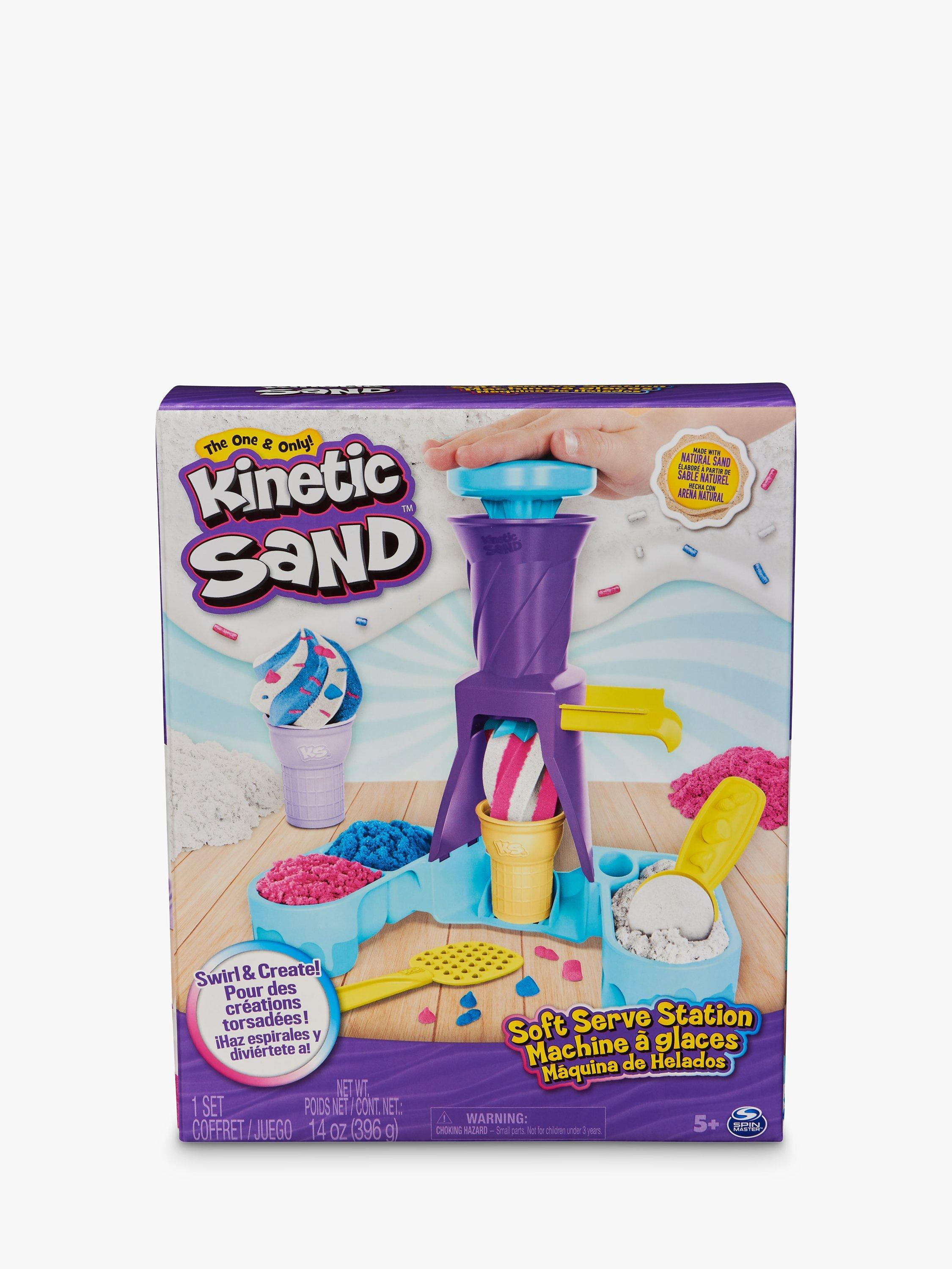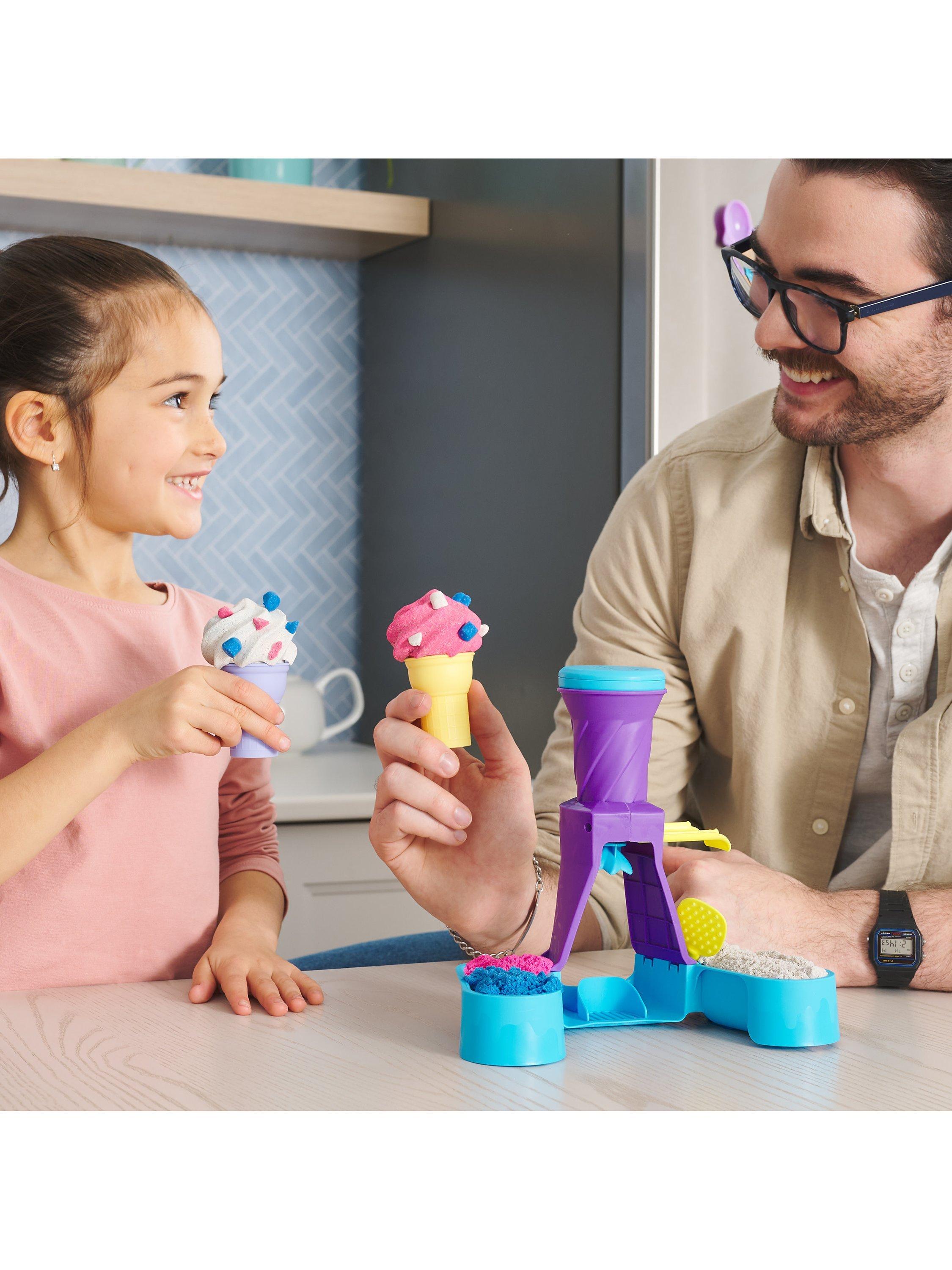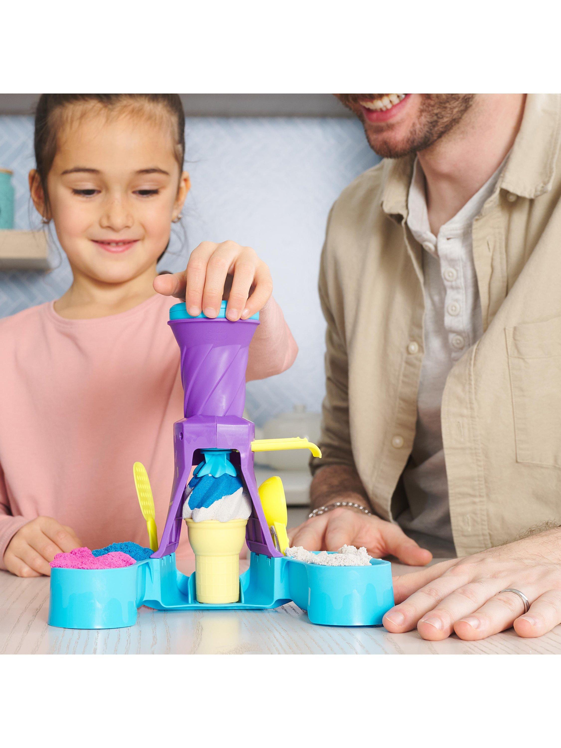Swirl and create with the Kinetic Sand Soft Serve Station. For the first time, kids can swirl Kinetic Sand to mimic a soft-serve ice-cream experience like they’ve seen in the real world. With 396g of blue, pink and white Kinetic Sand, two ice-cream cones, and tools like a sprinkle grater and a scoop with sweet treat moulds, your child can serve up endless ice-cream possibilities. Scoop classic cones or create the ultimate swirl. Flow sand into the station, push down to swirl Kinetic Sand into the cone then remove to decorate. Add some sprinkles and extra toppings, then squish and create all over again. The One and Only Kinetic Sand is made from natural sand that sticks to itself for easy clean-up. It never dries out. Let it flow through your hands — it’s so satisfying, you won’t be able to put it down. Kinetic Sand is an exciting alternative to arts and crafts modelling clay and is a welcome addition to the craft table, sensory bin, kids’ activities time and Montessori toys. Kinetic Sand promotes fine motor skills and creativity through independent tactile play. Bring the ice-cream fun home with the Kinetic Sand Soft Serve Station.