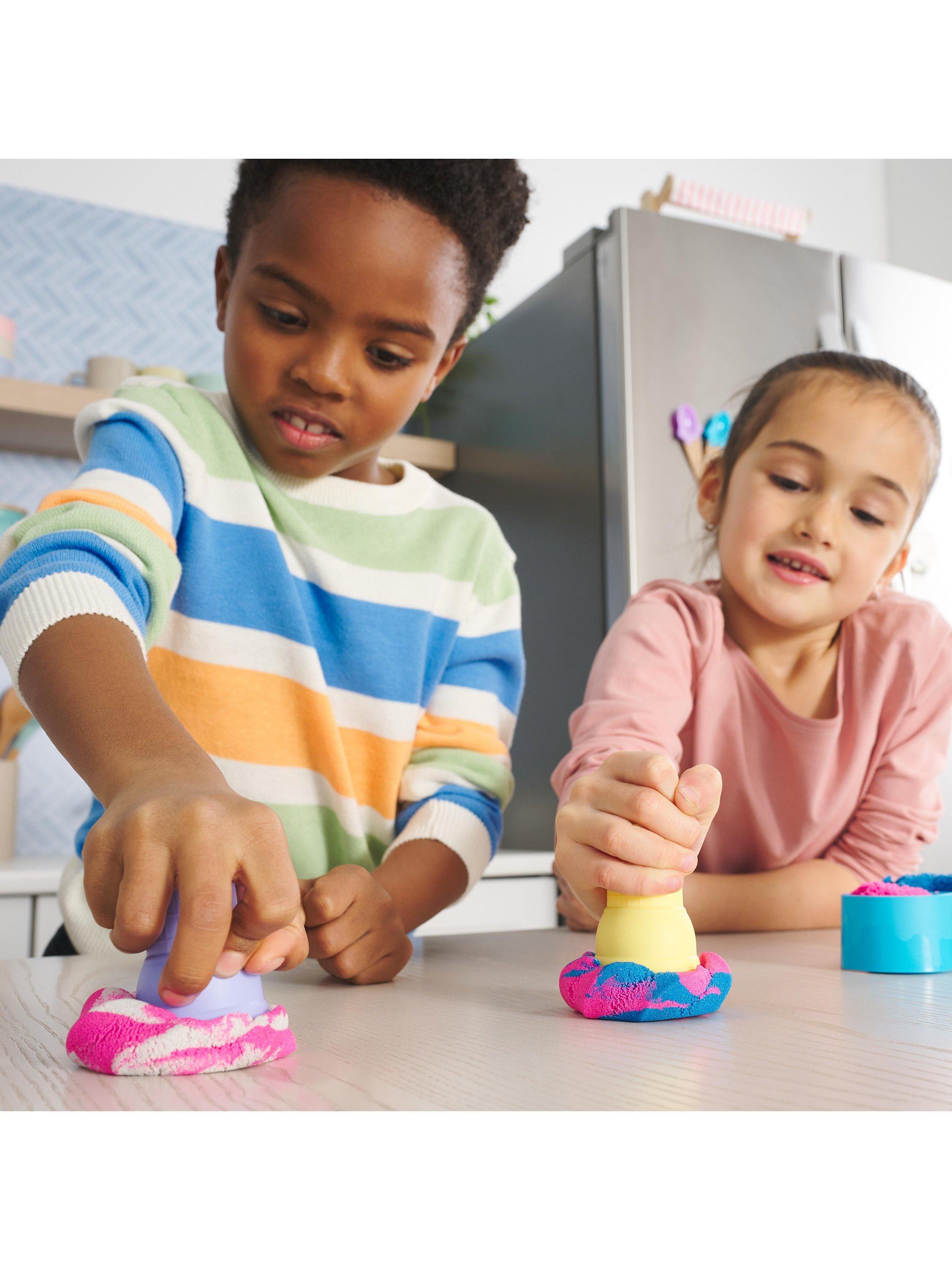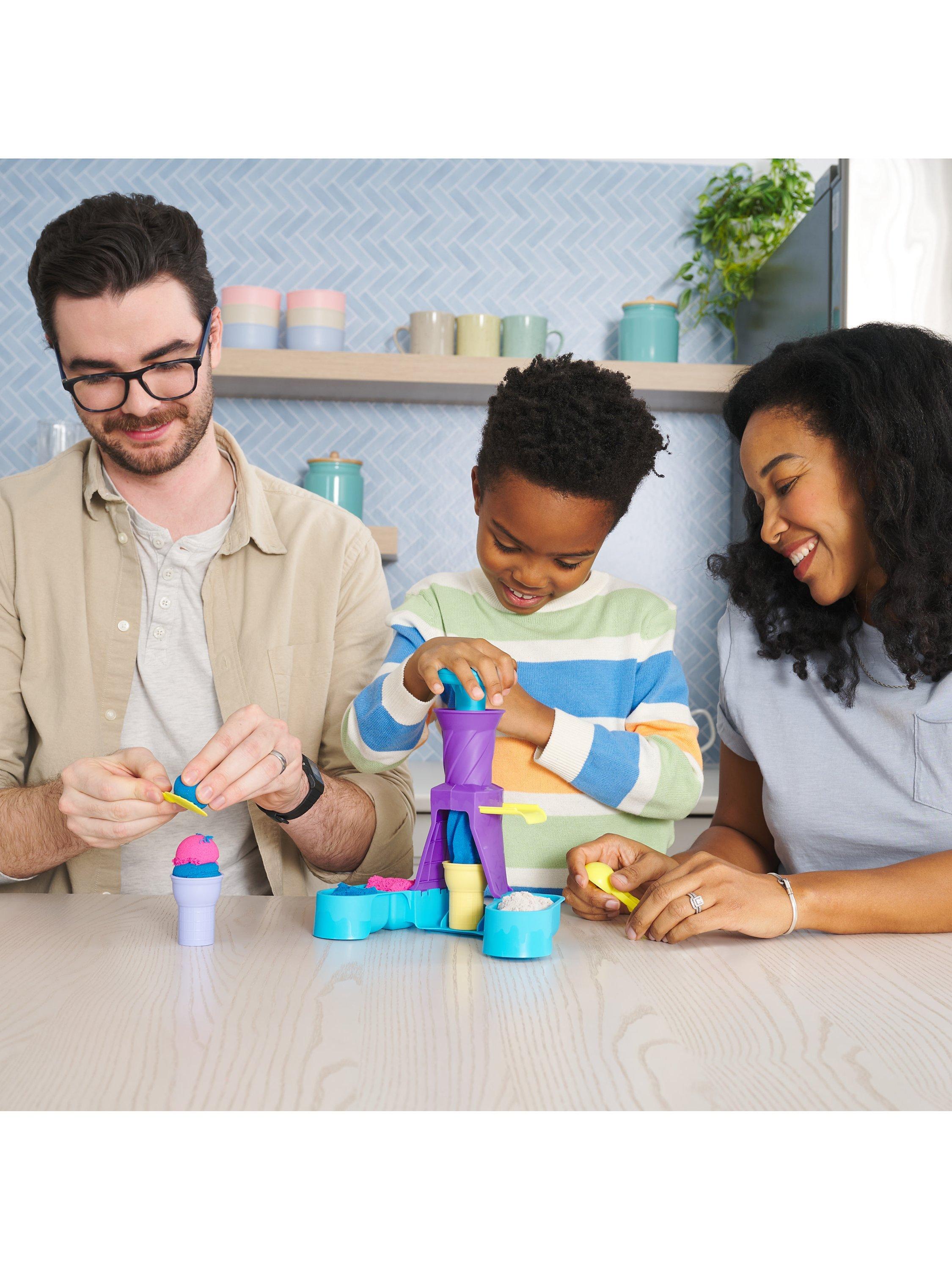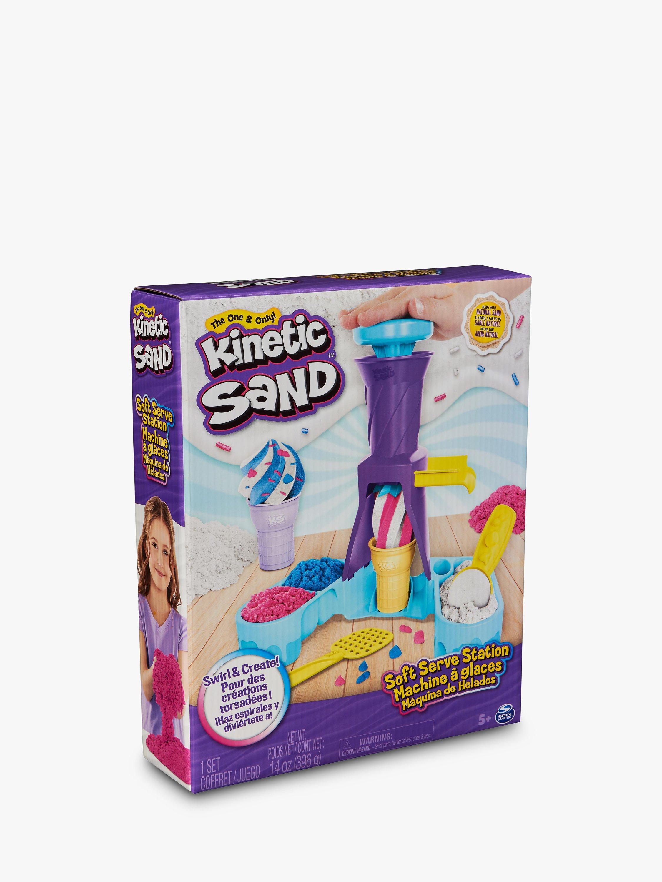 Swirl and create with the Kinetic Sand Soft Serve Station. For the first time, kids can swirl Kinetic Sand to mimic a soft-serve ice-cream experience like they’ve seen in the real world. With 396g of blue, pink and white Kinetic Sand, two ice-cream cones, and tools like a sprinkle grater and a scoop with sweet treat moulds, your child can serve up endless ice-cream possibilities. Scoop classic cones or create the ultimate swirl. Flow sand into the station, push down to swirl Kinetic Sand into the cone then remove to decorate. Add some sprinkles and extra toppings, then squish and create all over again. The One and Only Kinetic Sand is made from natural sand that sticks to itself for easy clean-up. It never dries out. Let it flow through your hands — it’s so satisfying, you won’t be able to put it down. Kinetic Sand is an exciting alternative to arts and crafts modelling clay and is a welcome addition to the craft table, sensory bin, kids’ activities time and Montessori toys. Kinetic Sand promotes fine motor skills and creativity through independent tactile play. Bring the ice-cream fun home with the Kinetic Sand Soft Serve Station.