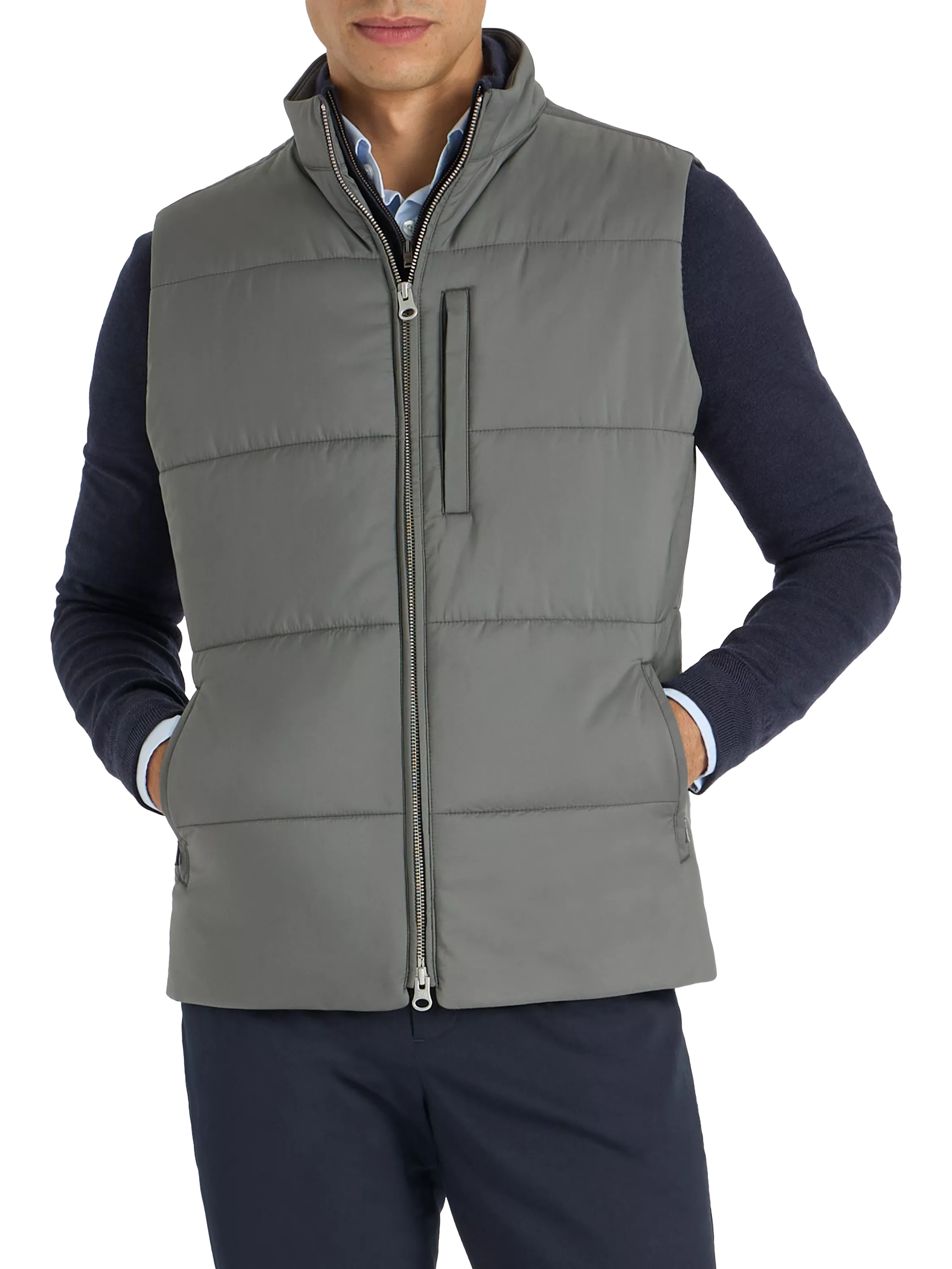 This piece features a Japanese-milled, soft-touch technical weave with 3M Thinsulate™ wadding (Type G) in the quilt. It regulates temperature without adding unnecessary bulk and benefits from a convenient two-way zip-fastened front. Practical outer pockets, a zip-fastened chest slot and an internal compartment also come together to provide ample storage.