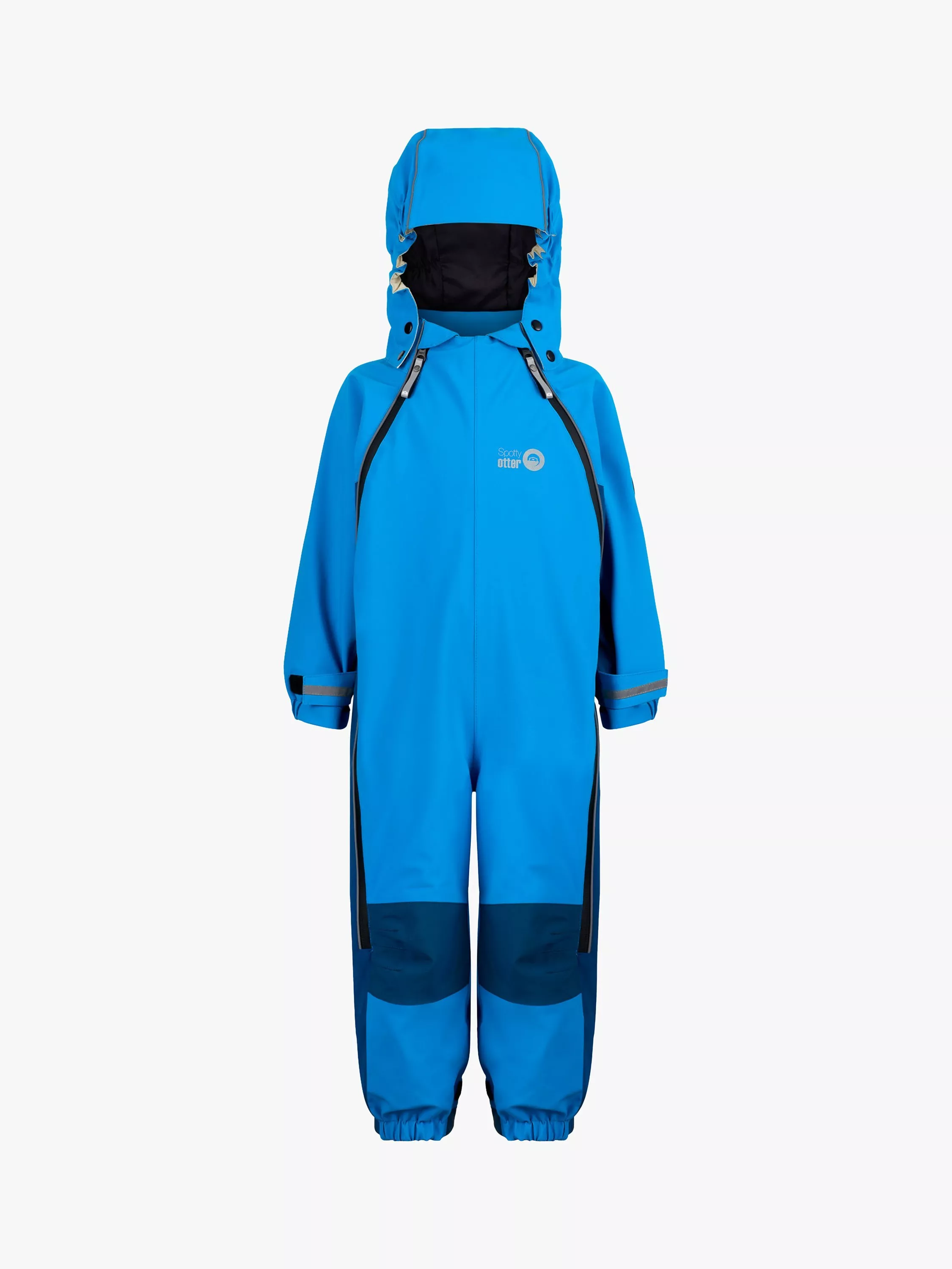 The only difficulty you'll find popping on this consummately waterproof rain suit is getting your little ones to stay still as they will be keen to get out and splash around. That's why Spotty Otter gave it easy pull, long length, water-repellent zips, from knees to shoulders, and super smooth Polyamide slip-on lining. So your Ottertex® 10000 waterproof, windproof and breathable suit slips on over base layers or regular clothing, with water-repellent taped seams, a detachable peaked hood, elasticated cuffs and lots of reflective detail.